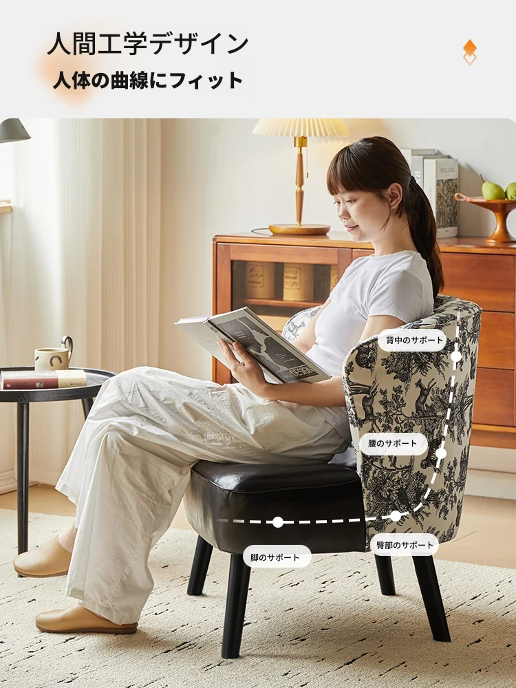 北欧スタイルの無垢材一人掛けソファチェア|軽やかなラグジュアリー感とモダンなシンプルデザイン|人気のクリエイティブな小型リビングに最適なリラックスチェア!
