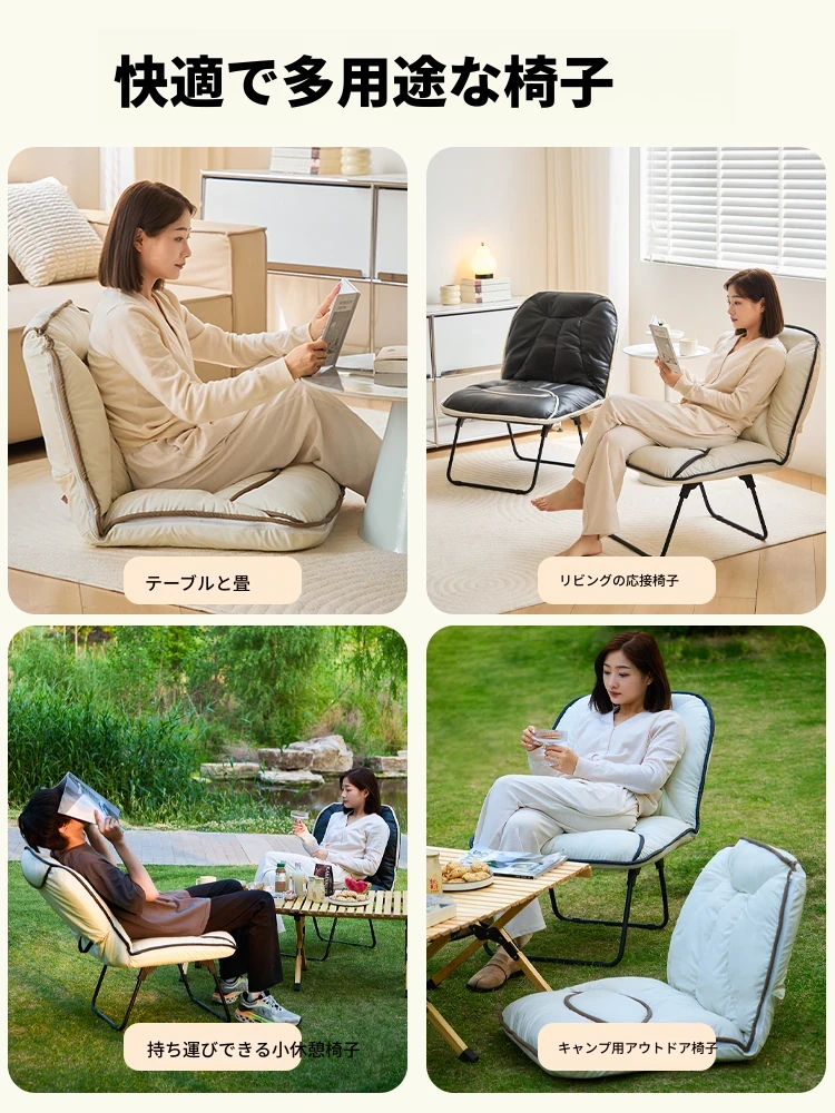リラックスできるソファチェア!寝転びながらくつろげる、シンプルでスタイリッシュな一人用ソファ。寝室やバルコニーにぴったりなタタミスタイルのデザインで、快適なひとときを提供します。あなたのリラックスタイムを格上げ!