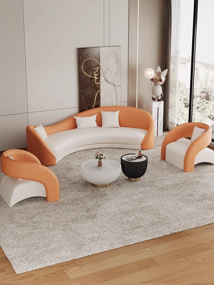 2025年新作!異形デザインのラグジュアリーソファ - 優雅な曲線で魅せる半円形の本革ソファ。モデルルームや美容院、ホテルロビー、リビングに最適!快適な空間を演出します。