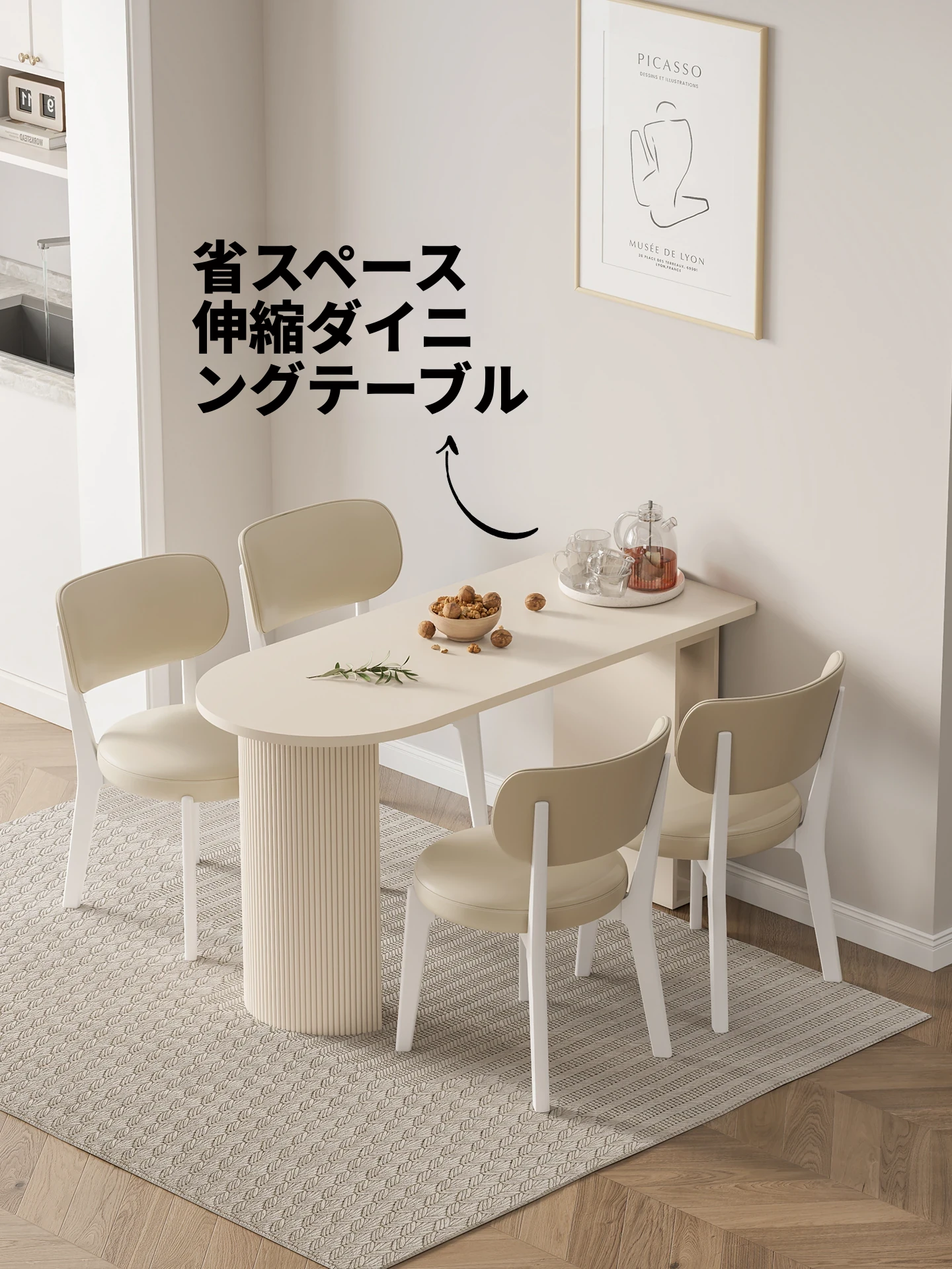 折りたたみ式ダイニングテーブル 小型住宅向け 拡張可能な楕円形・半月型クリーム風テーブル&チェアセット 省スペース 2025年新作