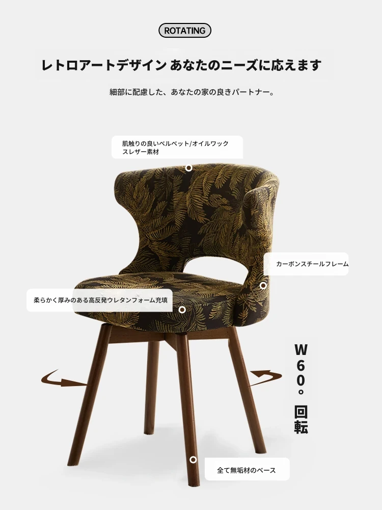 快適な座り心地!リビングや書斎に最適な回転式チェア。長時間の作業や読書にも最適。寝室や化粧台にもぴったりなデザイン!あなたの空間をもっと素敵にする一脚です。
