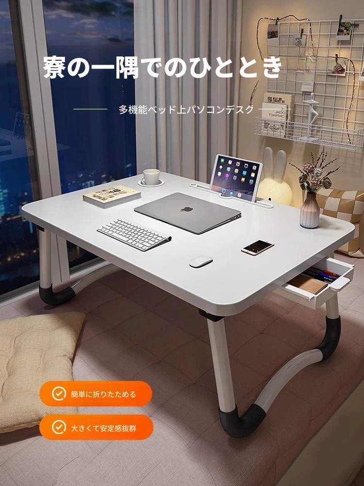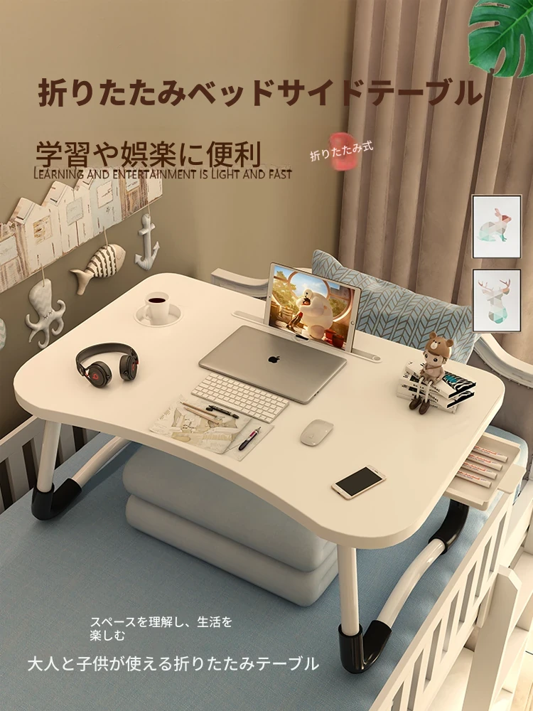 折りたたみ式ベッドサイドテーブル|学生寮や寝室に最適!ノートパソコンや勉強に便利なラップトップデスク|リラックスしながら作業できる快適な空間を提供!