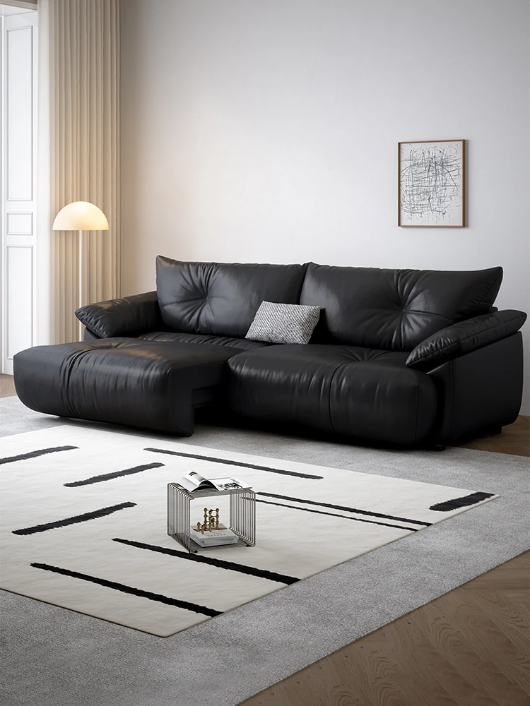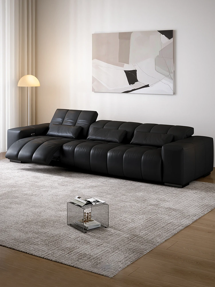 Luxury Black Sugar Cloud Electric Multifunctional Genuine Leather Sofa - Italian Minimalist Style, Black Top-Grain Cowhide Sofa Bed for Modern Living Rooms