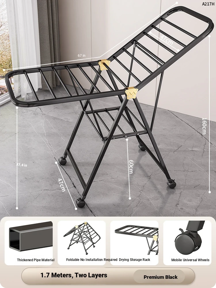 [No Installation + Universal Wheel] 66.93 in High Grade Black-Double Layer Drying