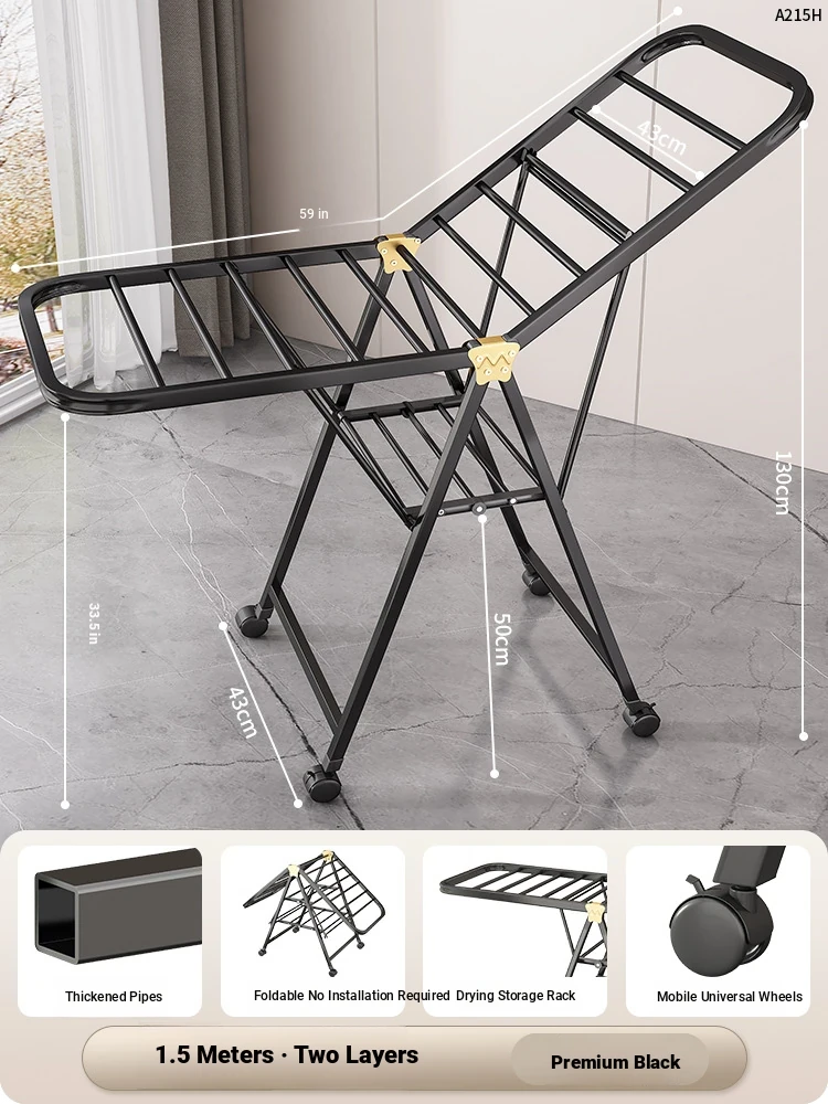 [No Installation + Universal Wheel] 59.06 in High Grade Black-Double Layer Drying