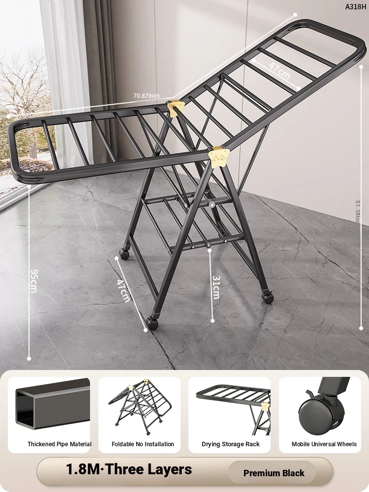 [No Installation + Universal Wheel] 70.87 in High Grade Black-Three Layers Drying