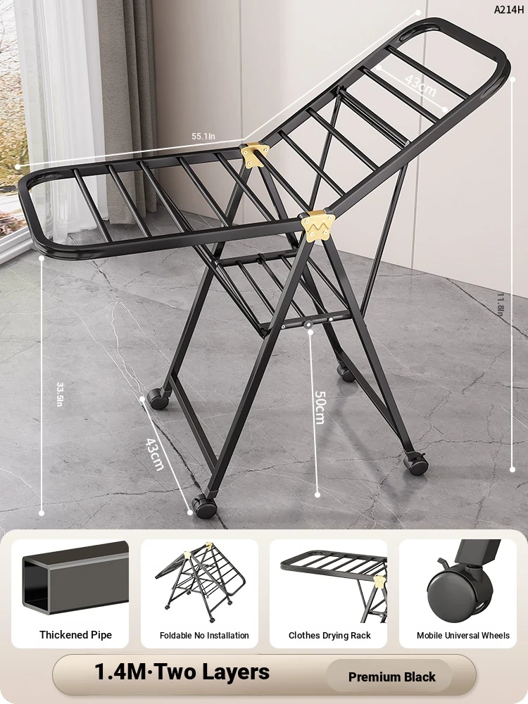 [No Installation + Universal Wheel] 55.12 in High Grade Black-Double Layer Drying
