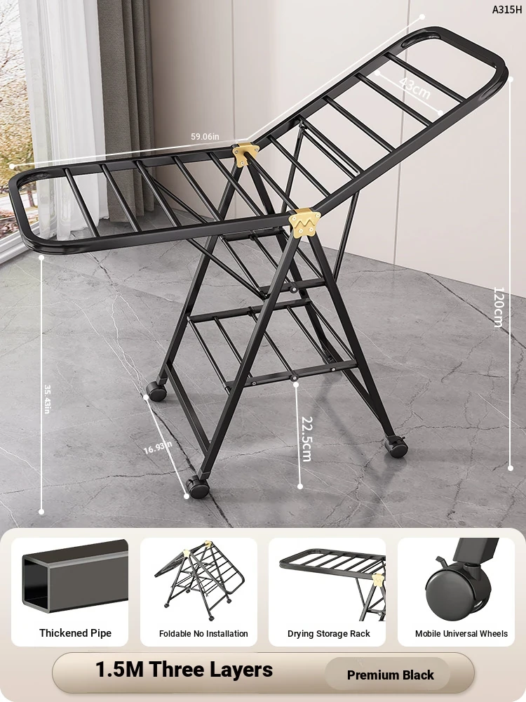 [No Installation + Universal Wheel] 59.06 in High Grade Black-Three Layers Drying