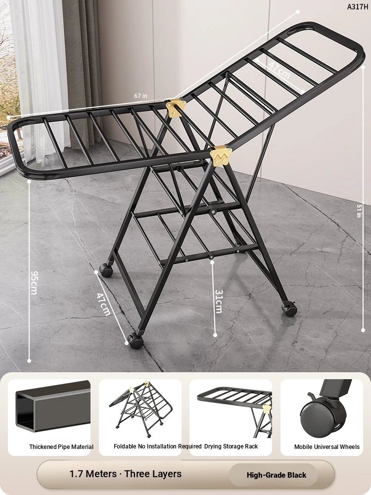 [No Installation + Universal Wheel] 66.93 in High Grade Black-Three Layers Drying
