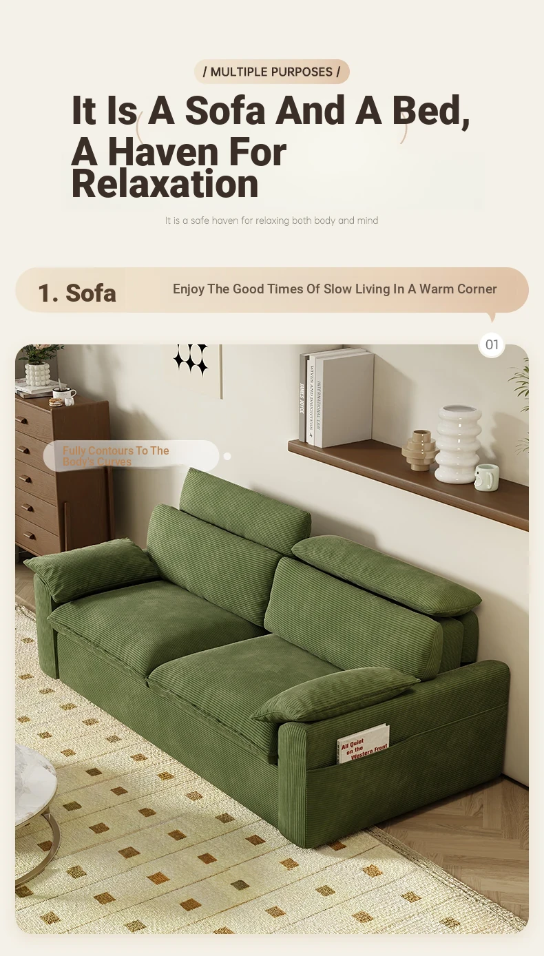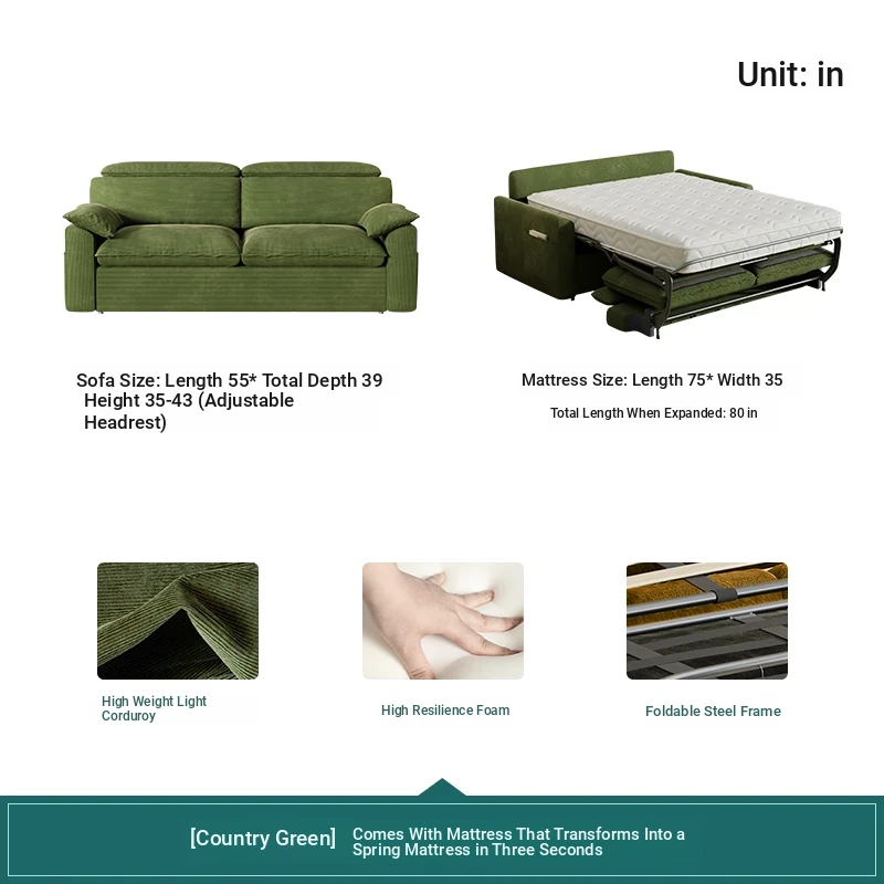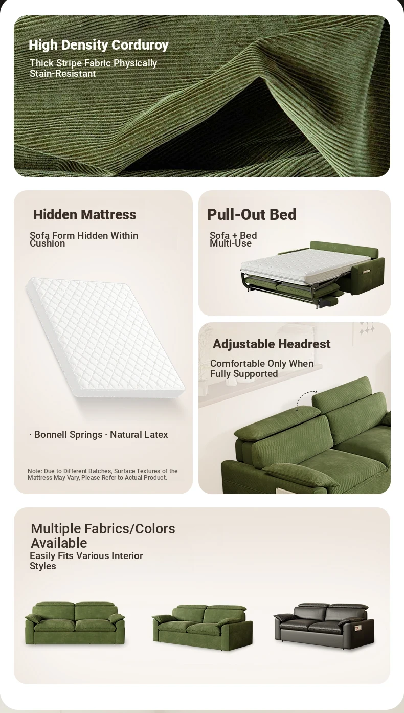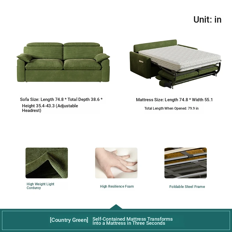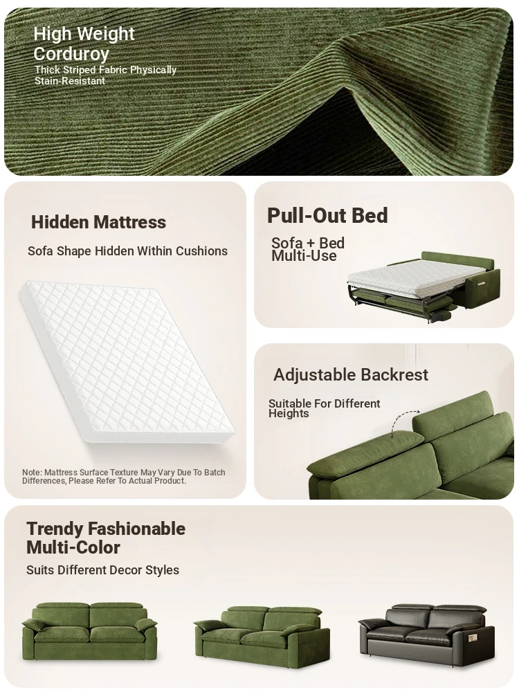Green Corduroy Convertible Sofa Bed with Built-in Mattress - 2-in-1 Foldable Design, 2025 New Model with Headrest for Ultimate Comfort and Style
