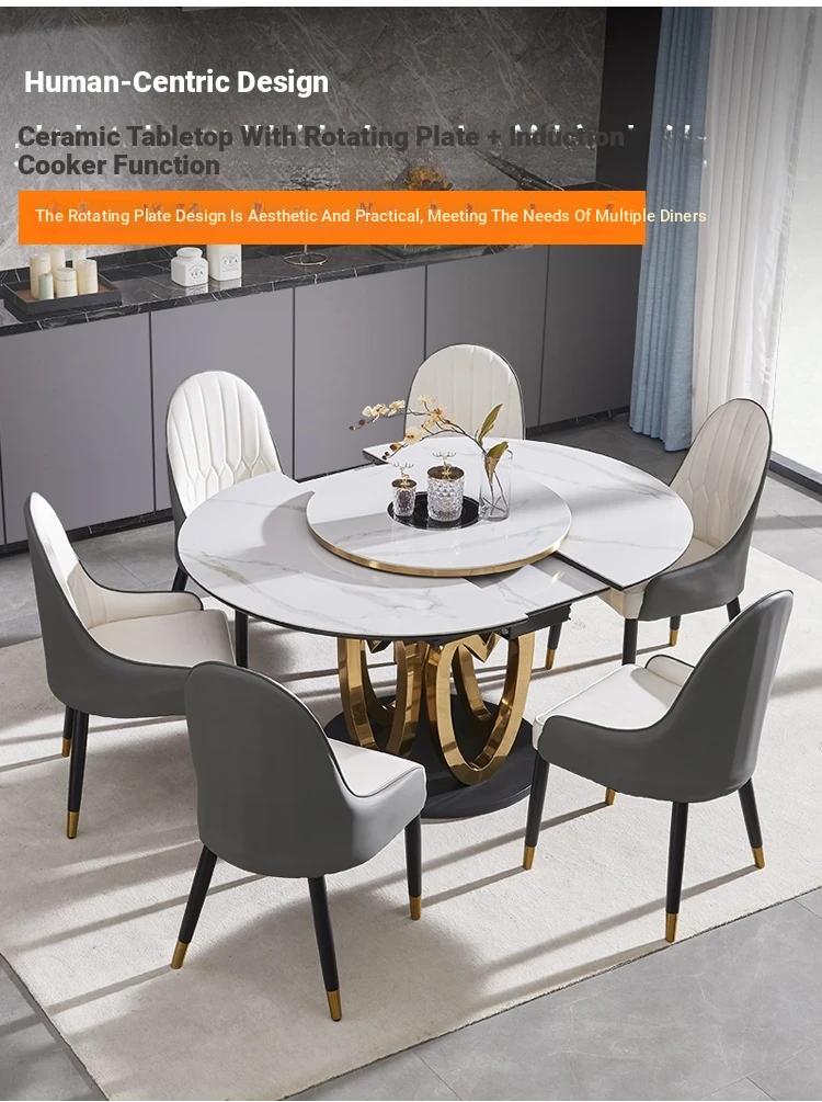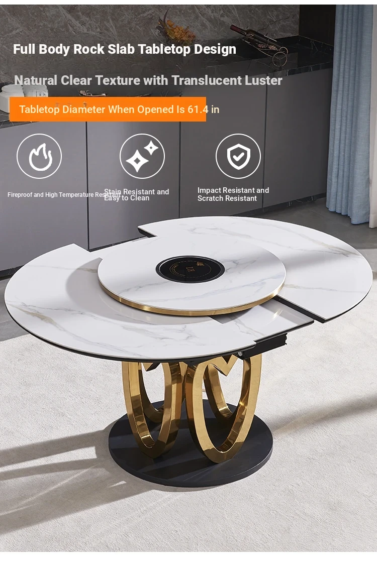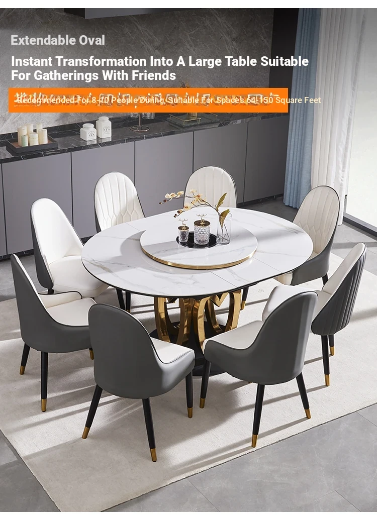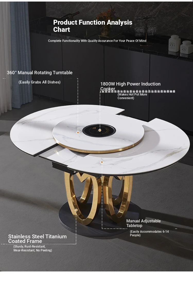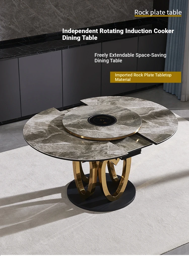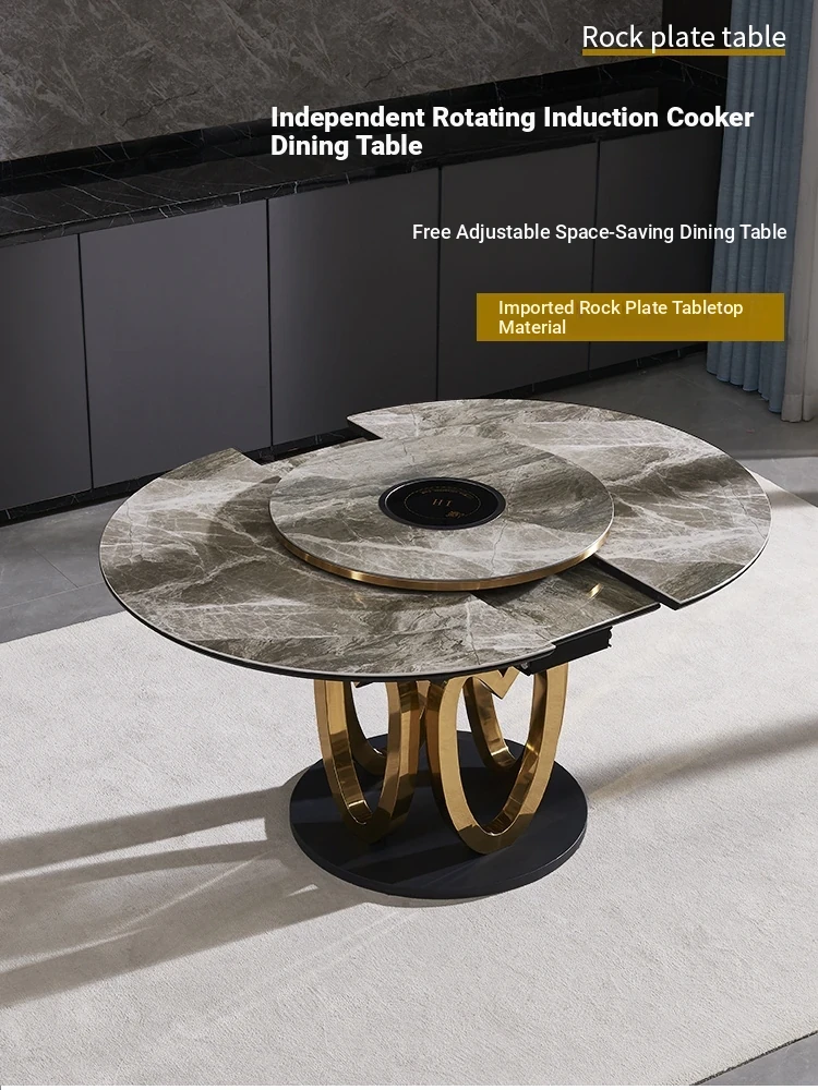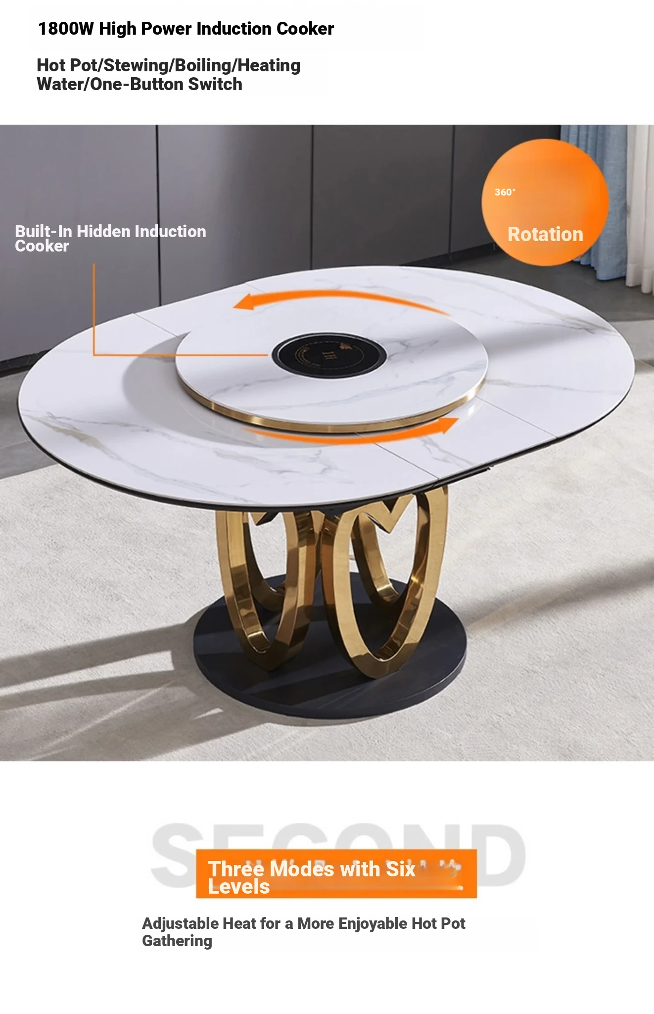 Oval Rock Plate Dining Table - Convertible Round Design with Lazy Susan, Expandable Luxury Hot Pot Table with Induction Cooker, Multi-functional Dining Experience