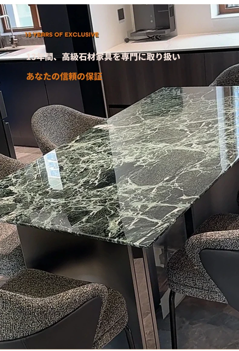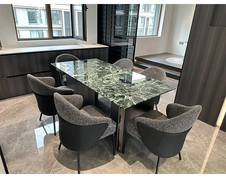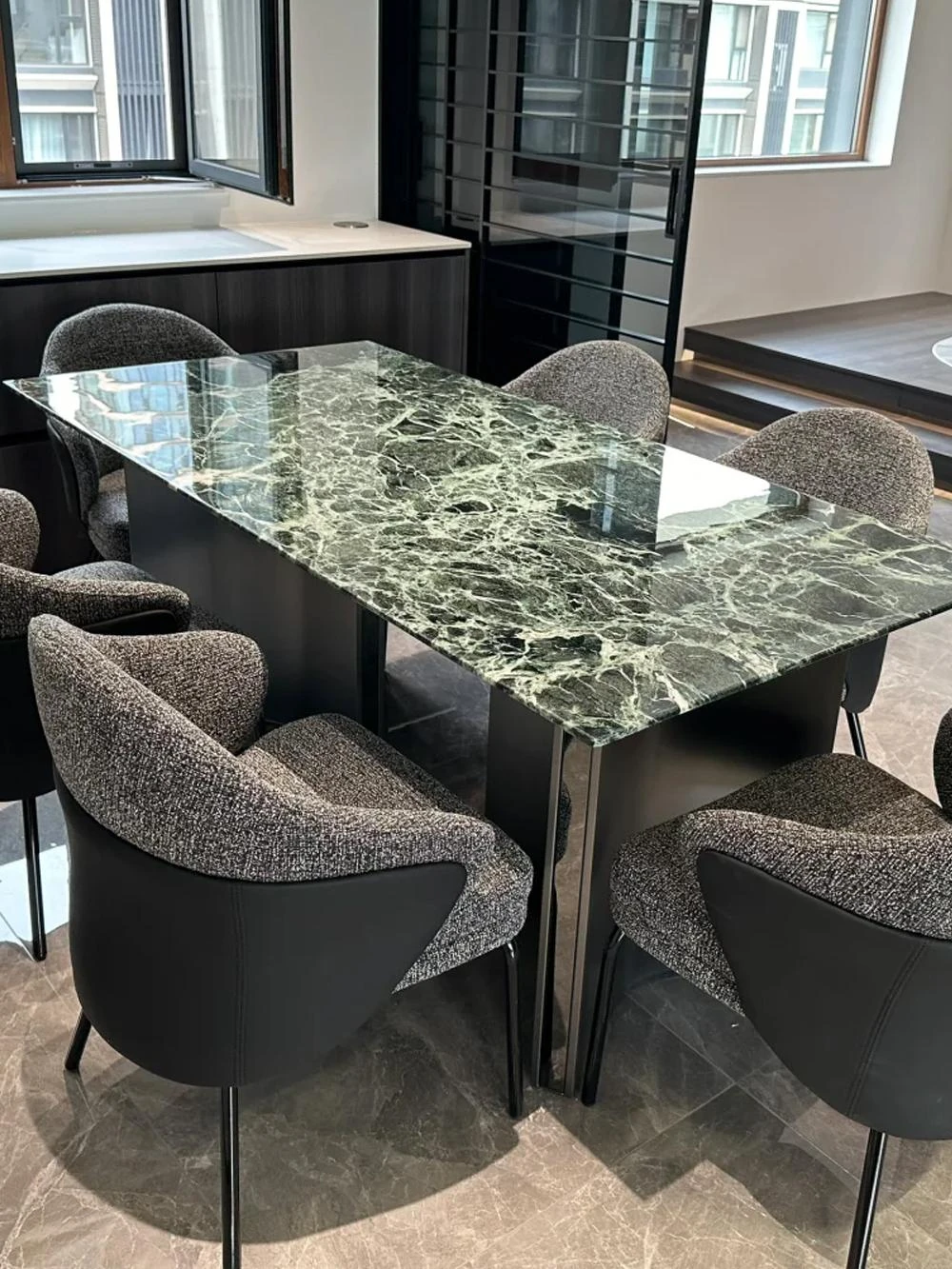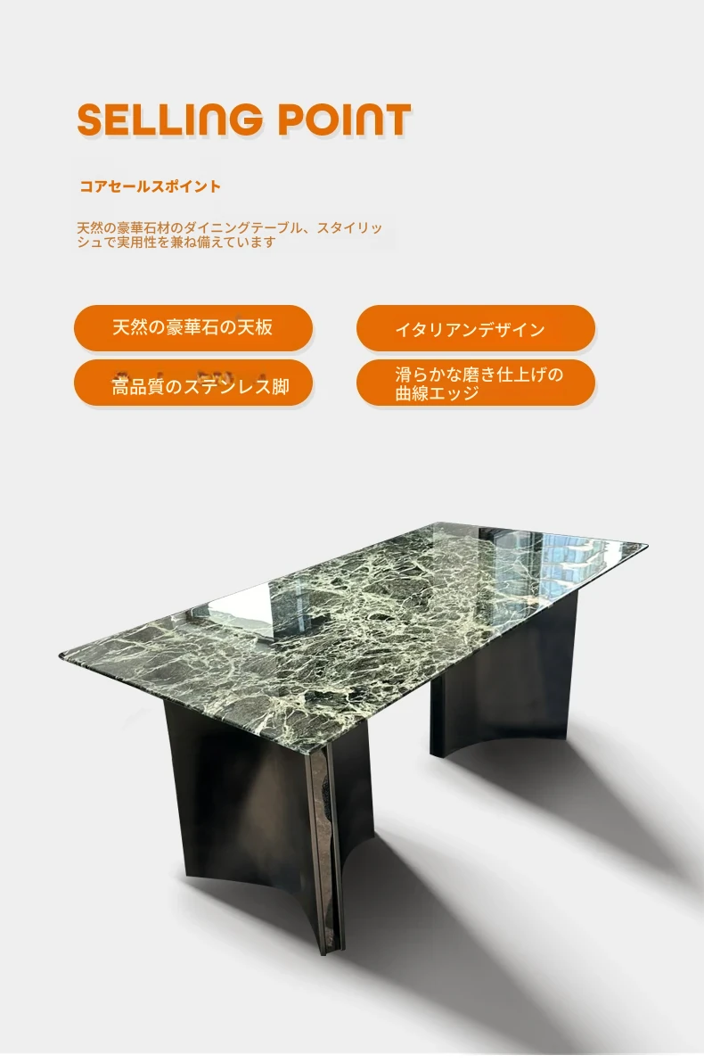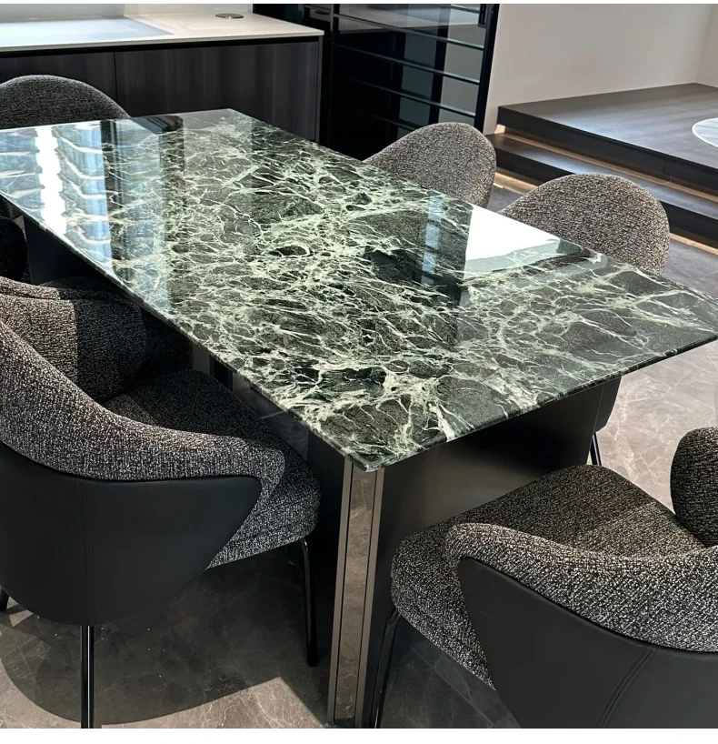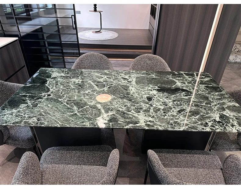 加澄の天然プラダグリーンラグジュアリー石製ダイニングテーブル - イタリアンミニマリズムの極み、高級別荘のための洗練された天然石の食卓。