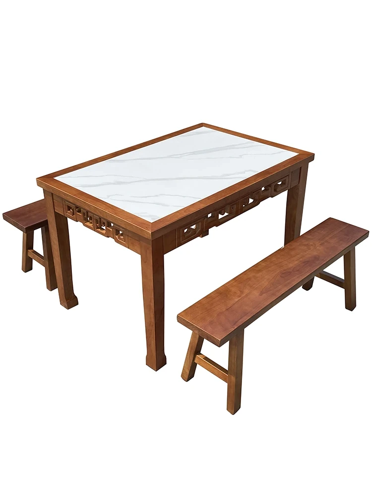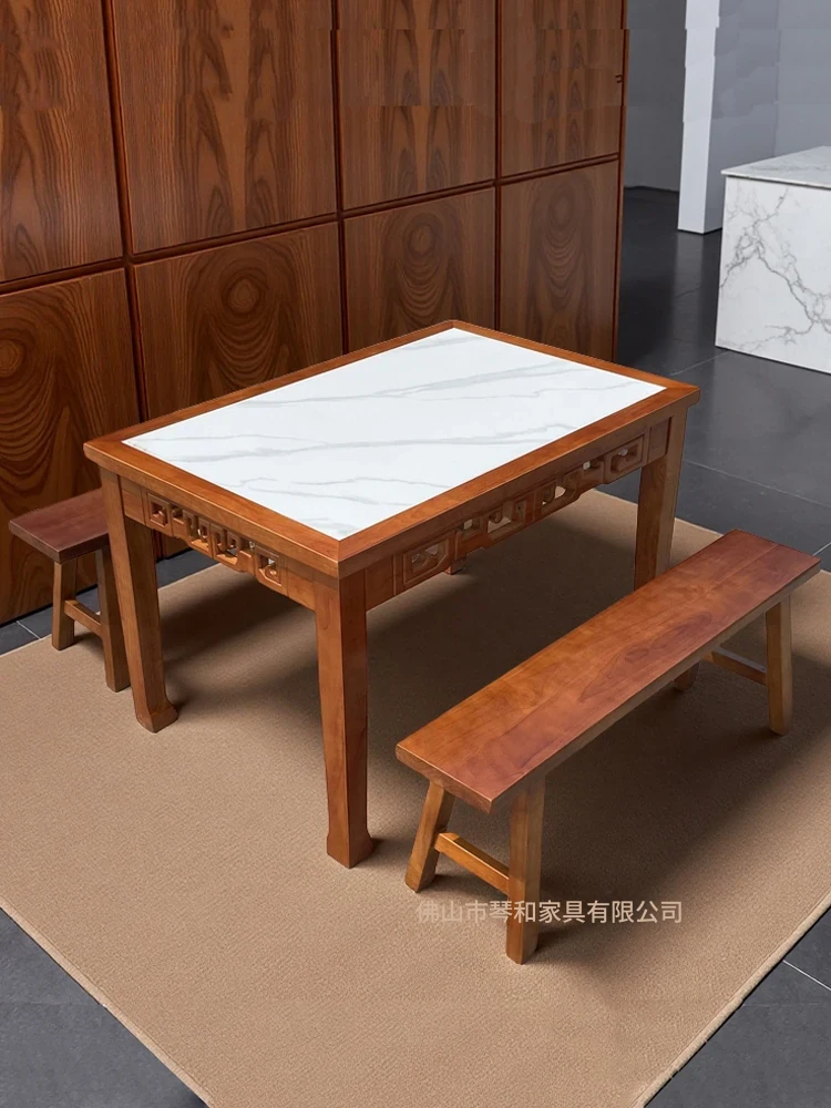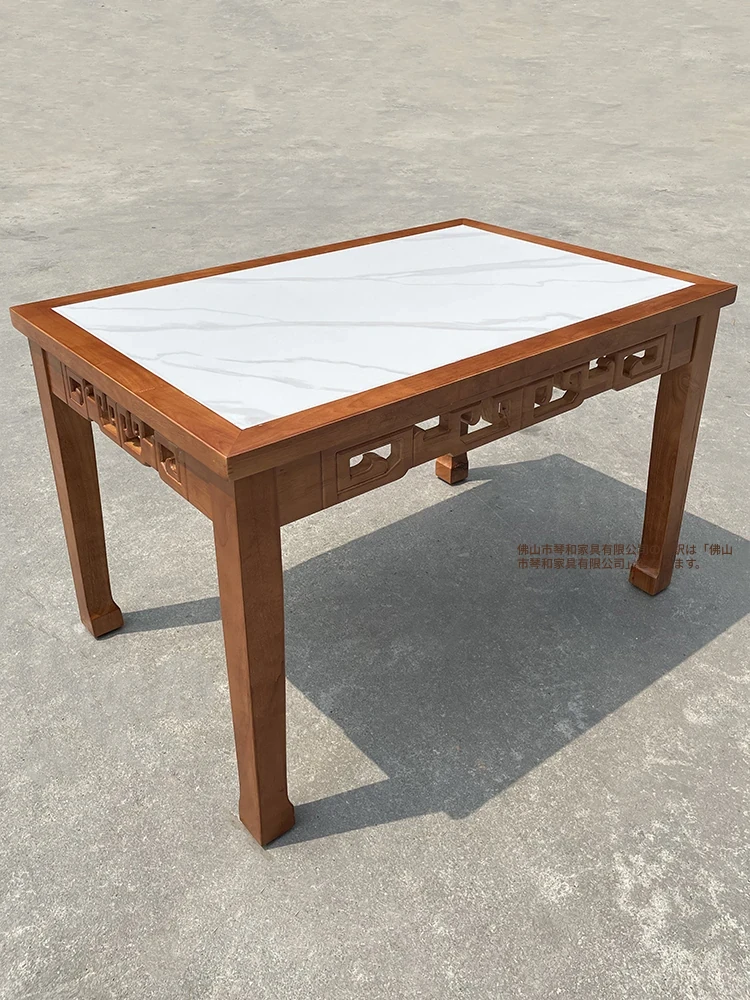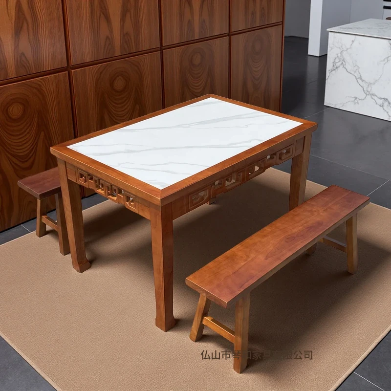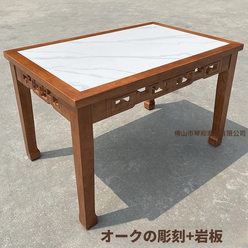 商業用彫刻オーク無垢材エッジ加工ラウンドプレート長方形ダイニングテーブルセット|火鍋店・軽食店・レストラン・ホテルに最適!高品質で耐久性抜群、スタイリッシュなデザインでお客様を魅了します。