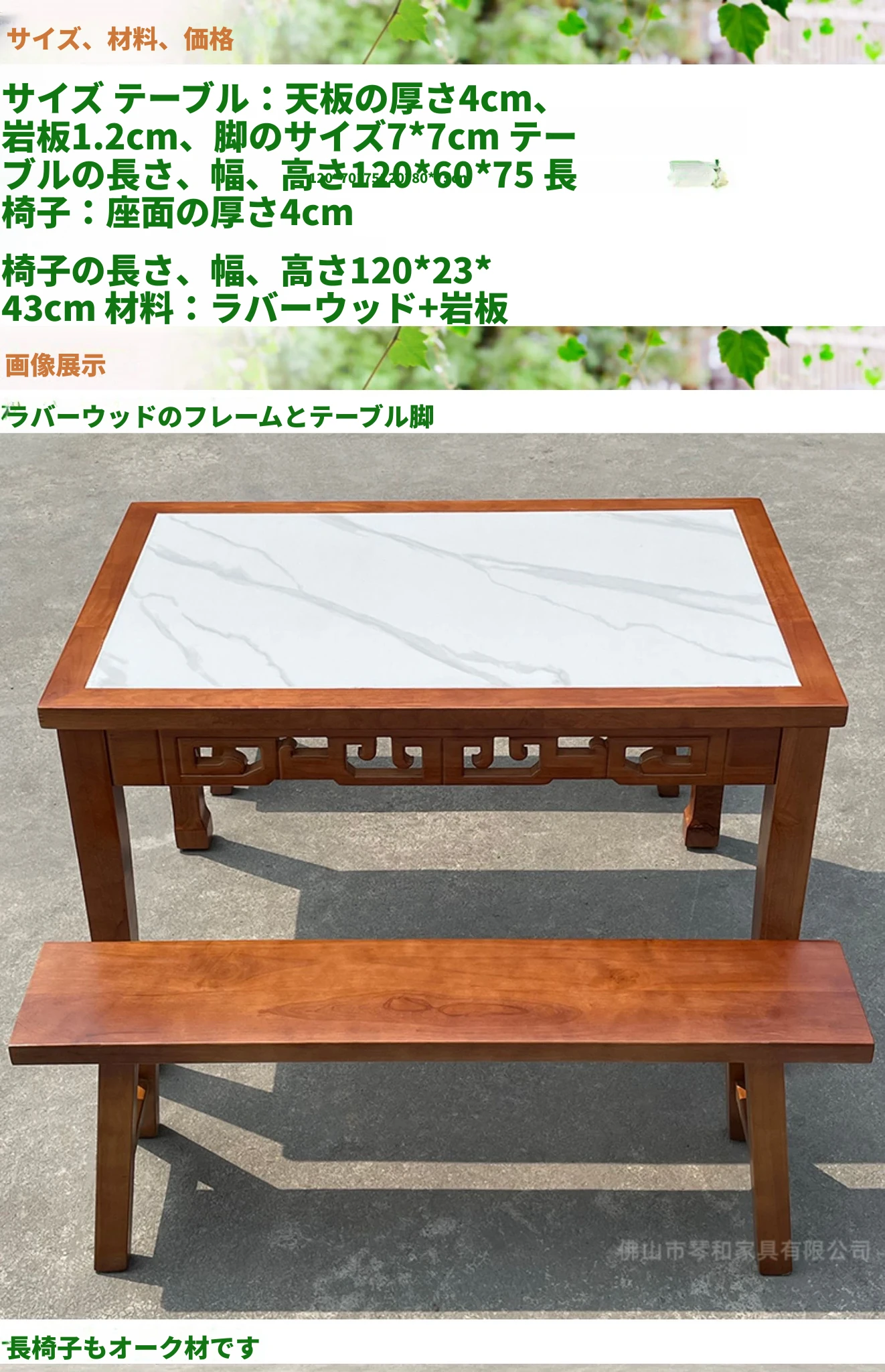 120*60オーク材岩板テーブル+2脚長椅子
