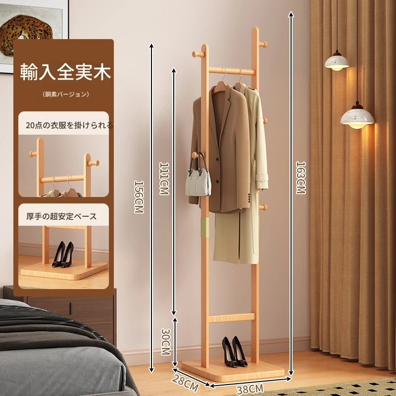 【輸入全ての無垢材】ナチュラル色【20着の衣服を掛けられます】