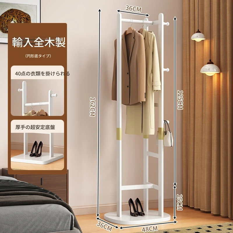 【輸入全ての無垢材-丸底タイプ】白色【40着の衣服を掛けられます】