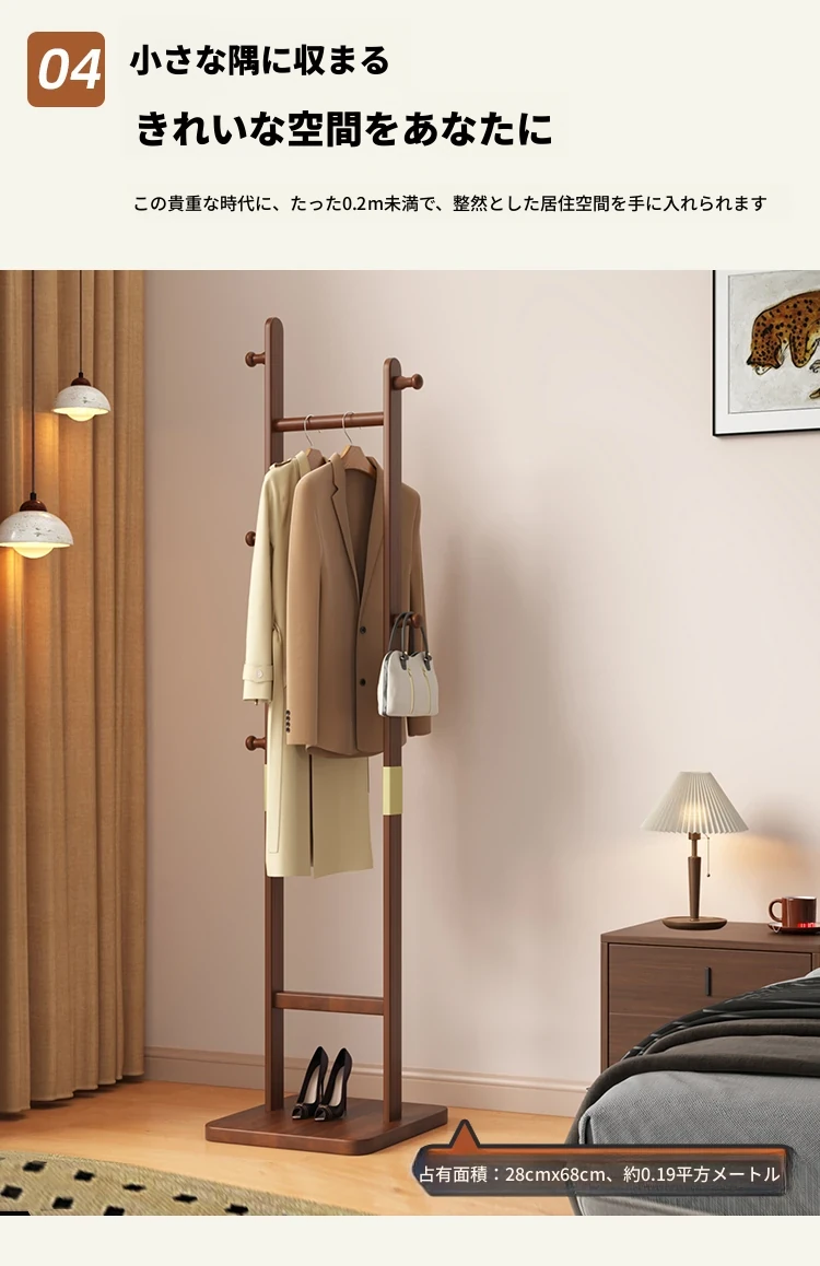 「おしゃれなクリームカラーの天然木製ハンガーラック - 寝室にぴったりの衣類収納アイテム!夜のお洋服もスッキリ収納!」