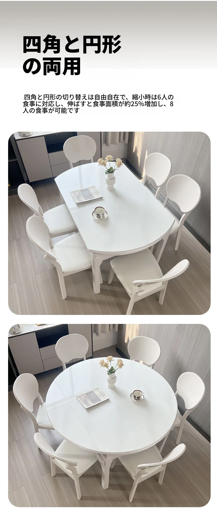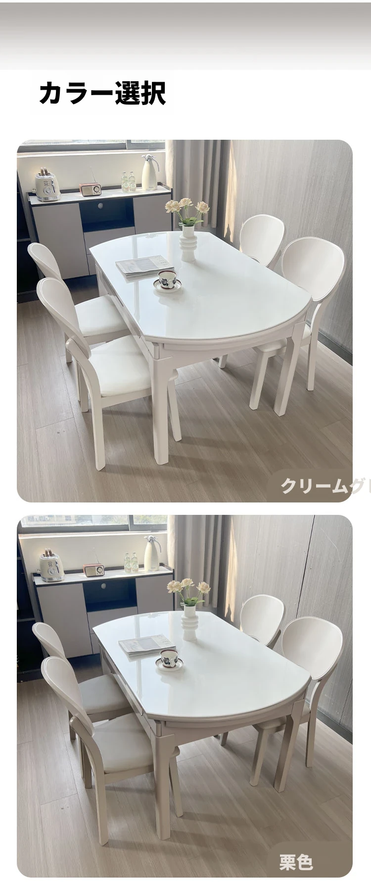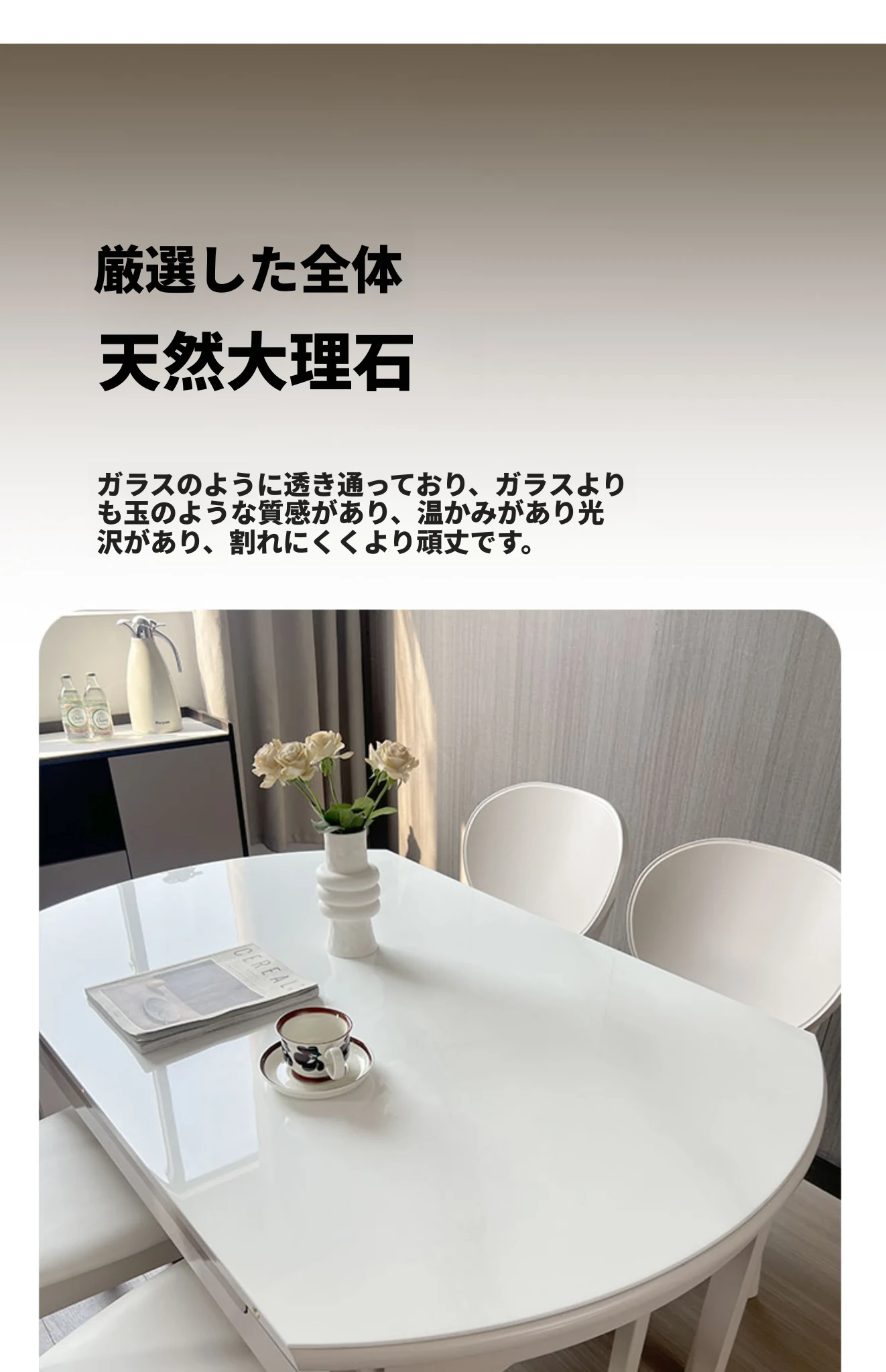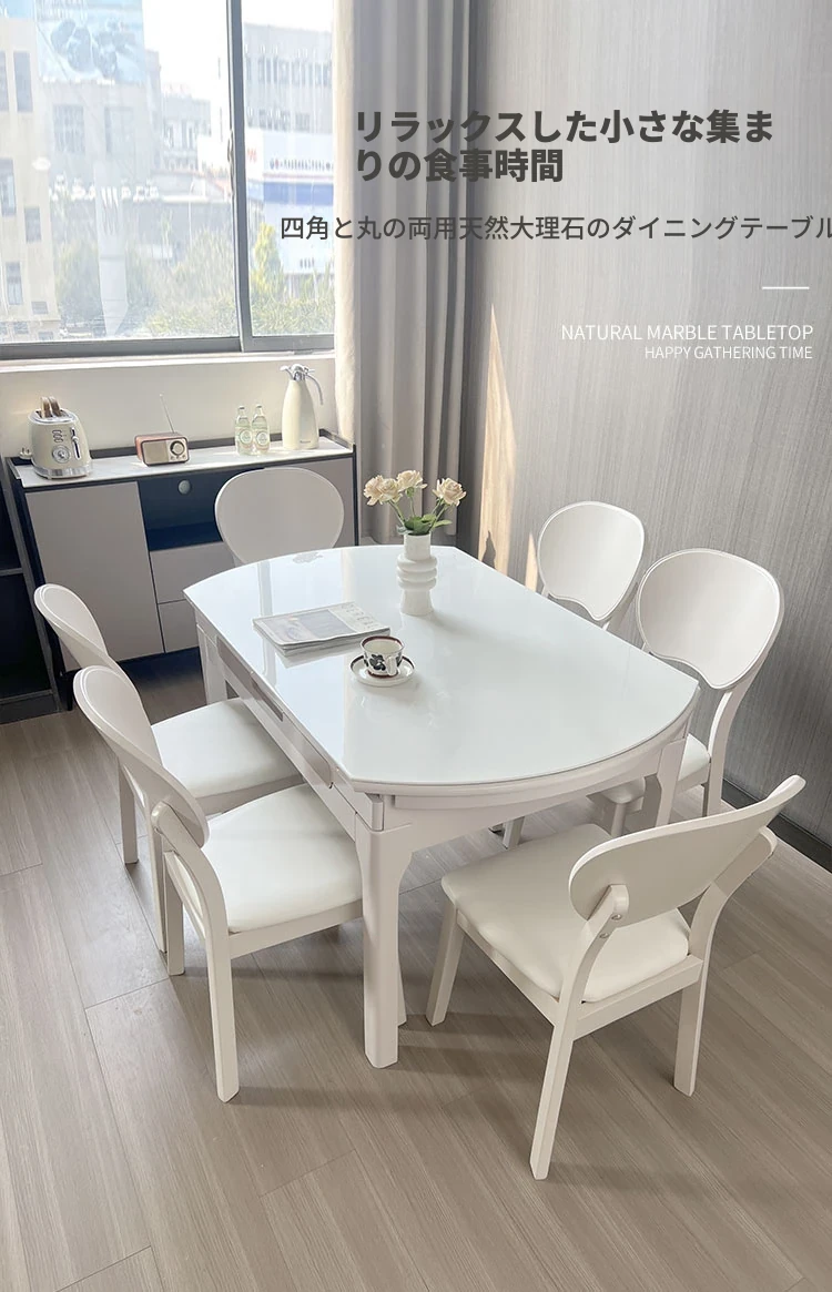 天然大理石製ダイニングテーブル&チェアセット|伸縮可能でラウンド形状に変化|高級感あふれるライトラグジュアリーなクリームカラー|頑丈な無垢材使用|おしゃれで快適な食卓を演出します!