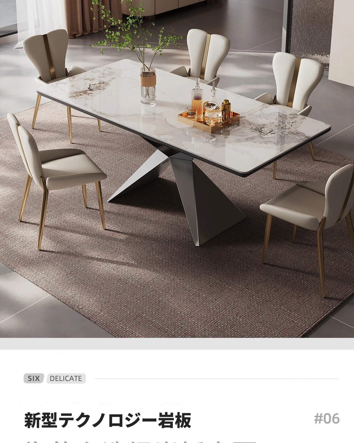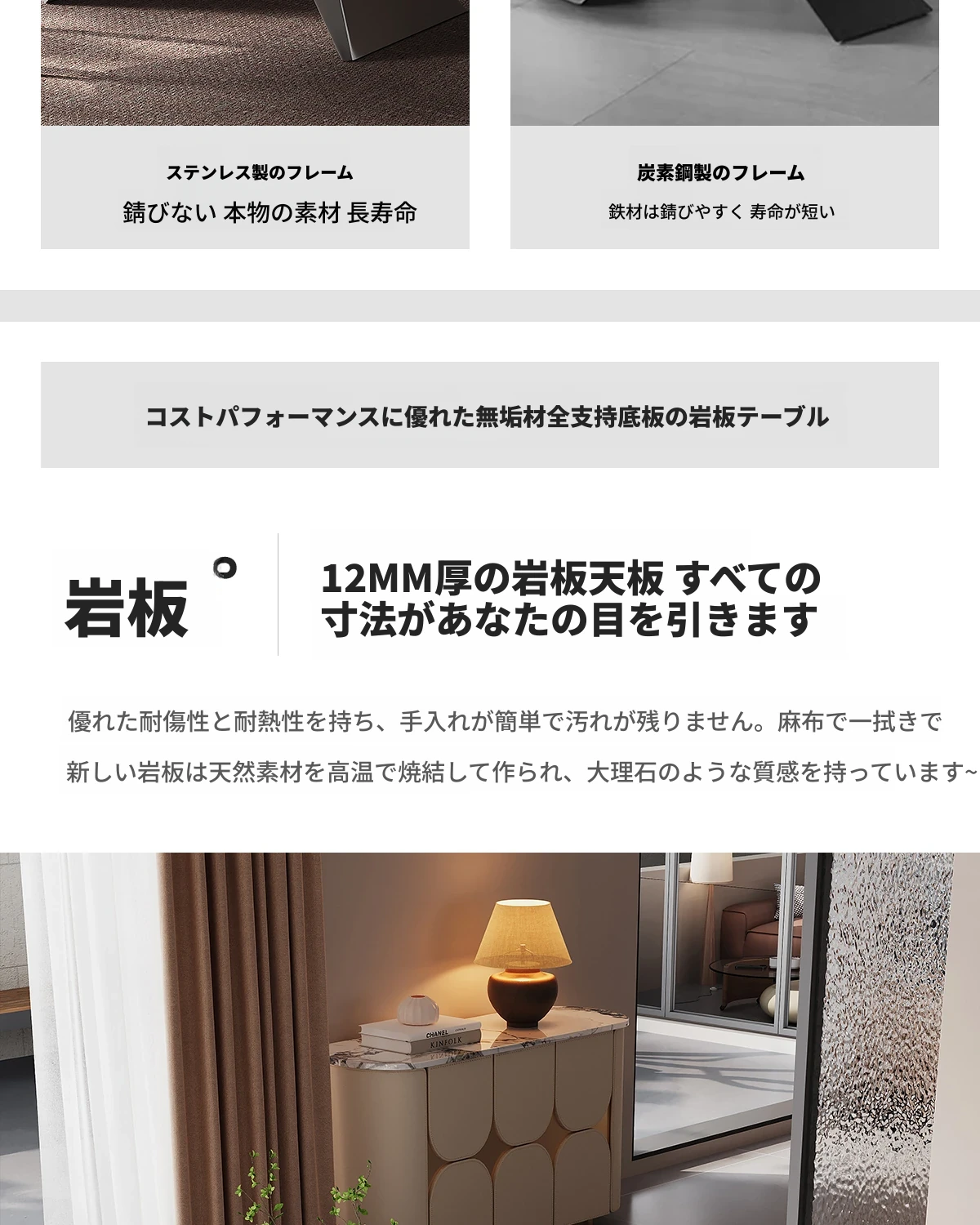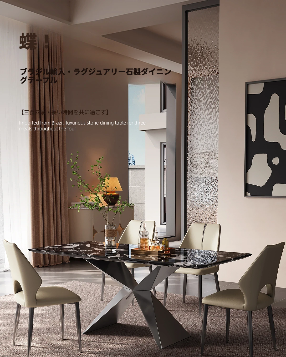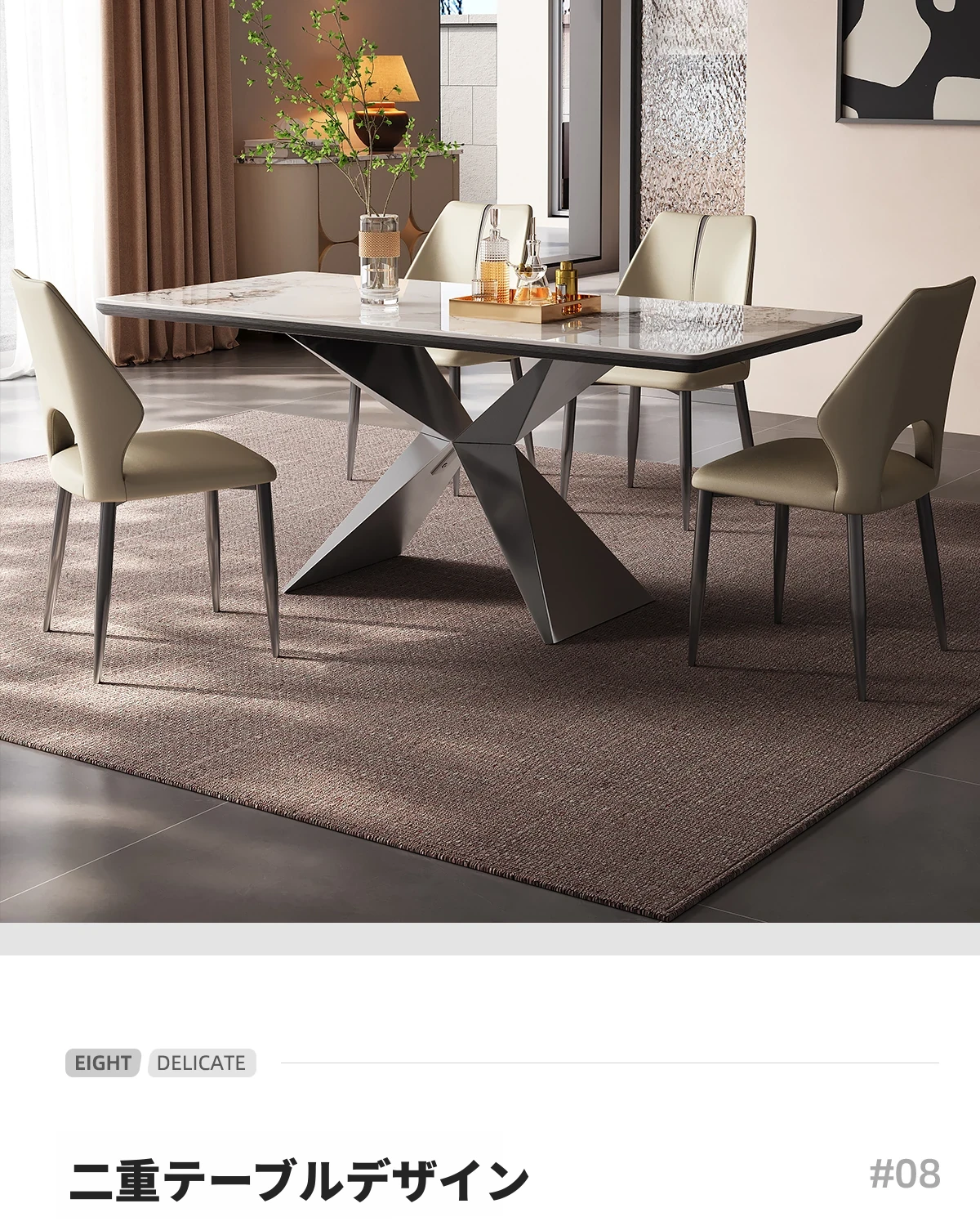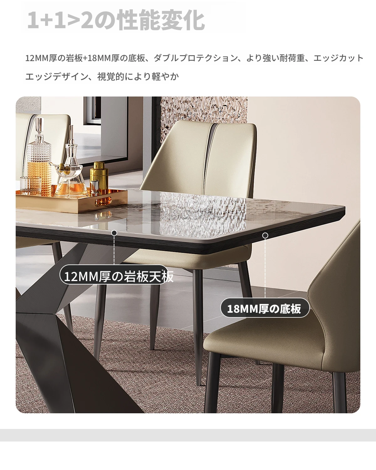 イタリアンミニマリズムの岩板ダイニングテーブル|高級感あふれるステンレス製の長方形テーブル|小さなスペースにもぴったり!モダンでエレガントなデザインで、あなたの食卓を格上げします。