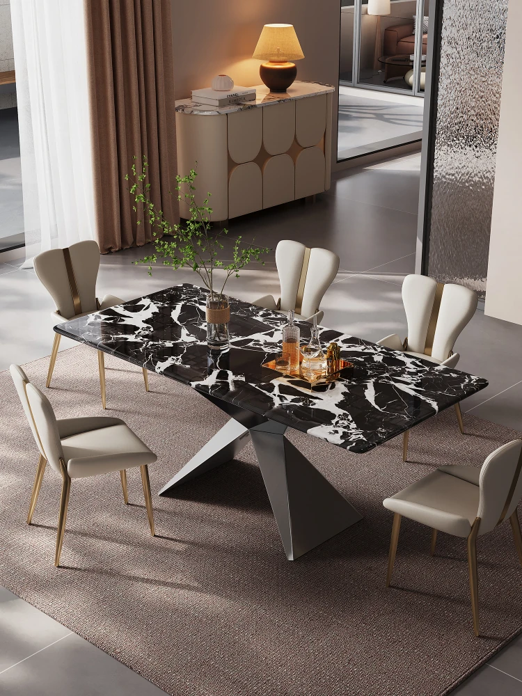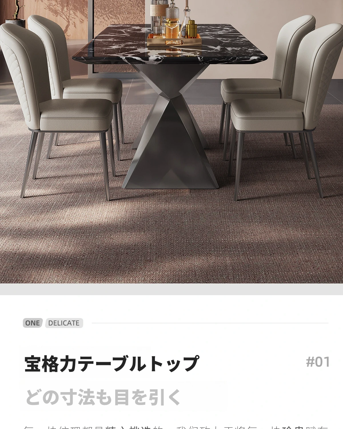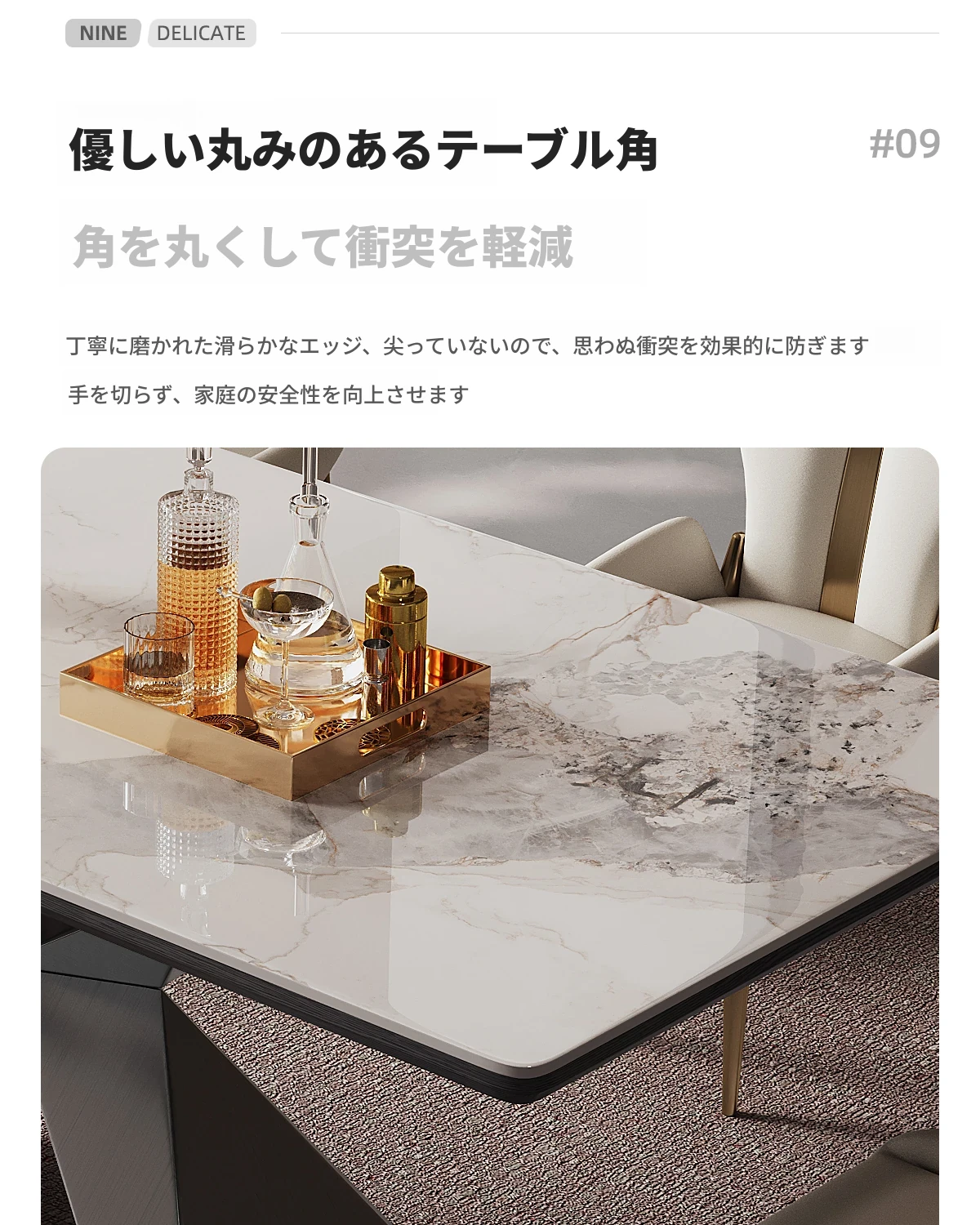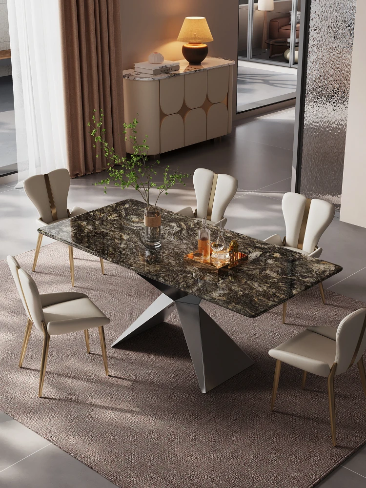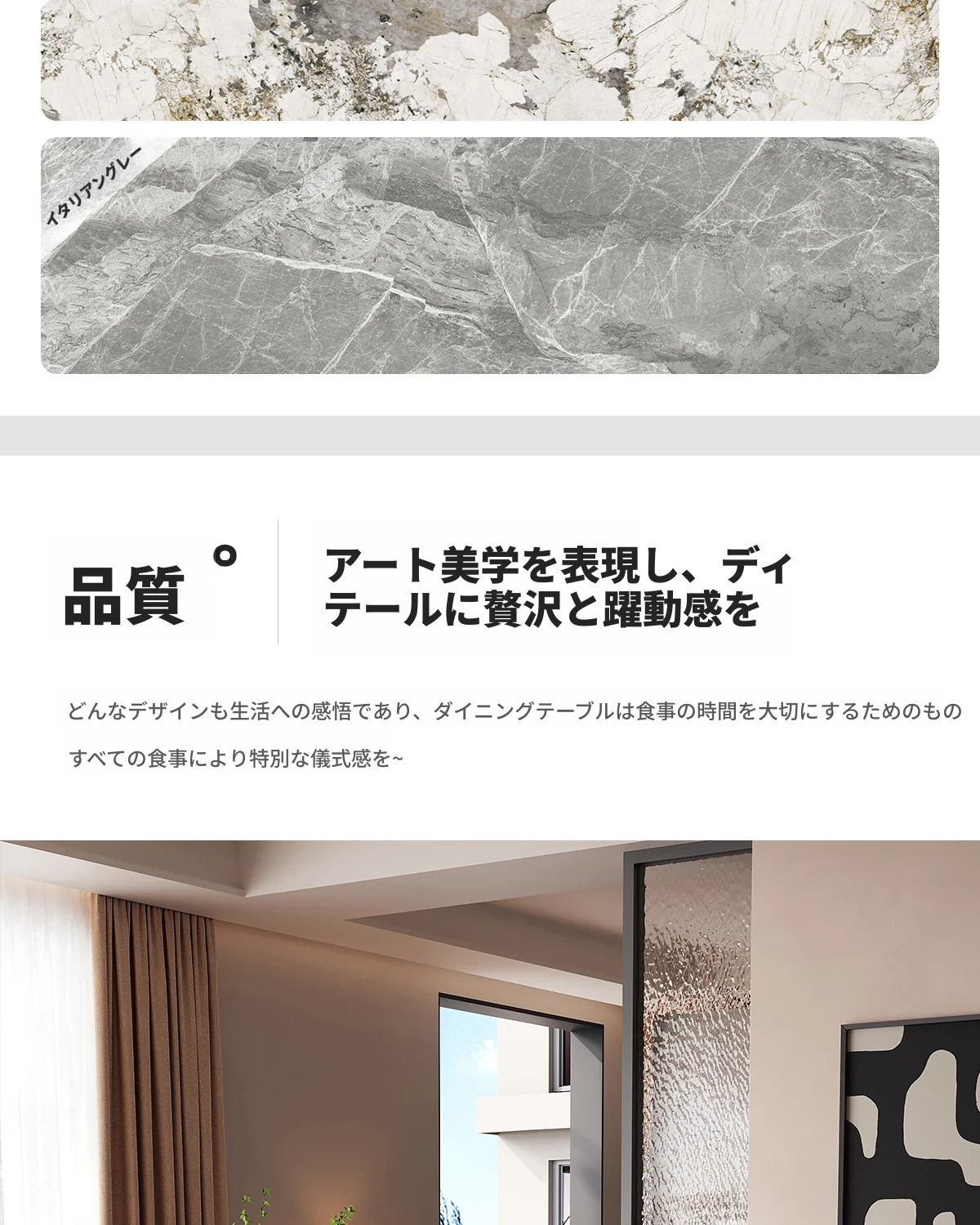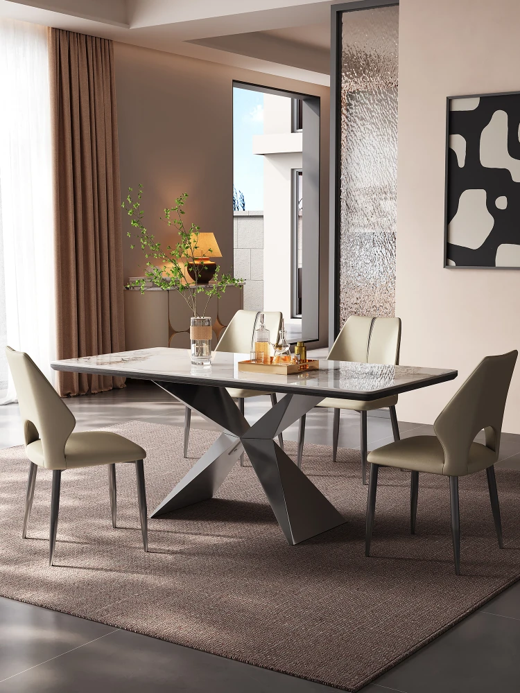 イタリアンミニマリズムの岩板ダイニングテーブル|高級感あふれるステンレス製の長方形テーブル|小さなスペースにもぴったり!モダンでエレガントなデザインで、あなたの食卓を格上げします。