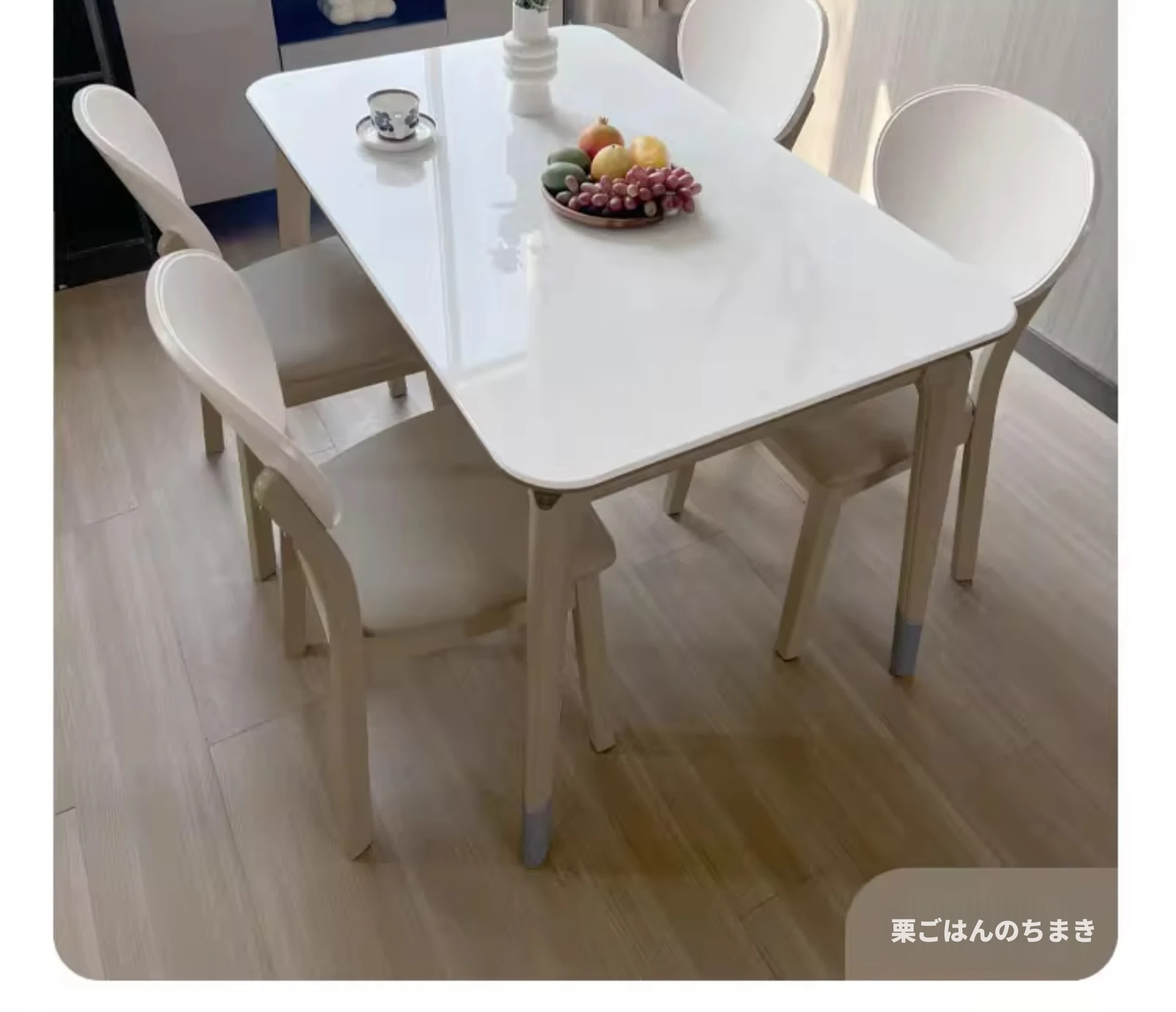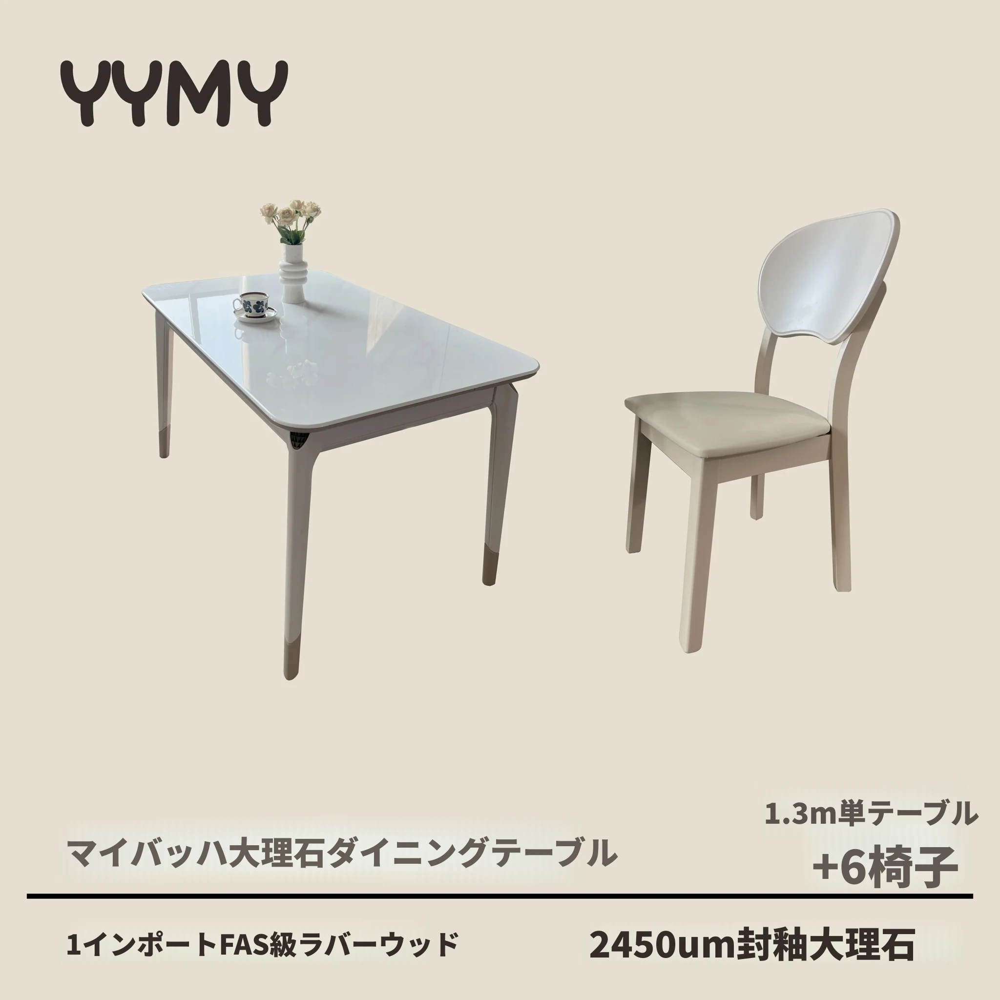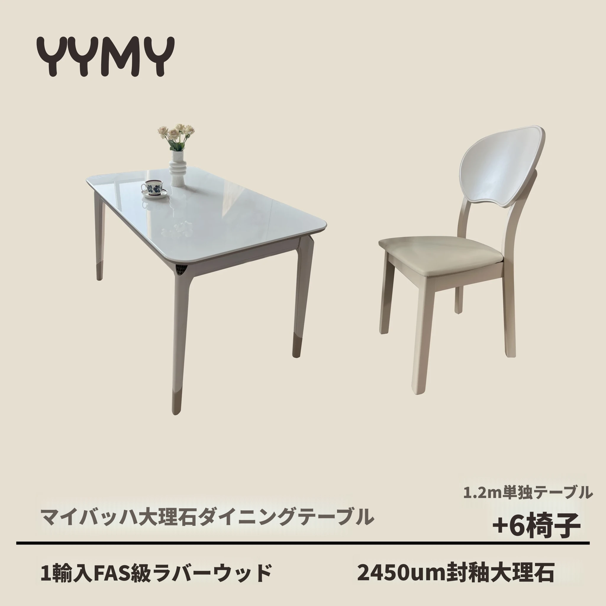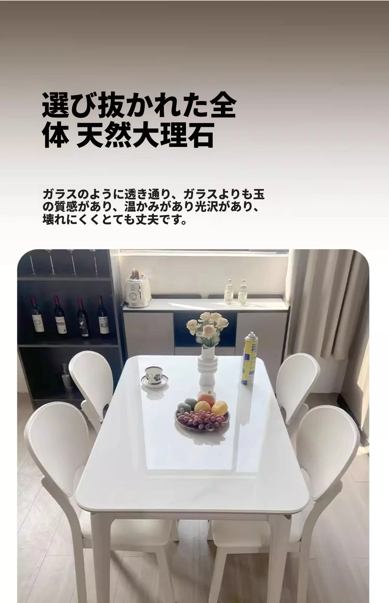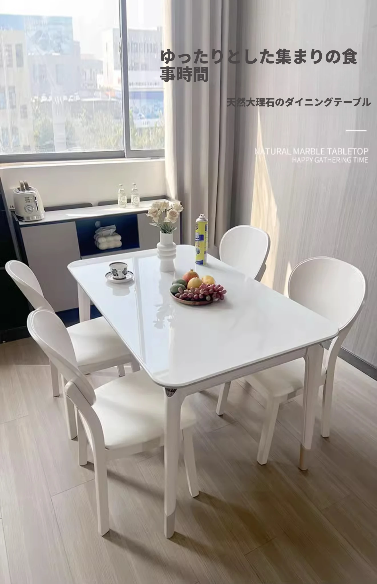 天然大理石使用の高級感溢れる長方形ダイニングテーブル&チェアセット - 小さなリビングにも最適なクリームカラーの天然木製テーブルで、食卓を華やかに演出!