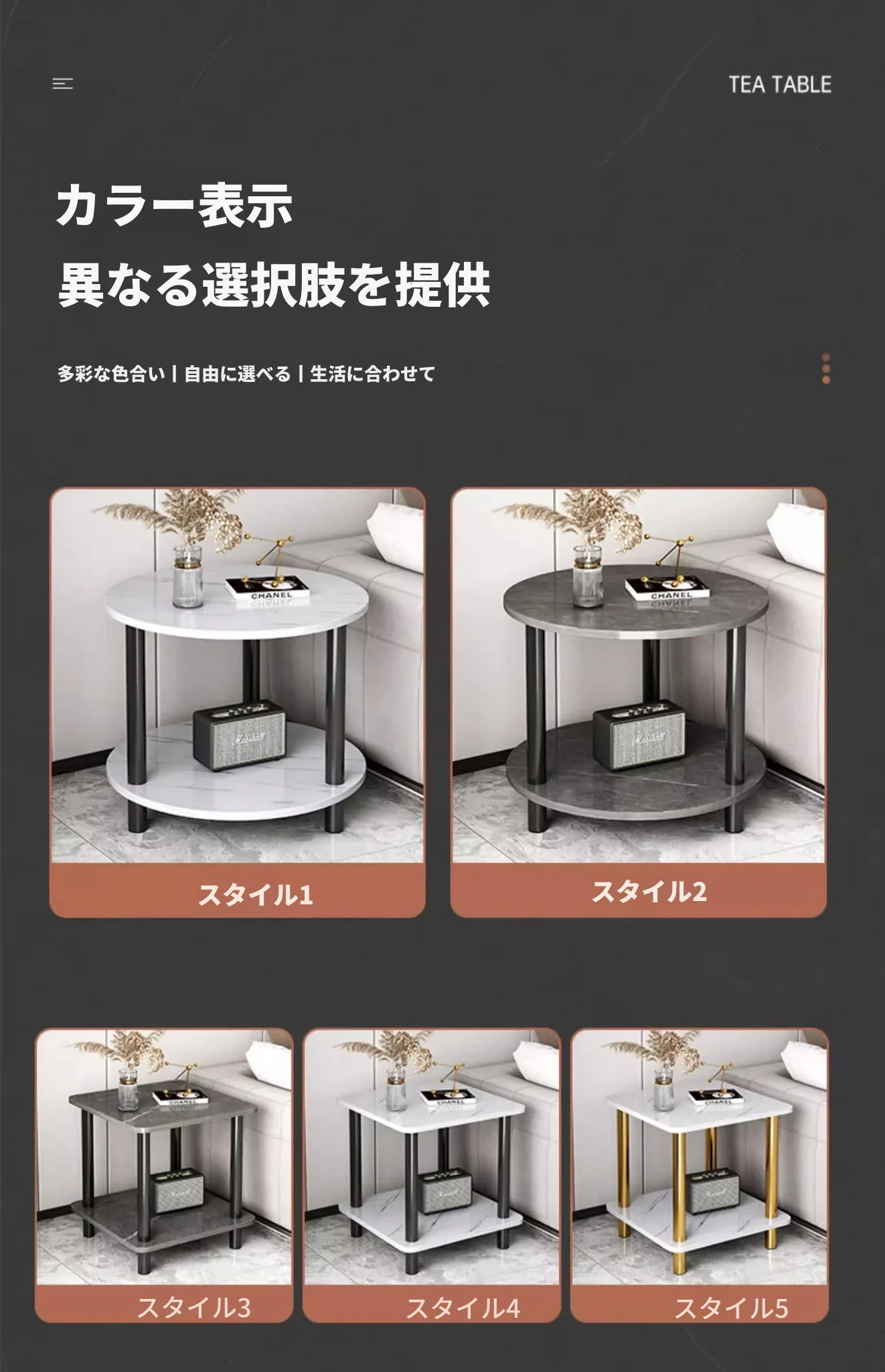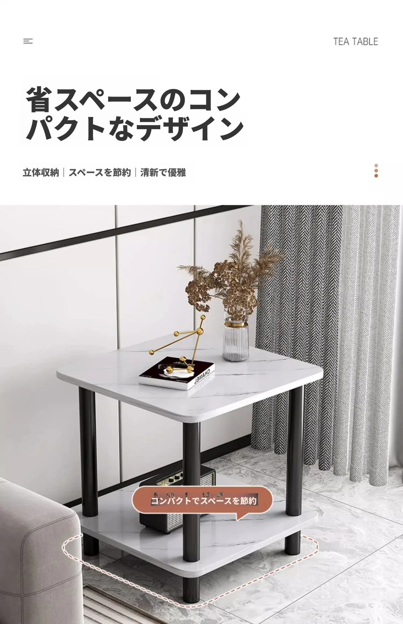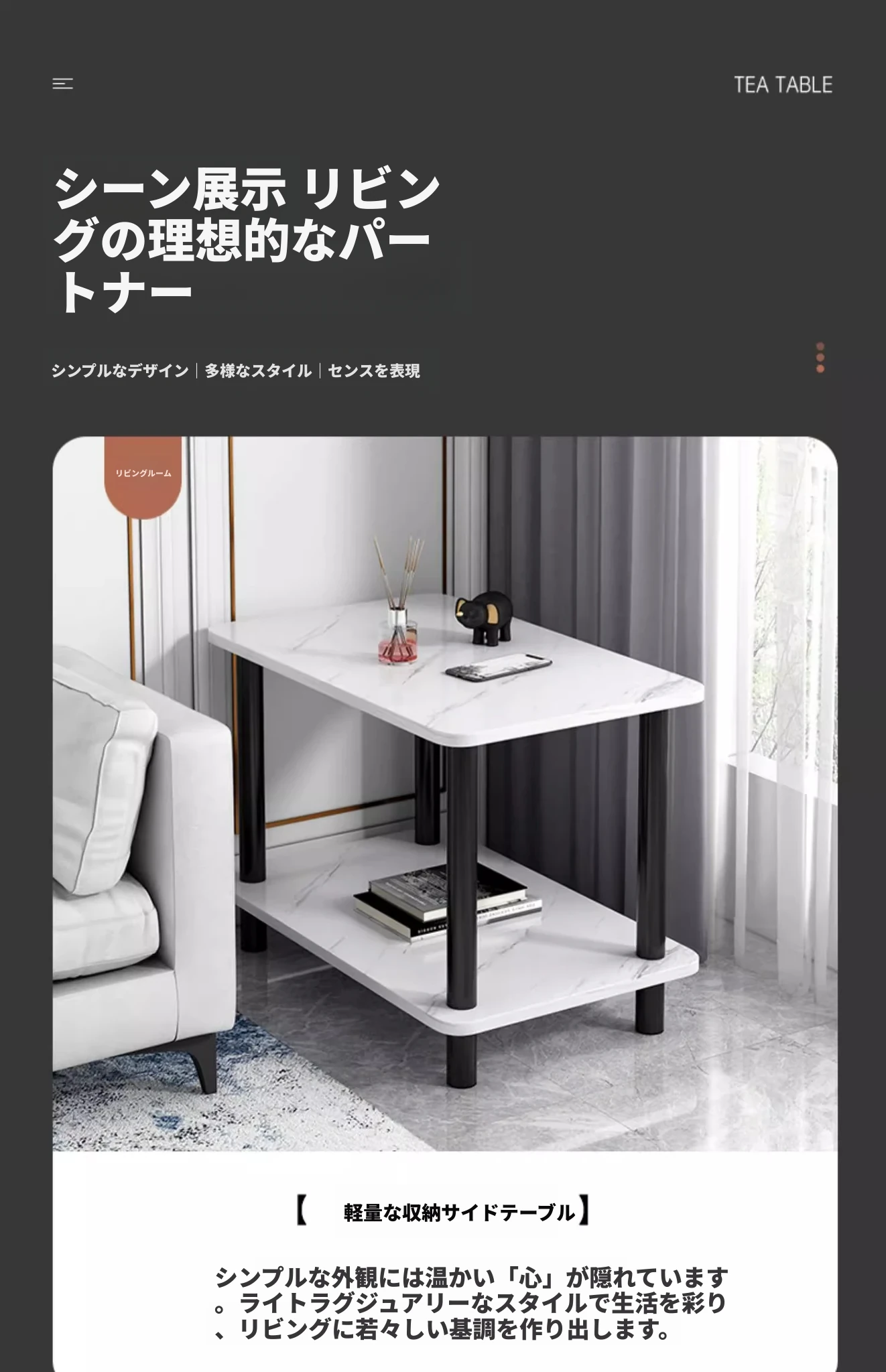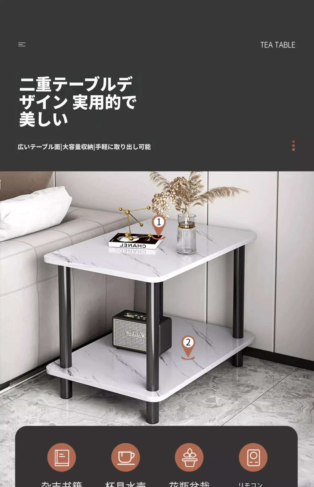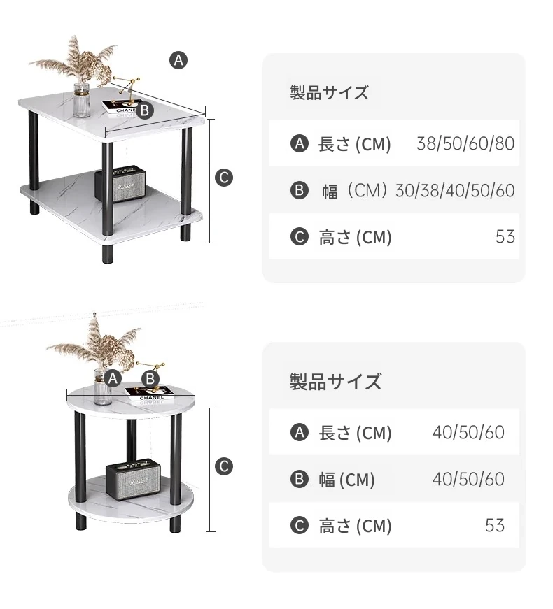 洗練されたデザインのリビング用サイドテーブル!小型住宅に最適な2段タイプのティーテーブル。ベッドサイドや収納棚としても使える便利な小テーブル。おしゃれで機能的なアイテムで、あなたの空間を素敵に演出します。