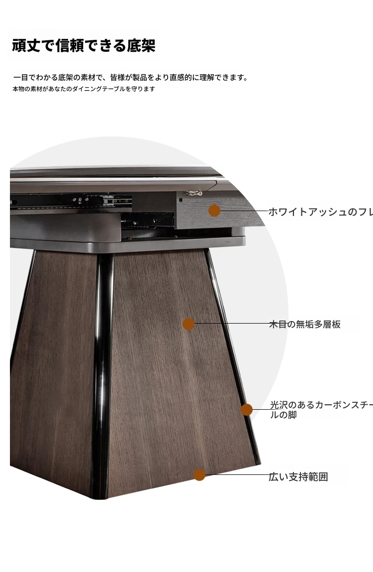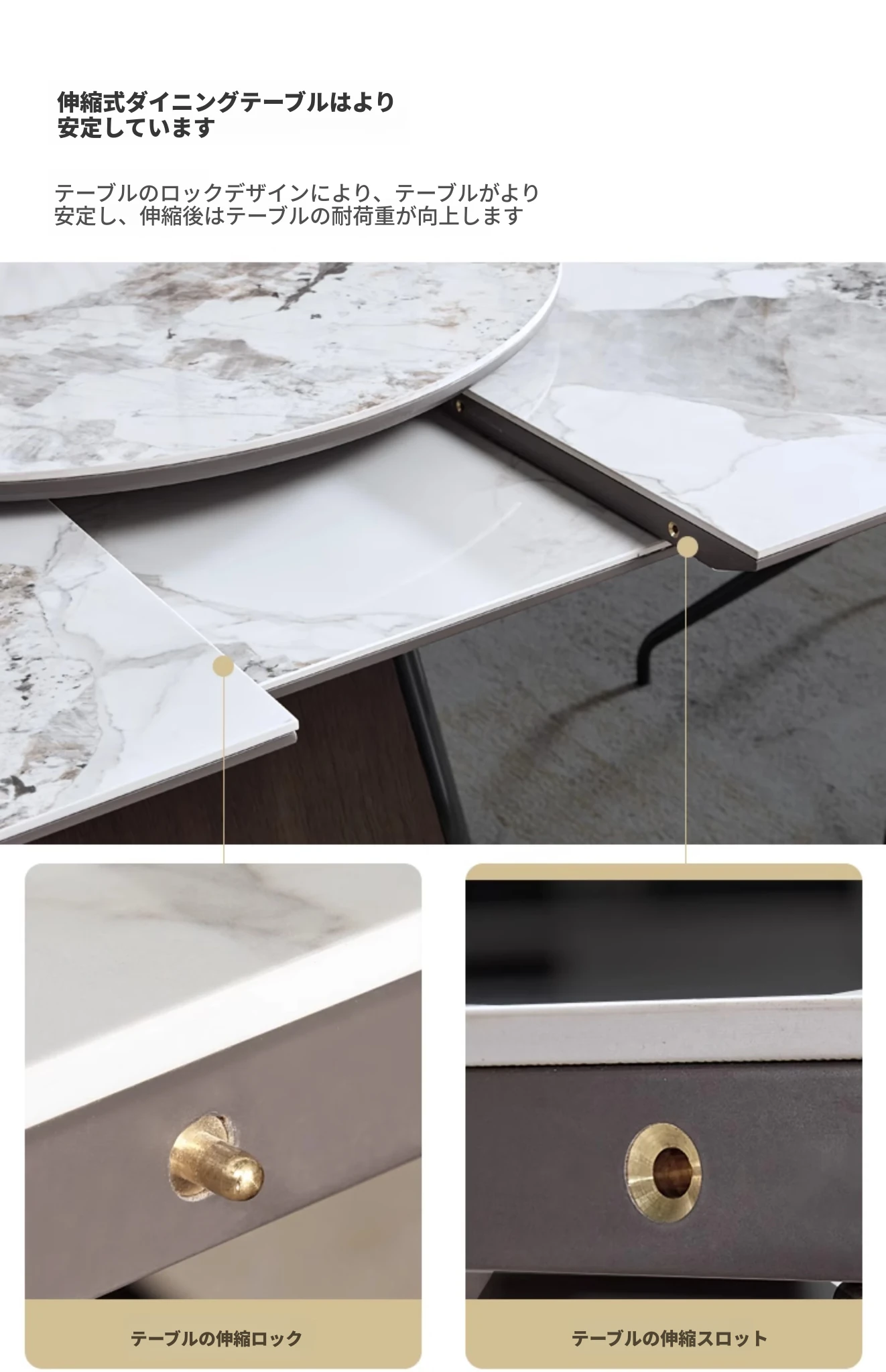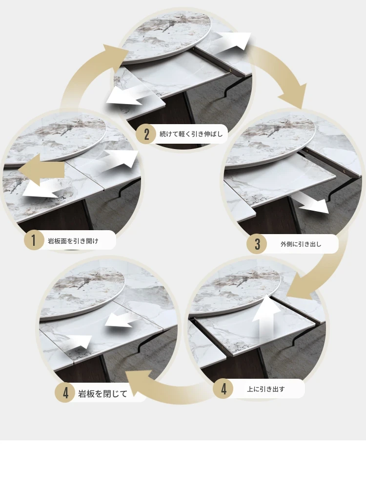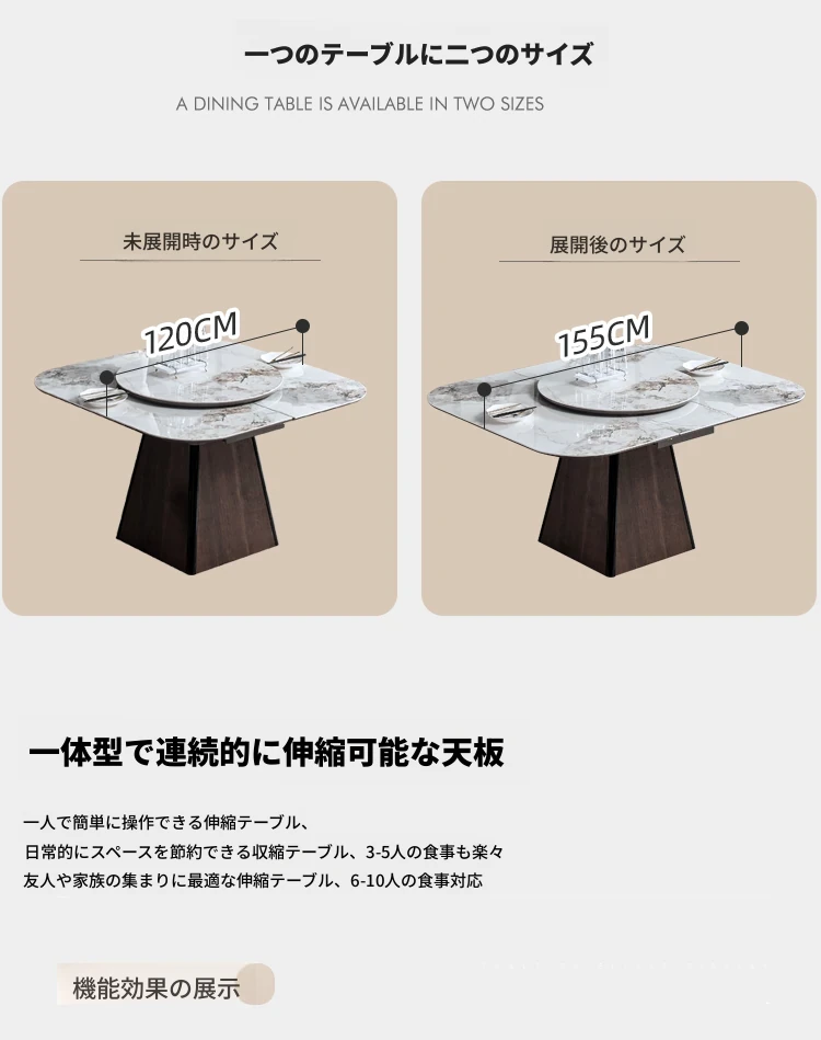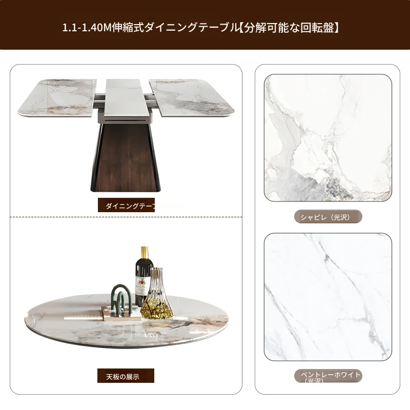 【大理石-超晶石】1.2m-1.55m伸縮ダイニングテーブル#621【固定回転盤付き】