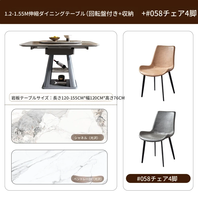 【モデル629#】1.2m伸縮ダイニングテーブル+4脚の椅子#058【回転盤収納付き】