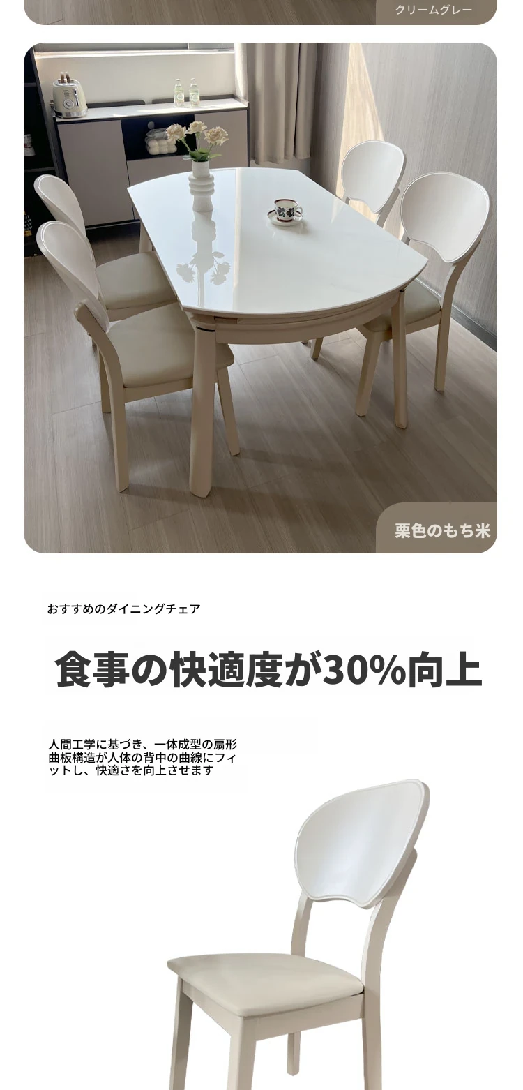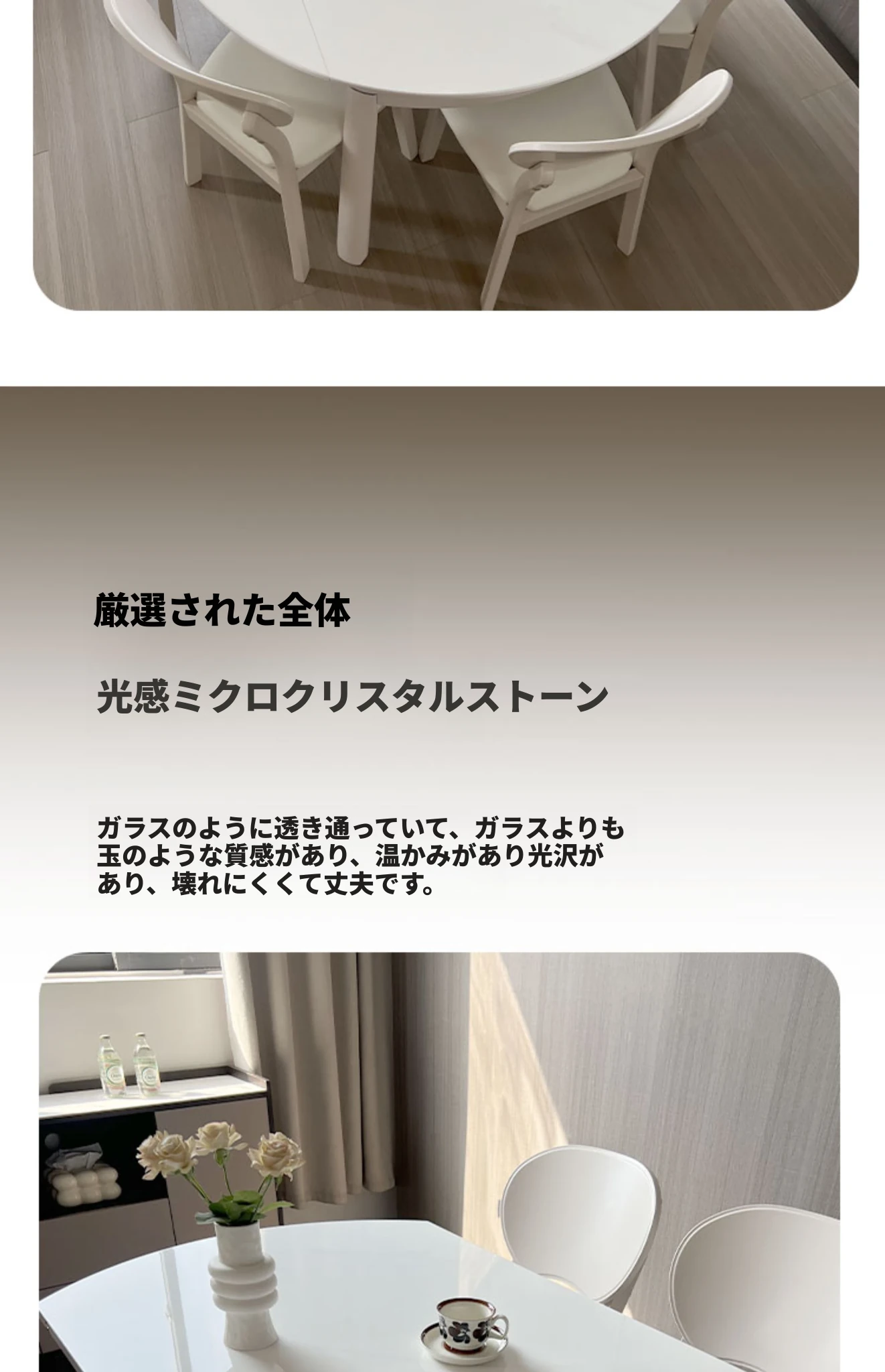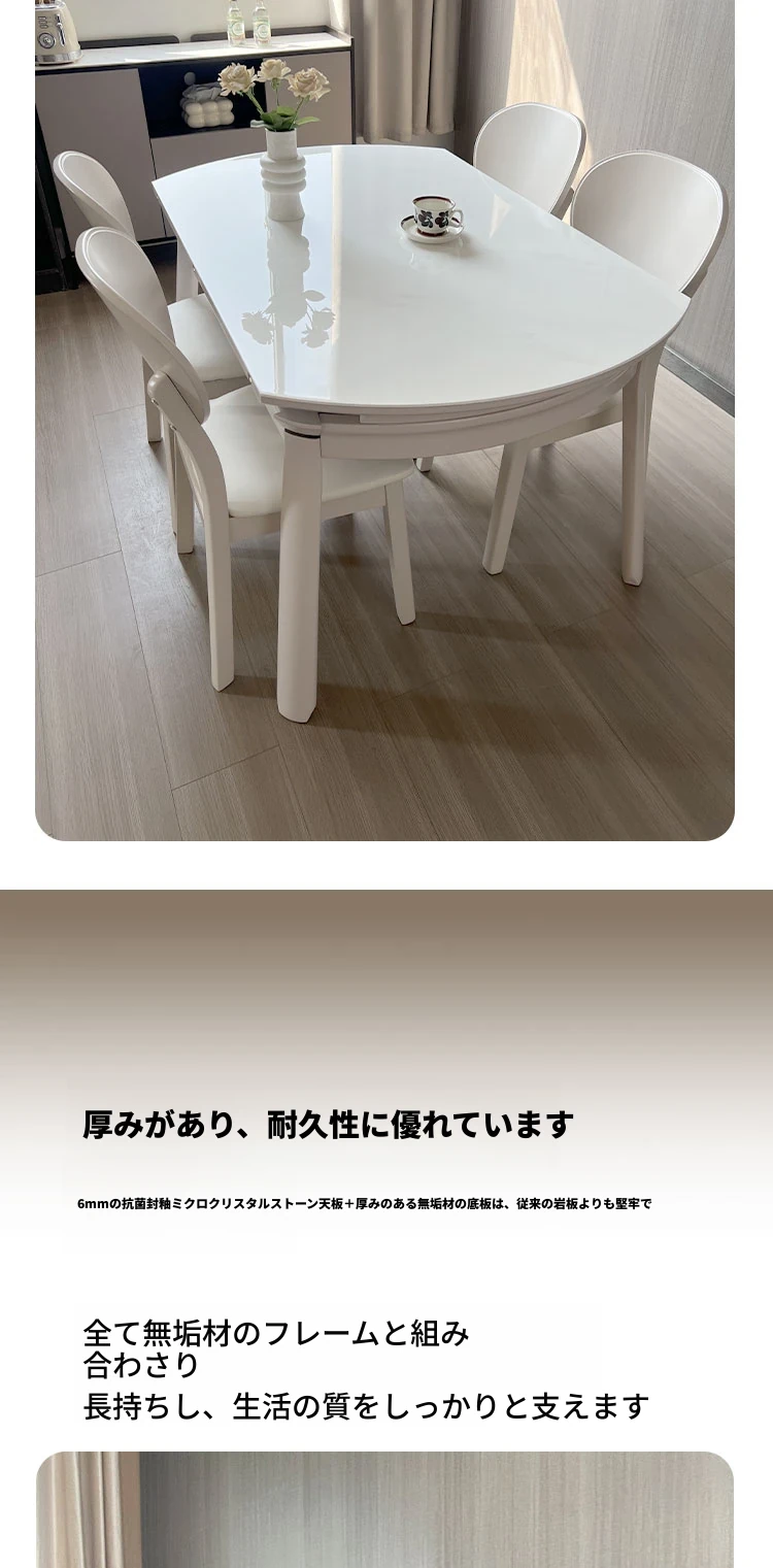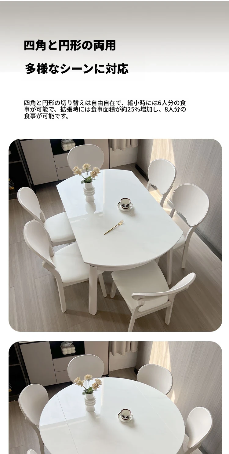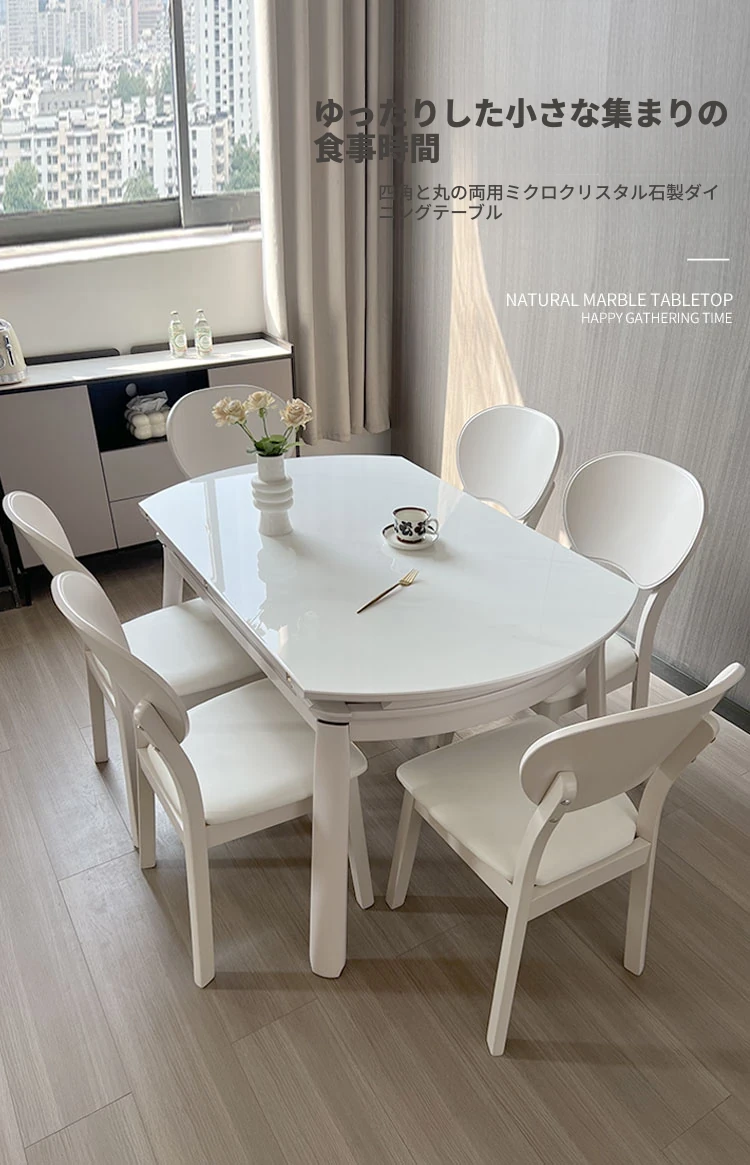 エレガントなフレンチスタイルの大理石ダイニングテーブルセット - 拡張可能な円形デザイン、上質なホワイトウッド仕上げ、家庭にぴったりの高級感あふれるインテリアアイテム!