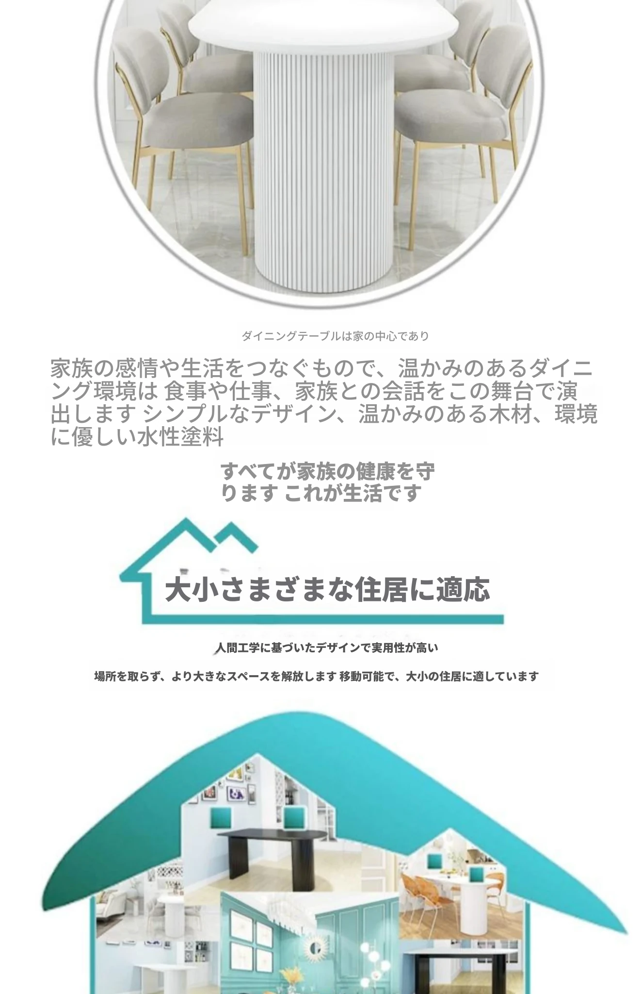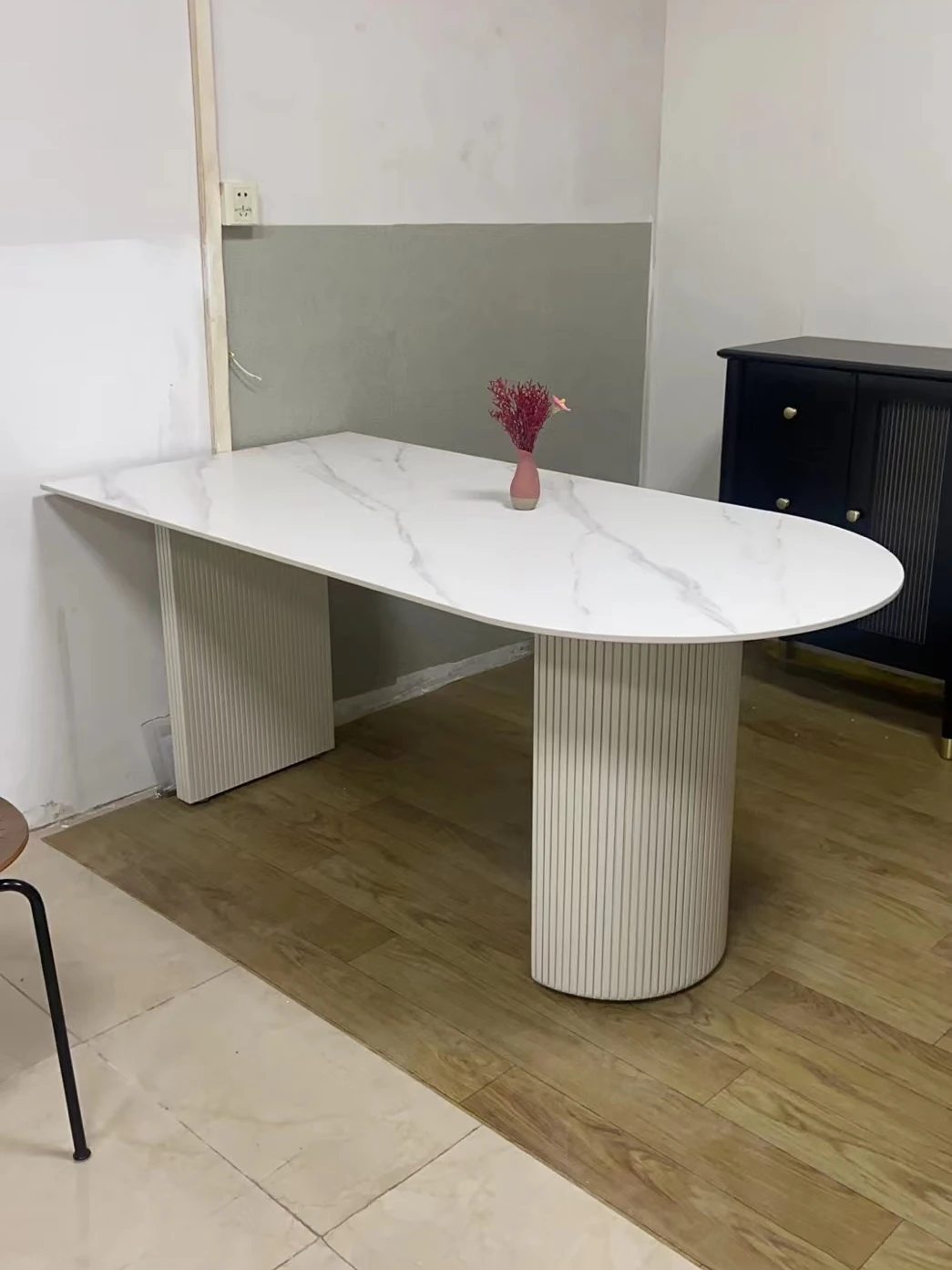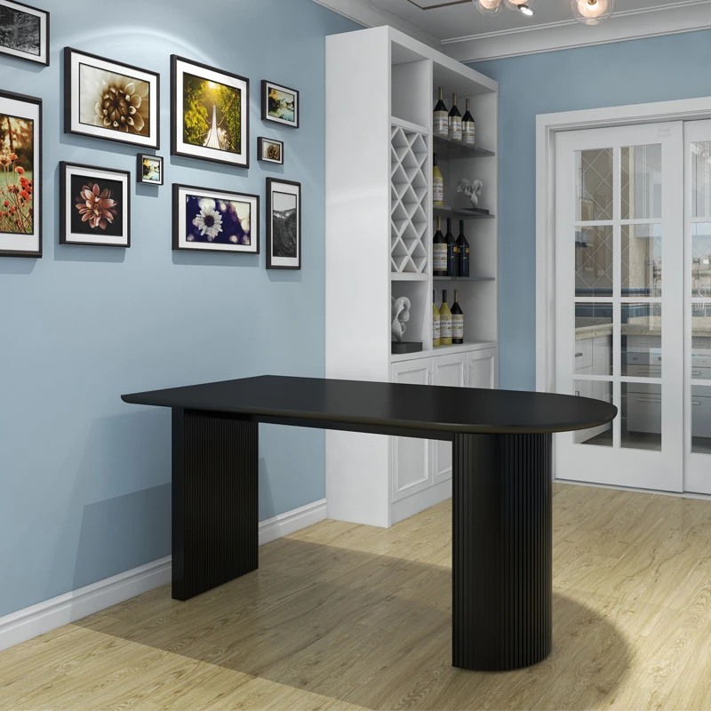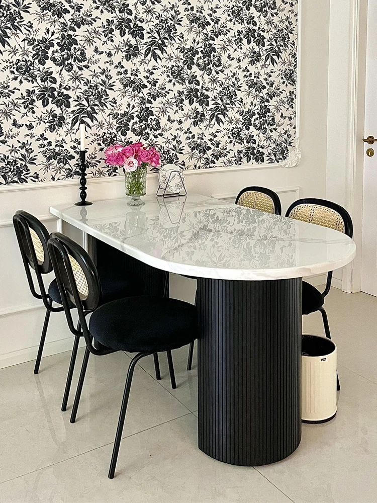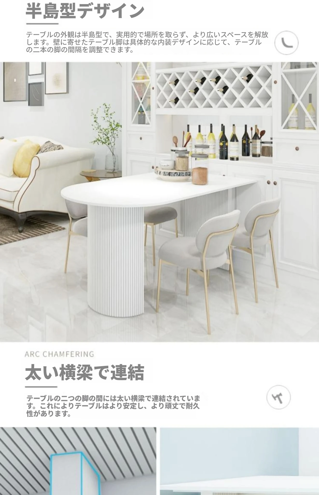 フランス風クリーム仕上げの小型アイランド型ダイニングテーブル - 壁掛けデザイン、天然木製のハーフサークルテーブル、エレガントな大理石仕上げでおしゃれな食事空間を演出!