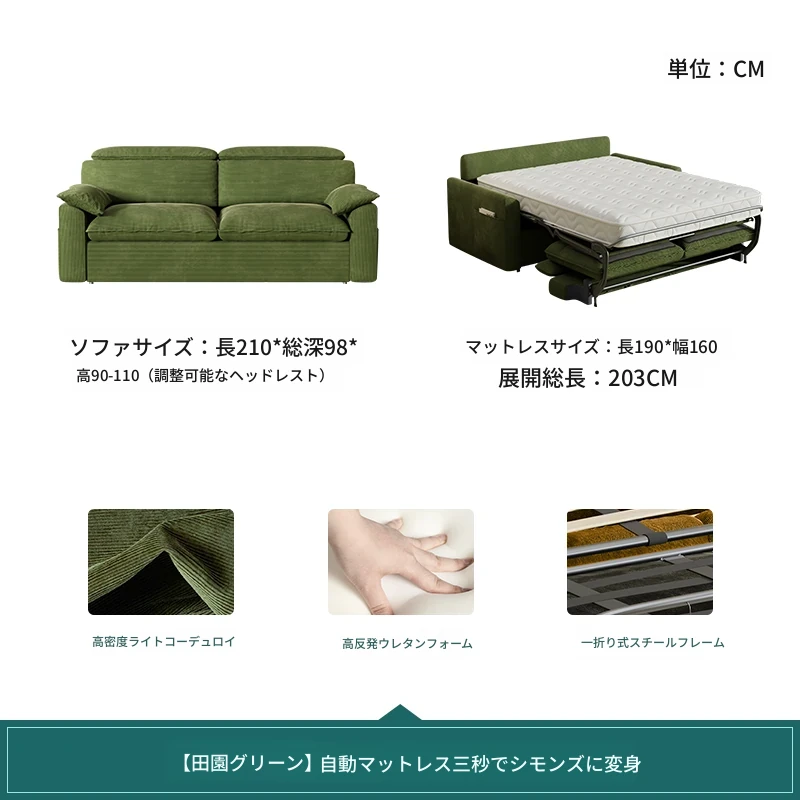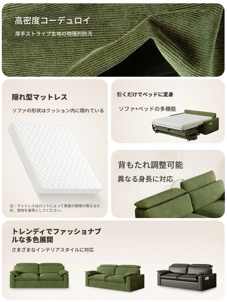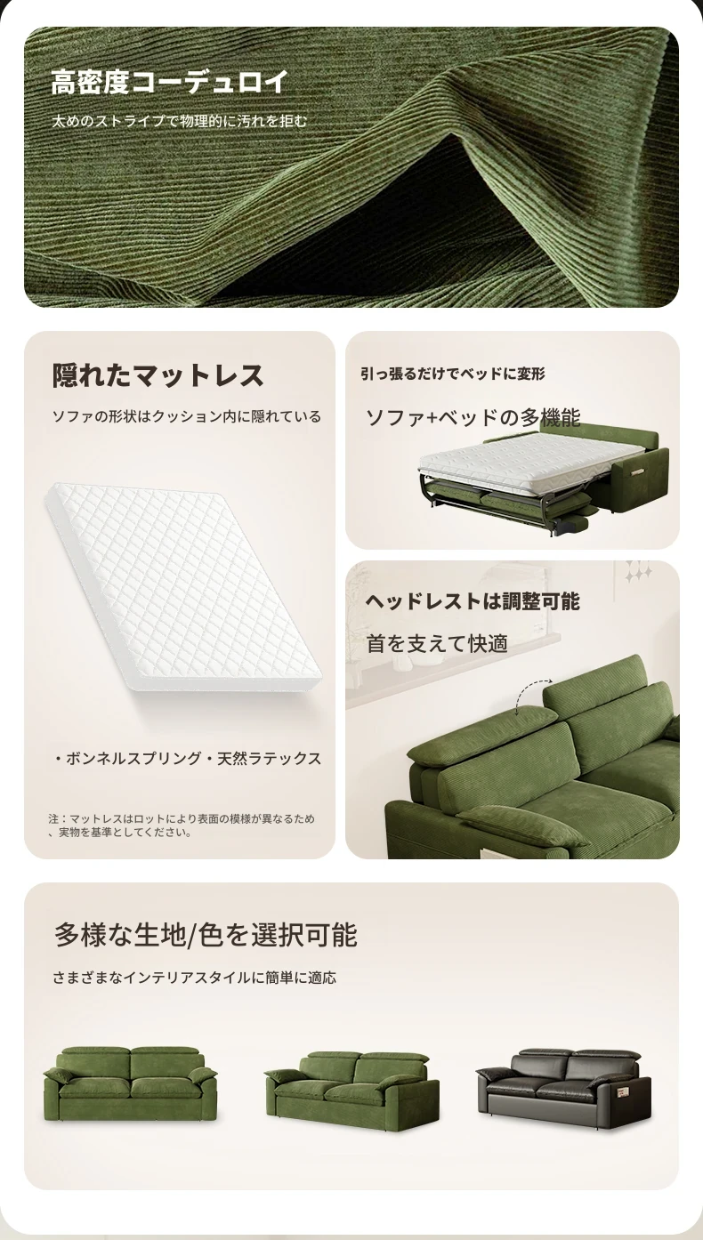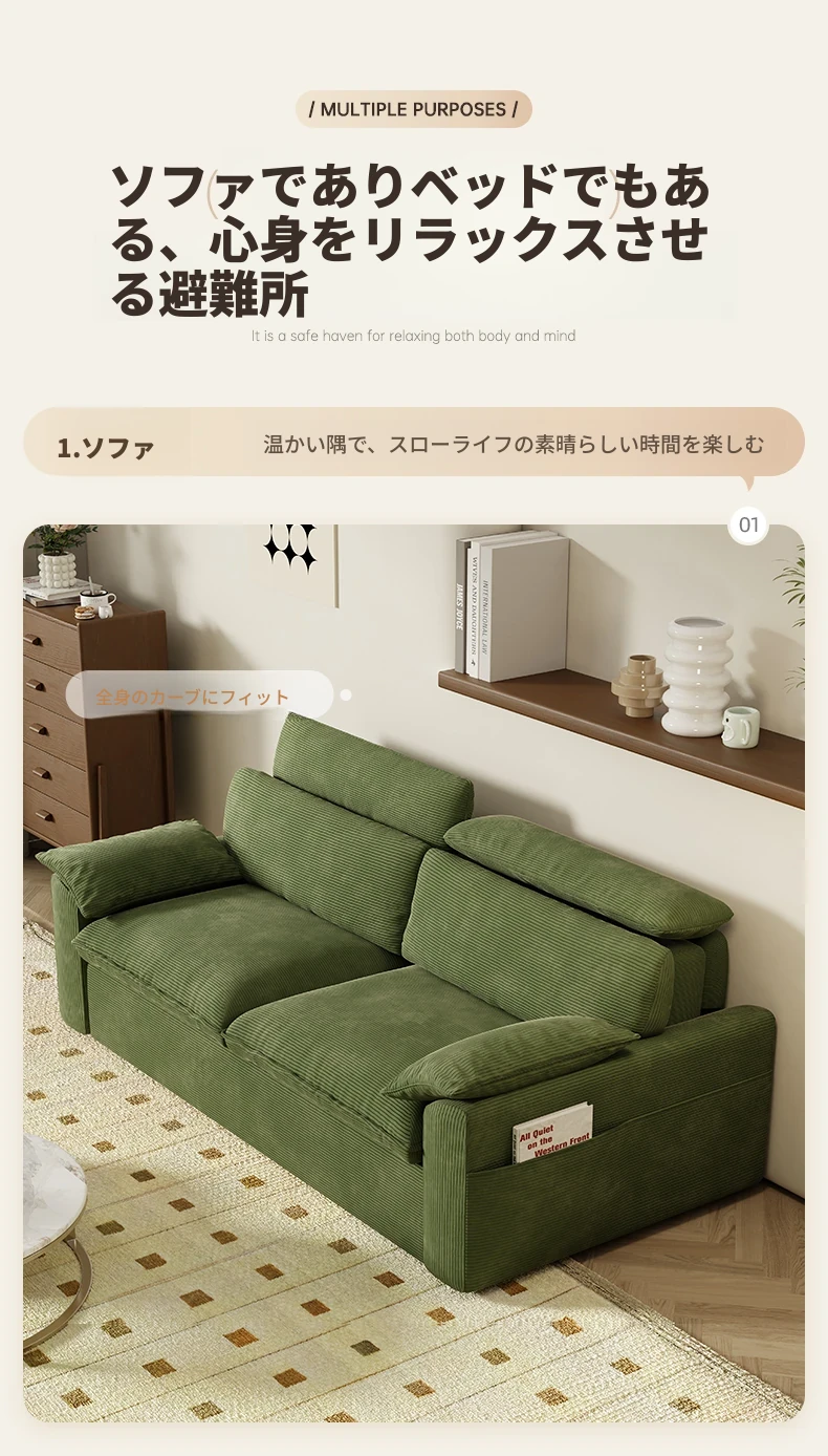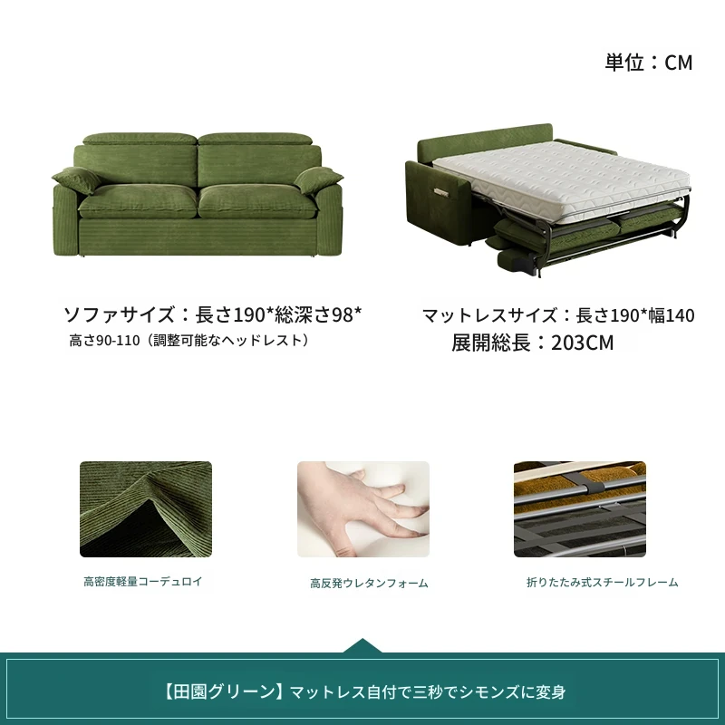2025年新款!緑のコーデュロイ折りたたみソファベッド、マットレス内蔵の2in1デザイン、快適なヘッドレスト付きで、リビングにも寝室にも最適!