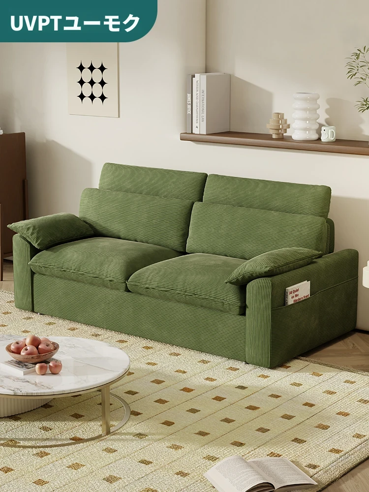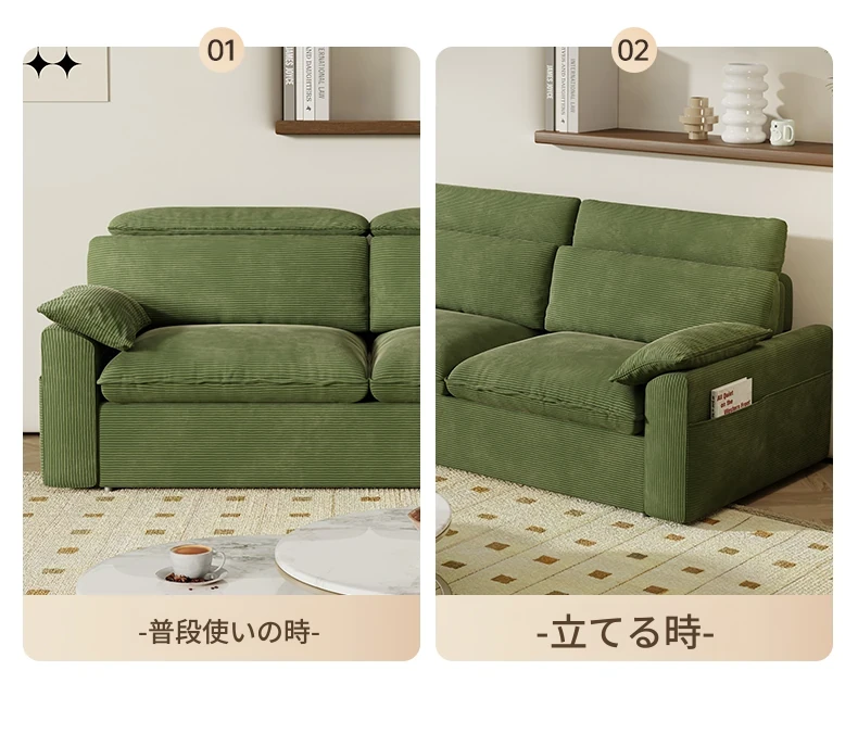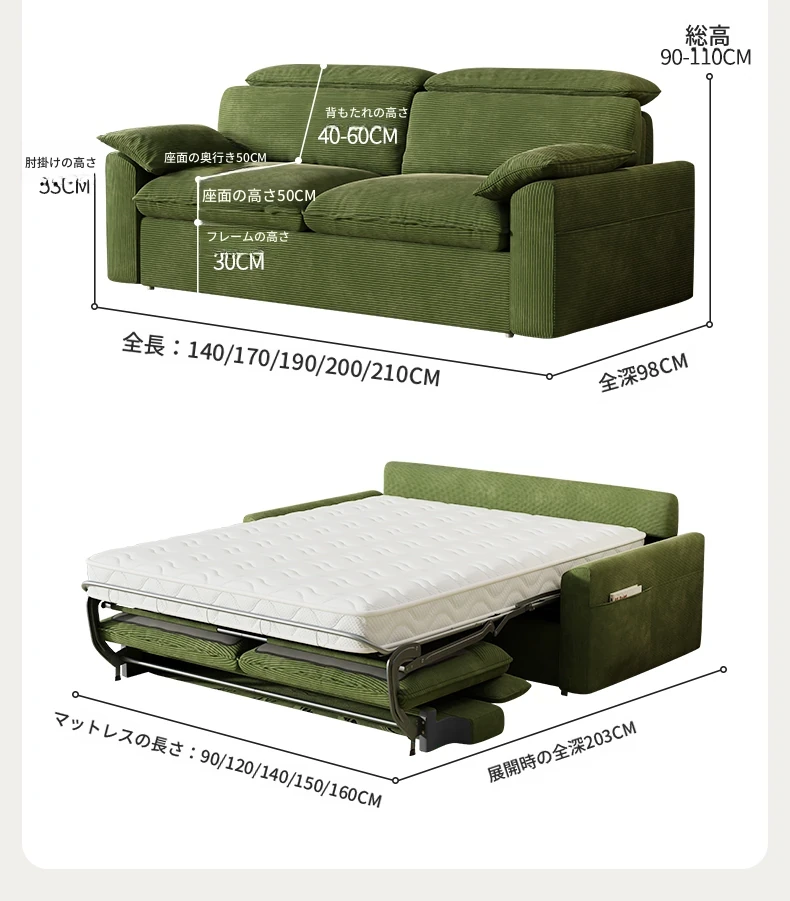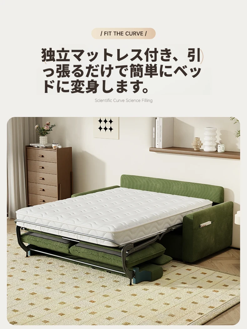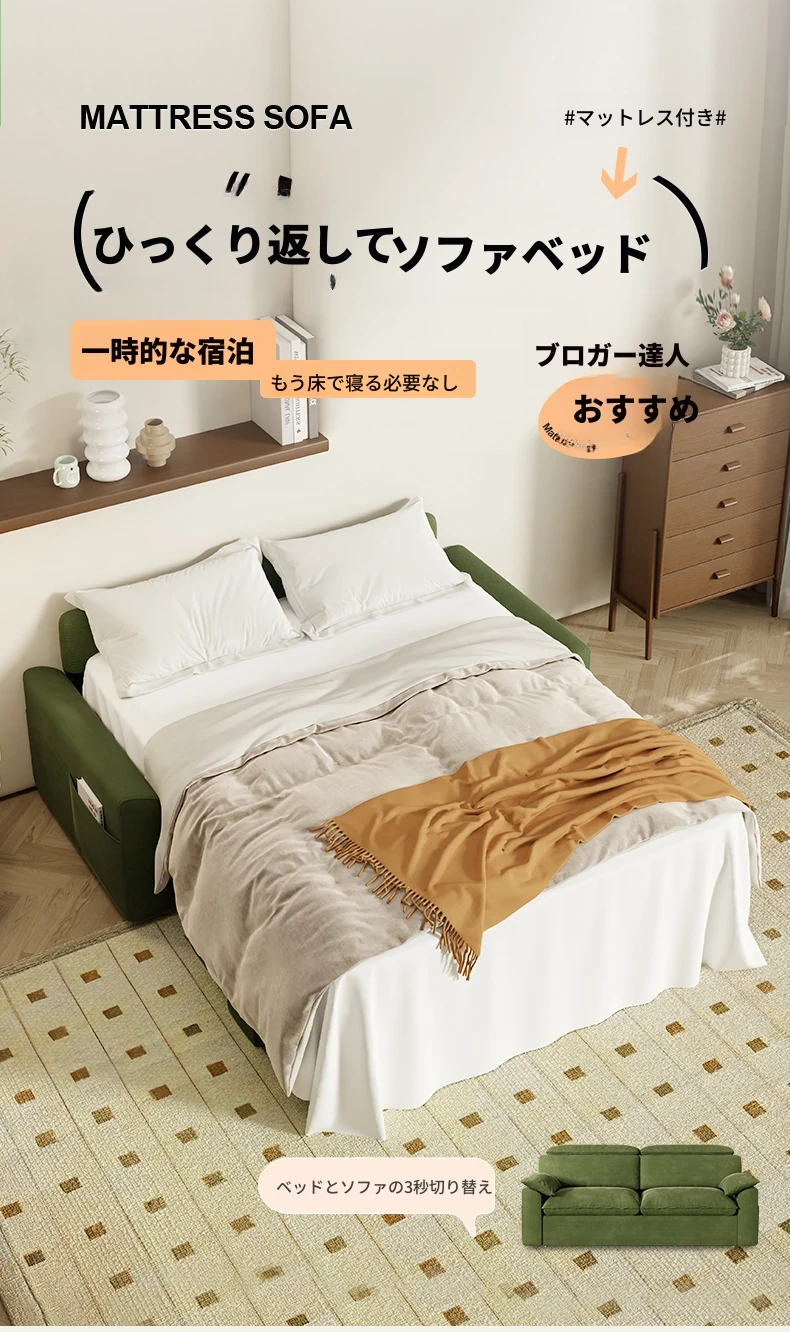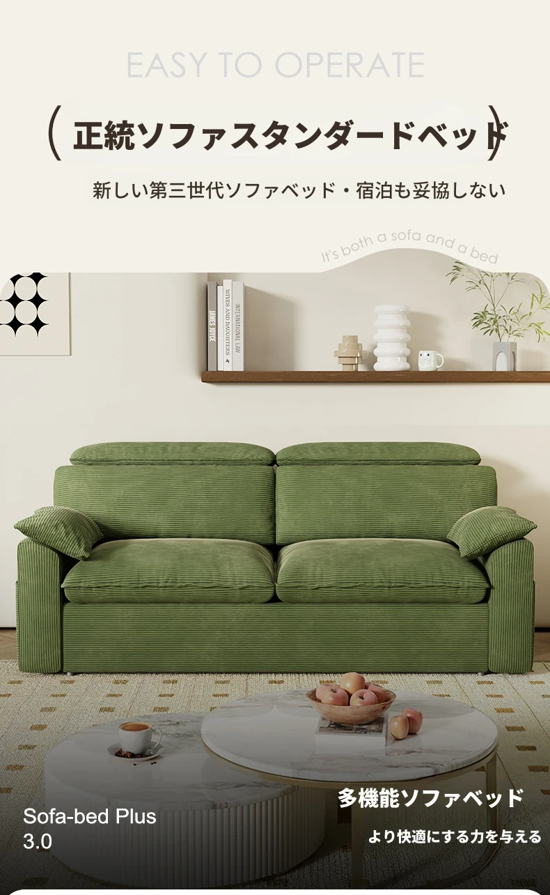 2025年新款!緑のコーデュロイ折りたたみソファベッド、マットレス内蔵の2in1デザイン、快適なヘッドレスト付きで、リビングにも寝室にも最適!