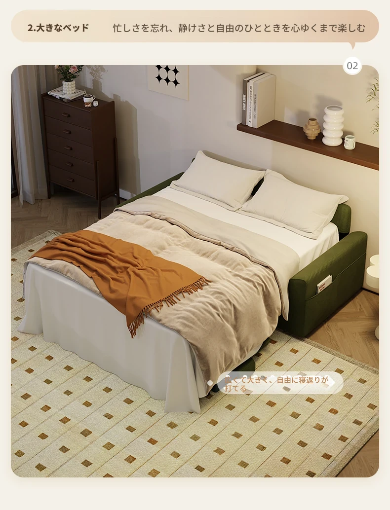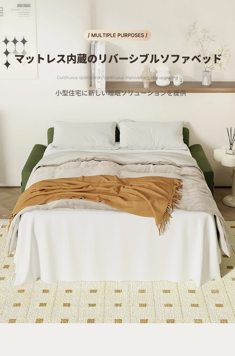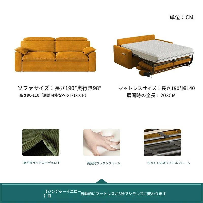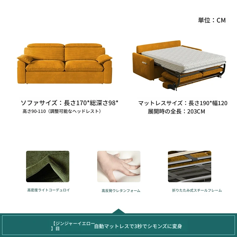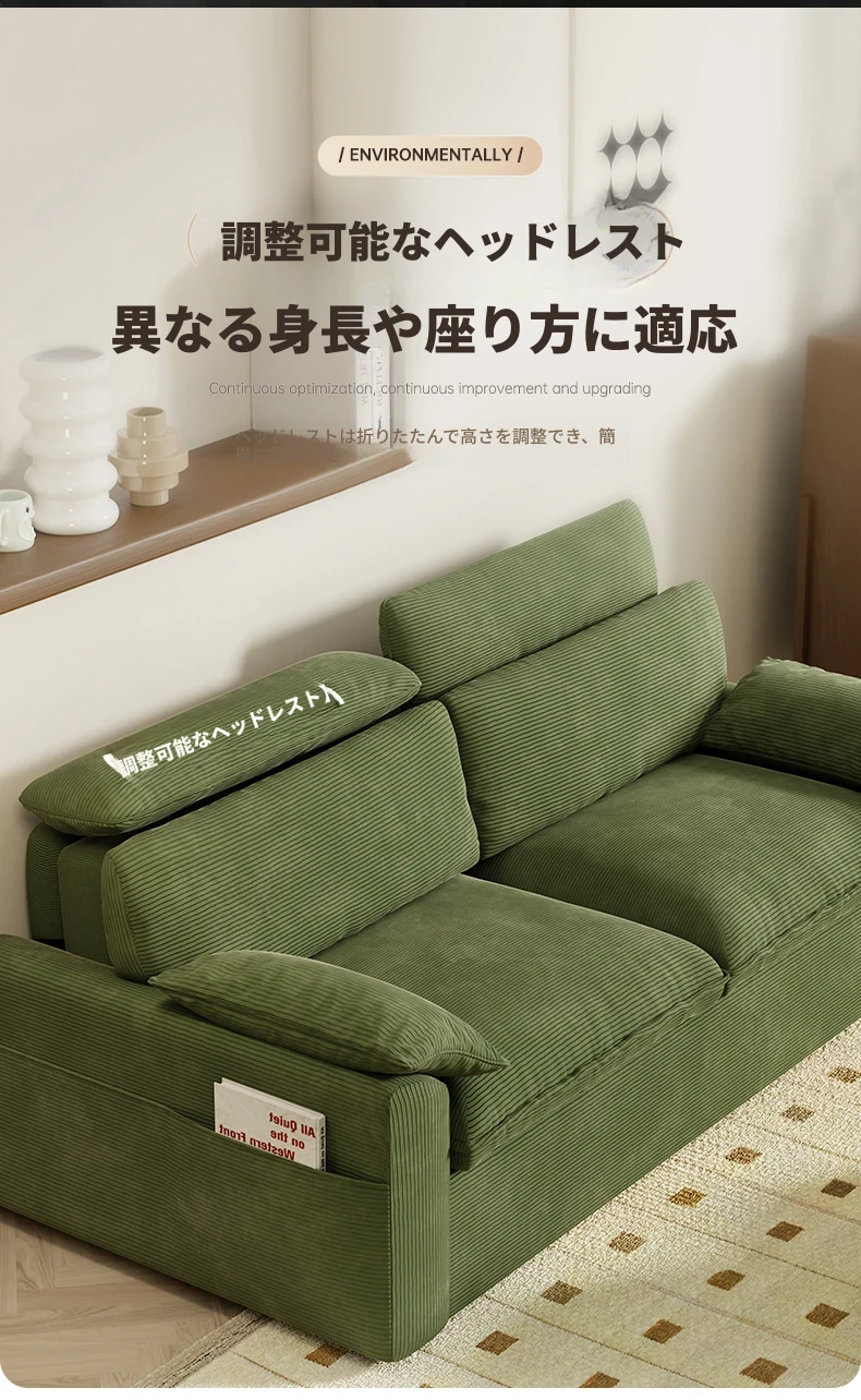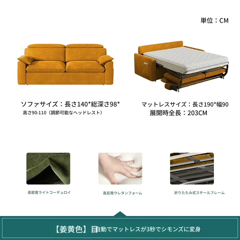 2025年新款!緑のコーデュロイ折りたたみソファベッド、マットレス内蔵の2in1デザイン、快適なヘッドレスト付きで、リビングにも寝室にも最適!