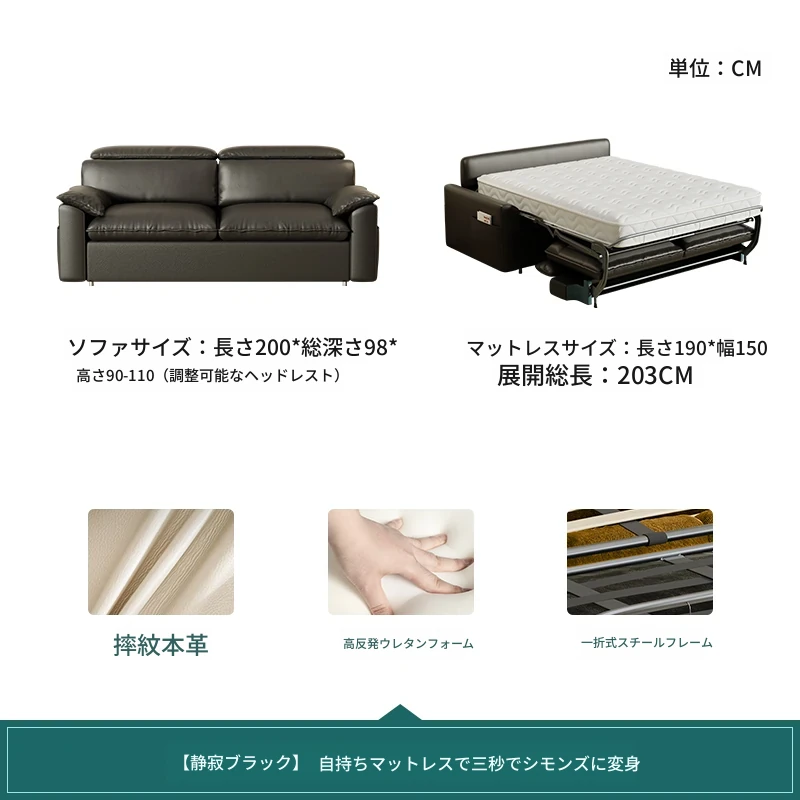 エコレザー-静寂なブラック200CM【ラテックスマットレス含む】