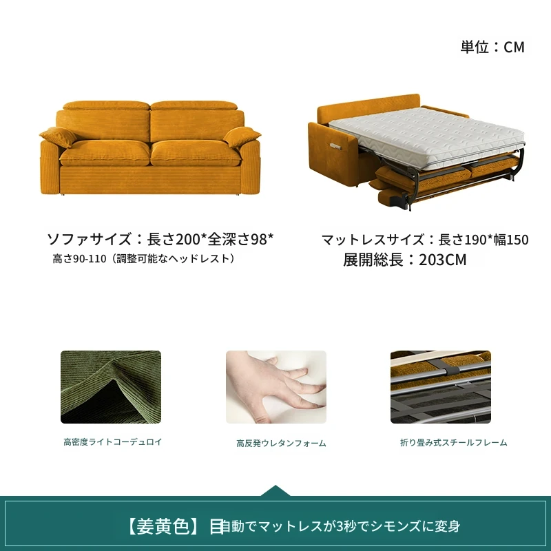 コーデュロイ-ショウガイエロー210CM【ラテックスマットレス含む】