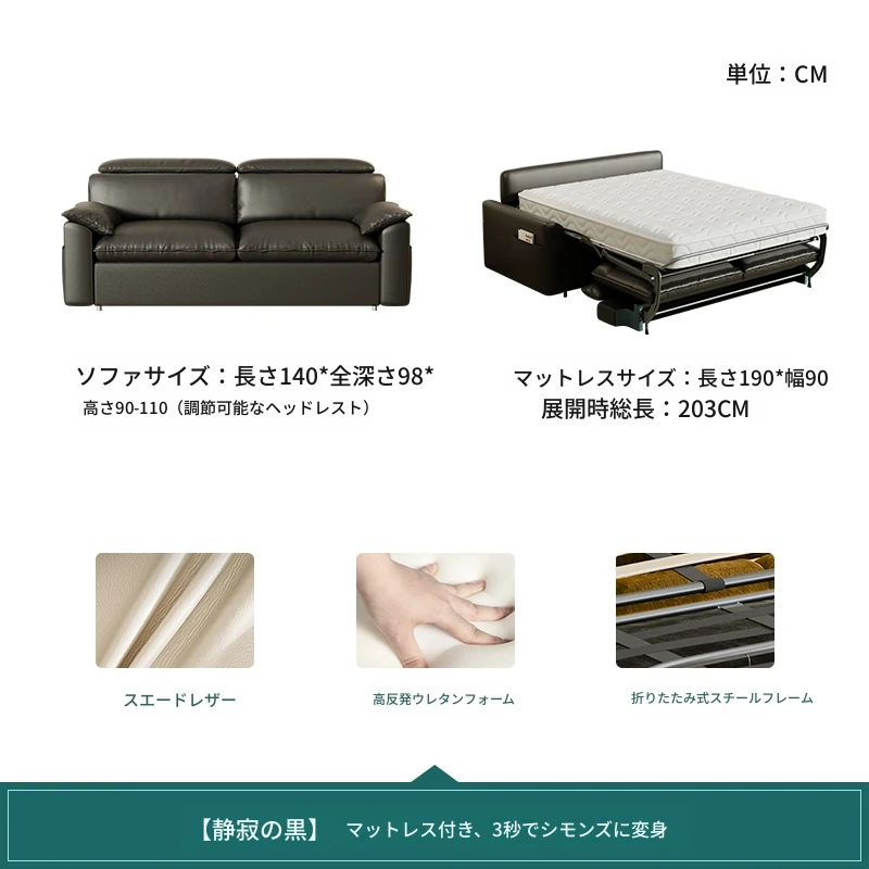 エコレザー-静寂なブラック210CM【ラテックスマットレス含む】
