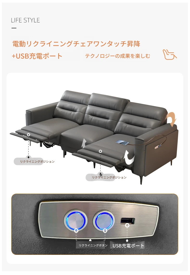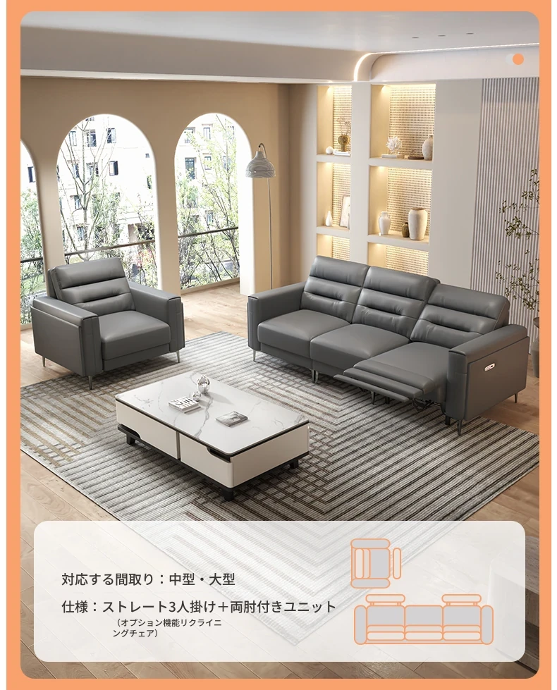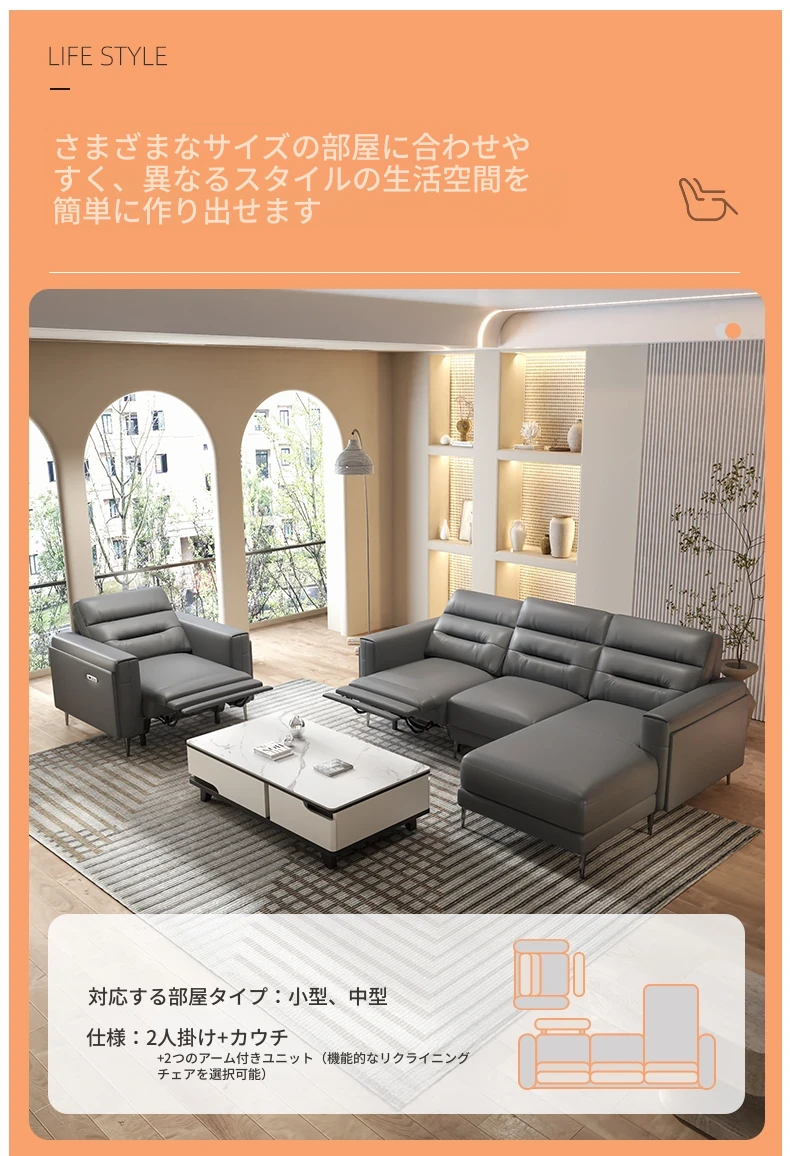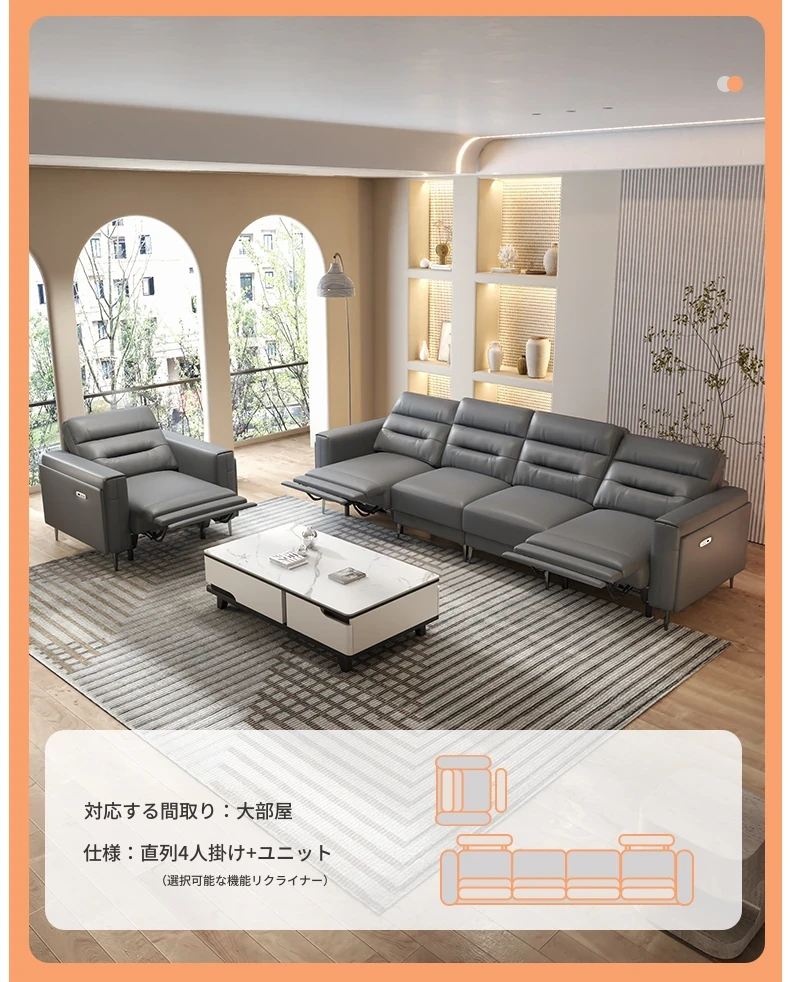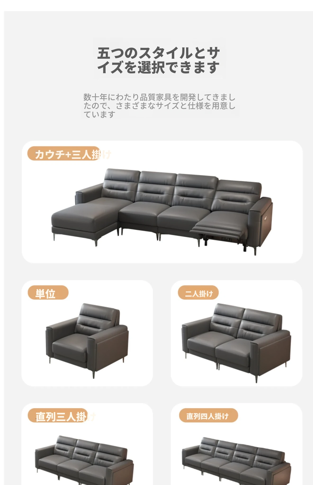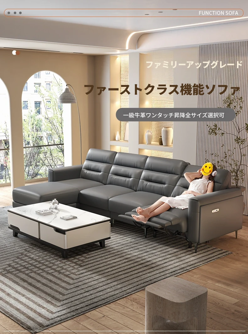 ラグジュアリーなリビングにぴったり!電動多機能ファーストクラスソファー、上質な本革(牛革)使用。どんなサイズのお部屋にも対応可能なスタイリッシュなデザインで、快適なひとときをお届けします。