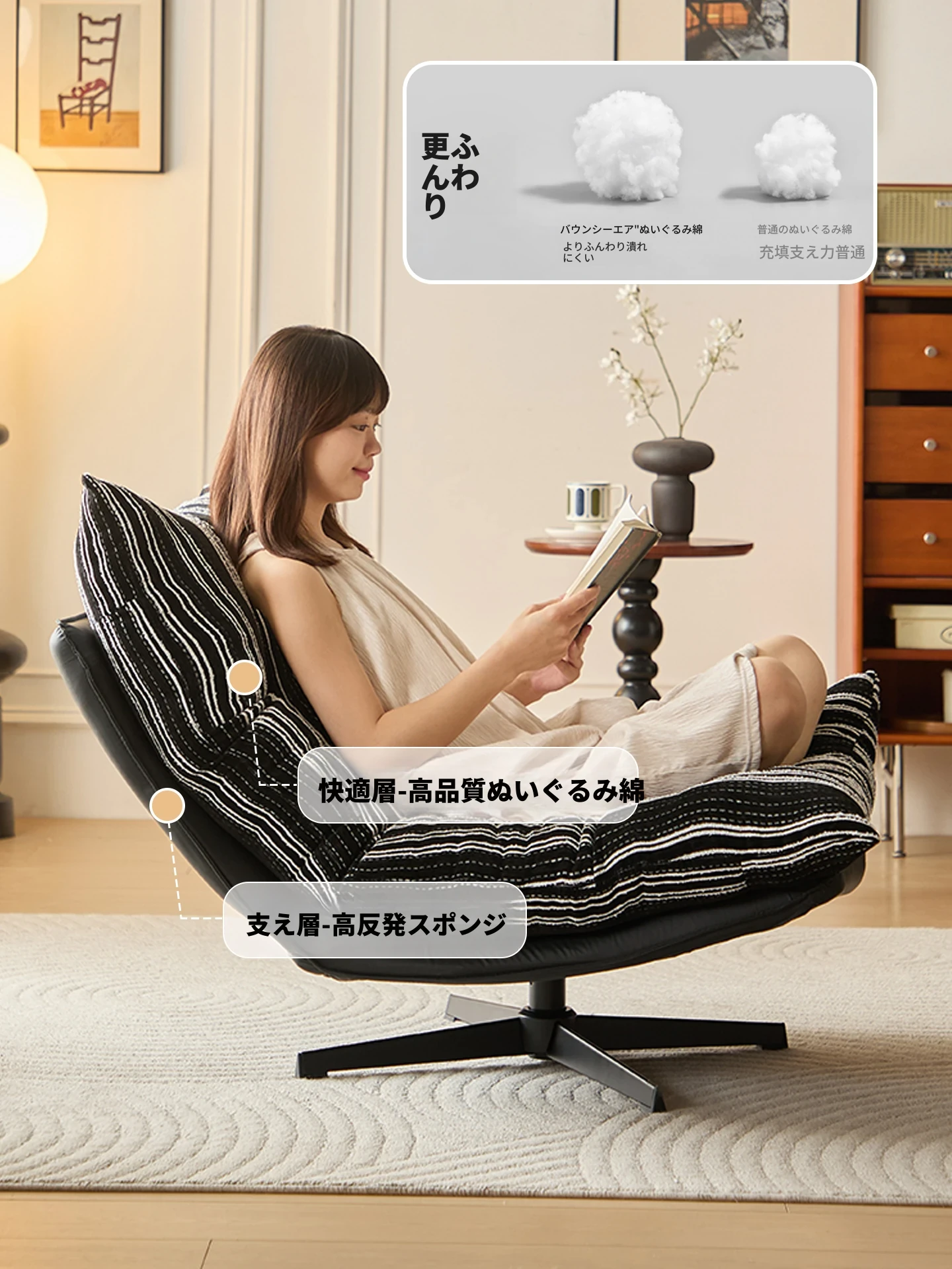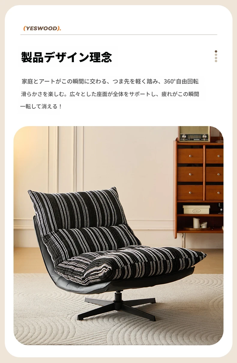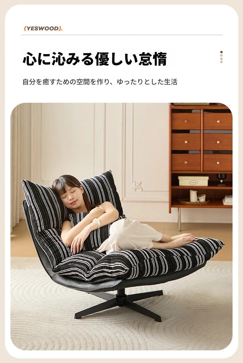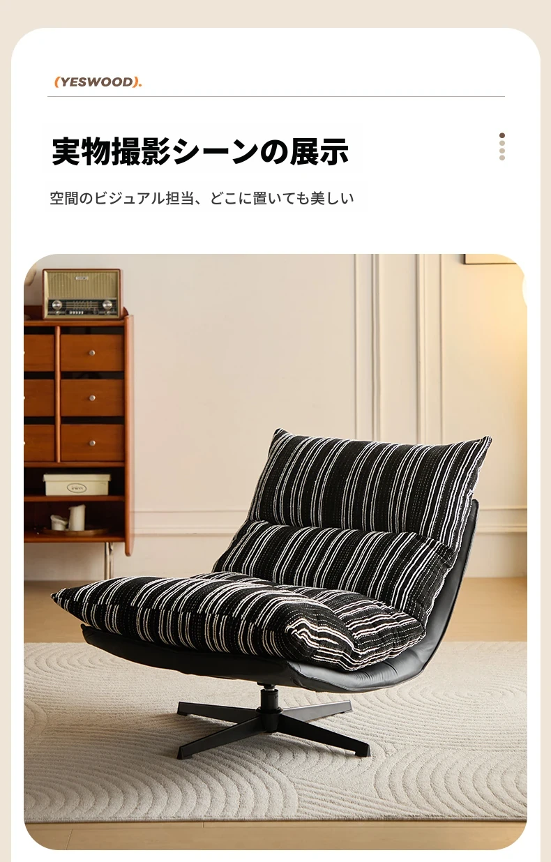 おしゃれで快適な回転式ソファチェア - リビングやバルコニーにぴったりな軽奢な一人掛け椅子。リラックスできる背もたれ付き、寝転がれるラウンジチェアで、あなたの居住空間をより魅力的に演出します。
