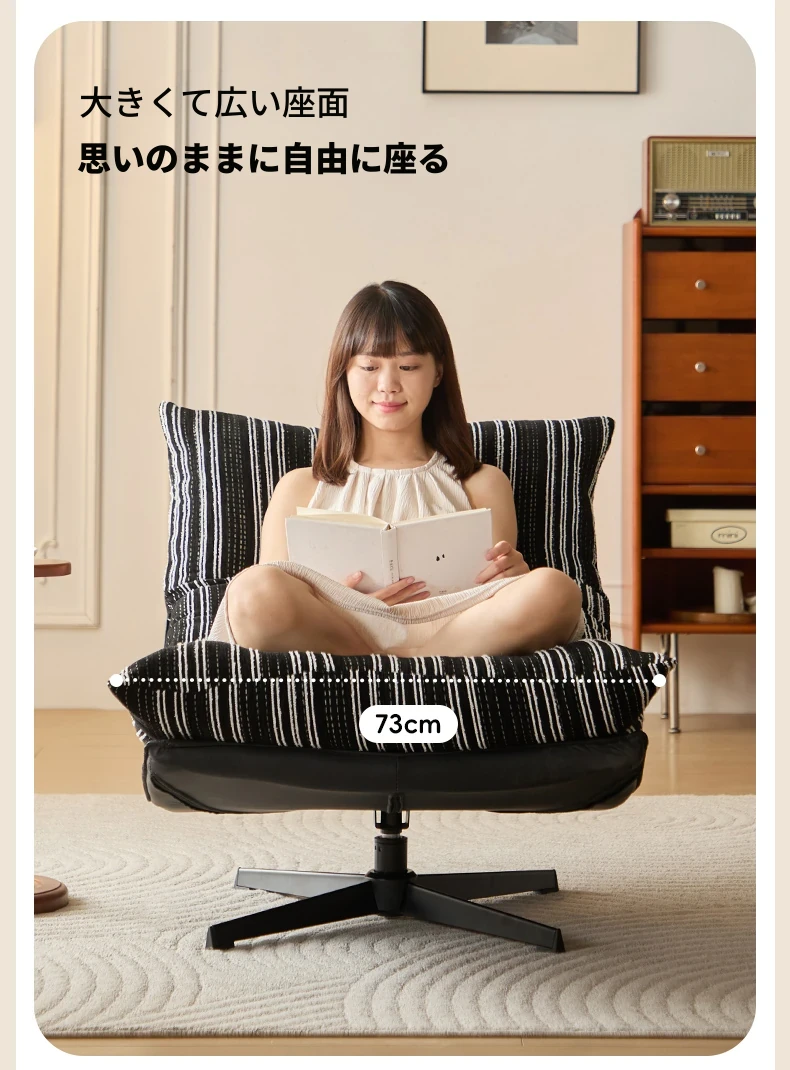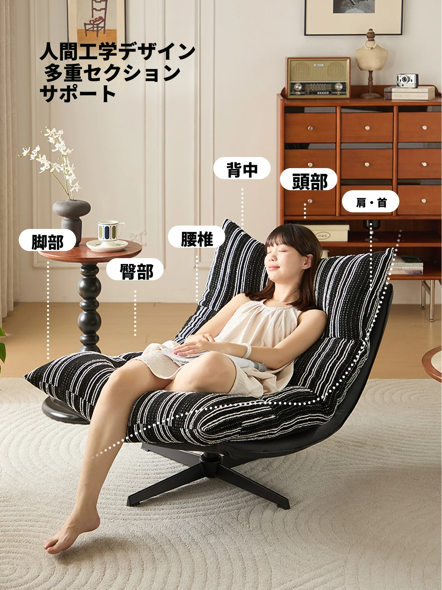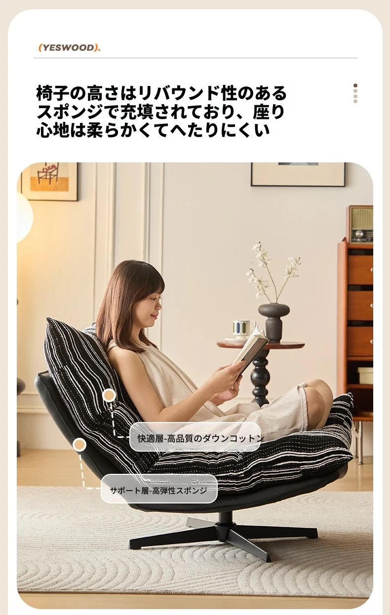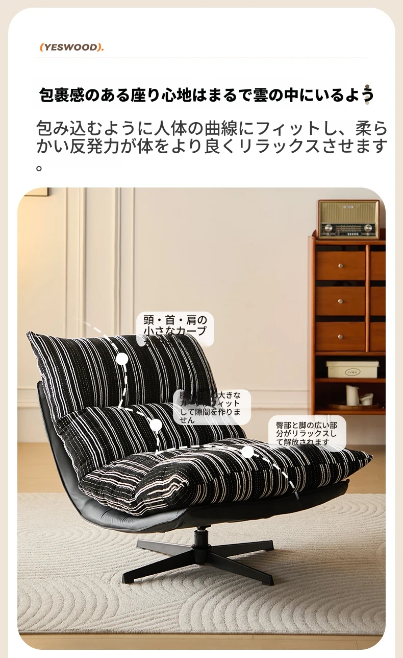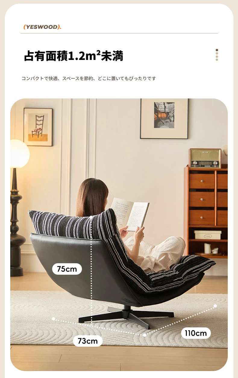 おしゃれで快適な回転式ソファチェア - リビングやバルコニーにぴったりな軽奢な一人掛け椅子。リラックスできる背もたれ付き、寝転がれるラウンジチェアで、あなたの居住空間をより魅力的に演出します。