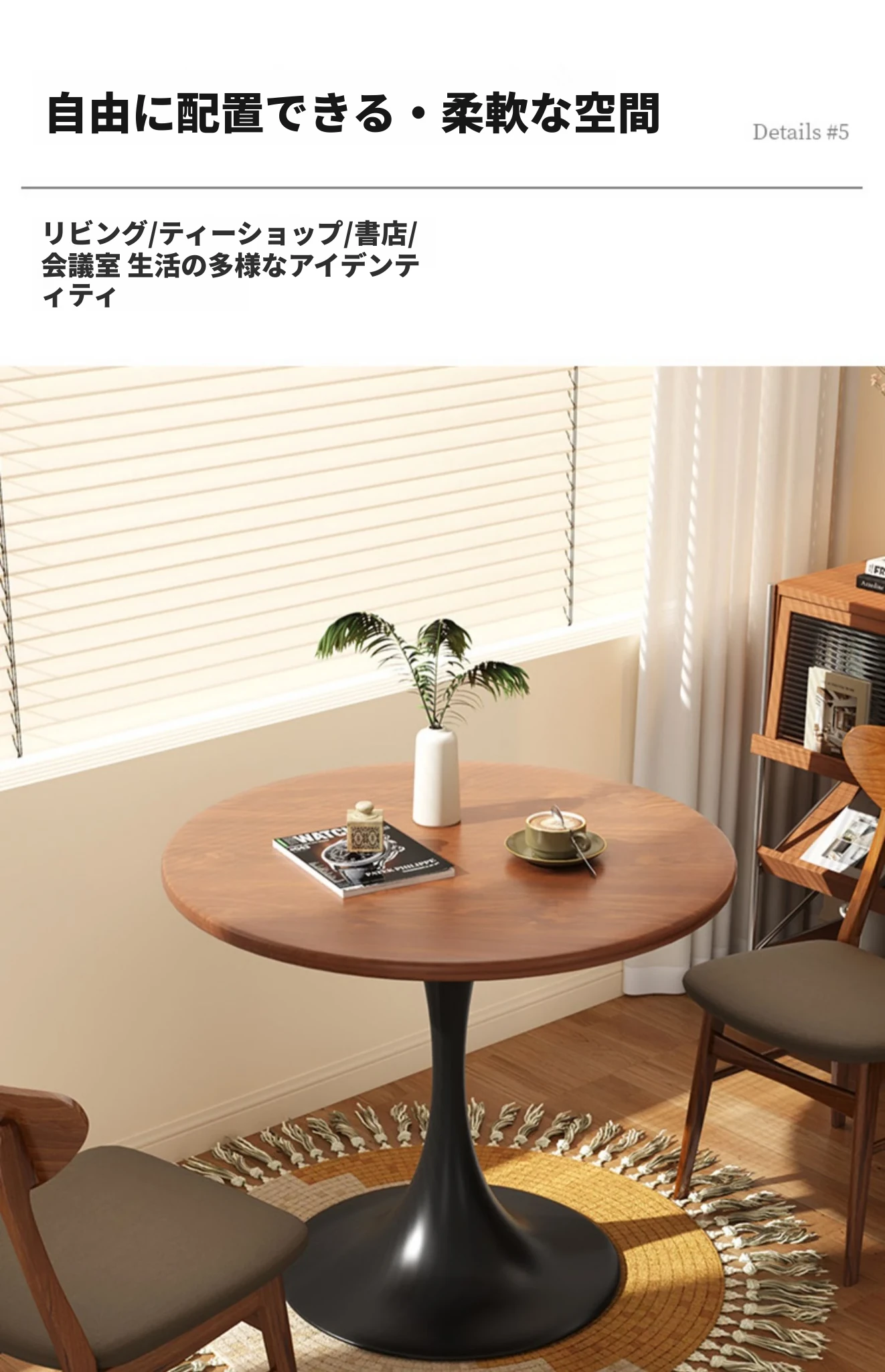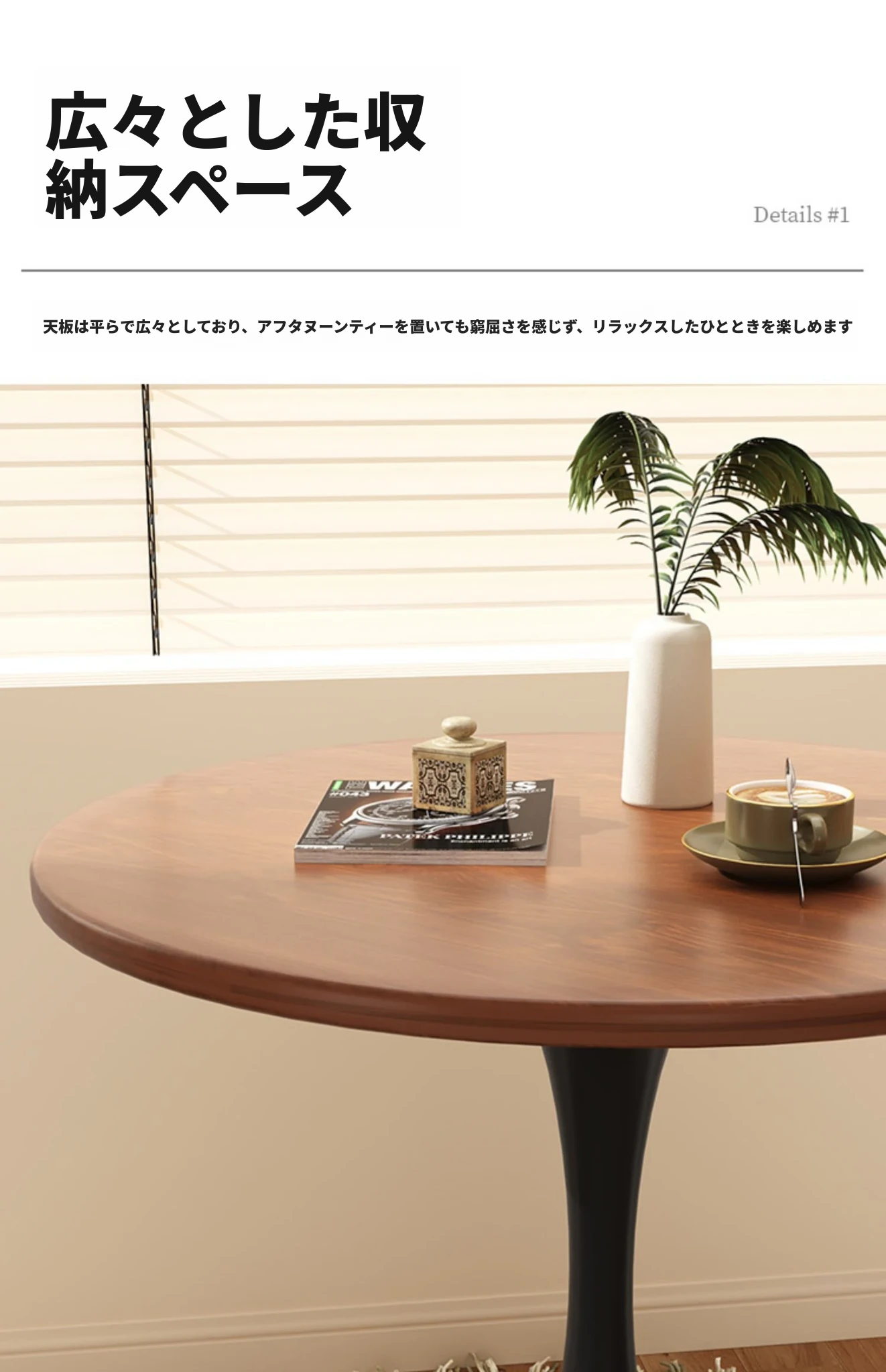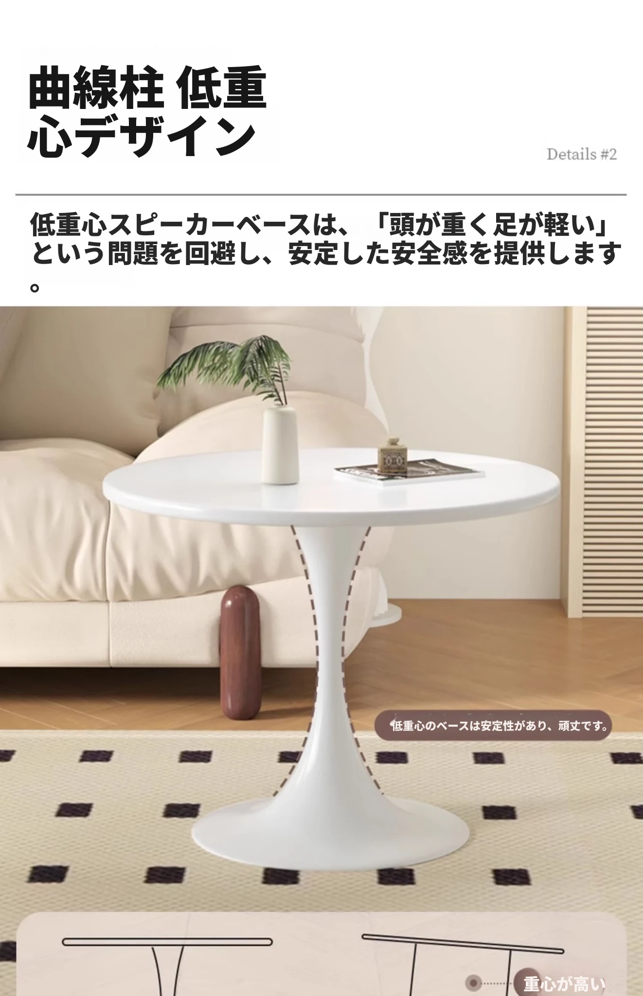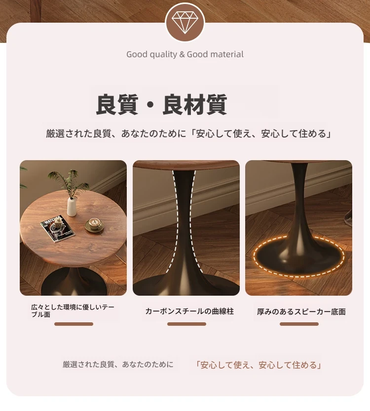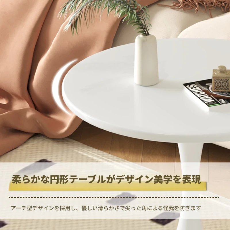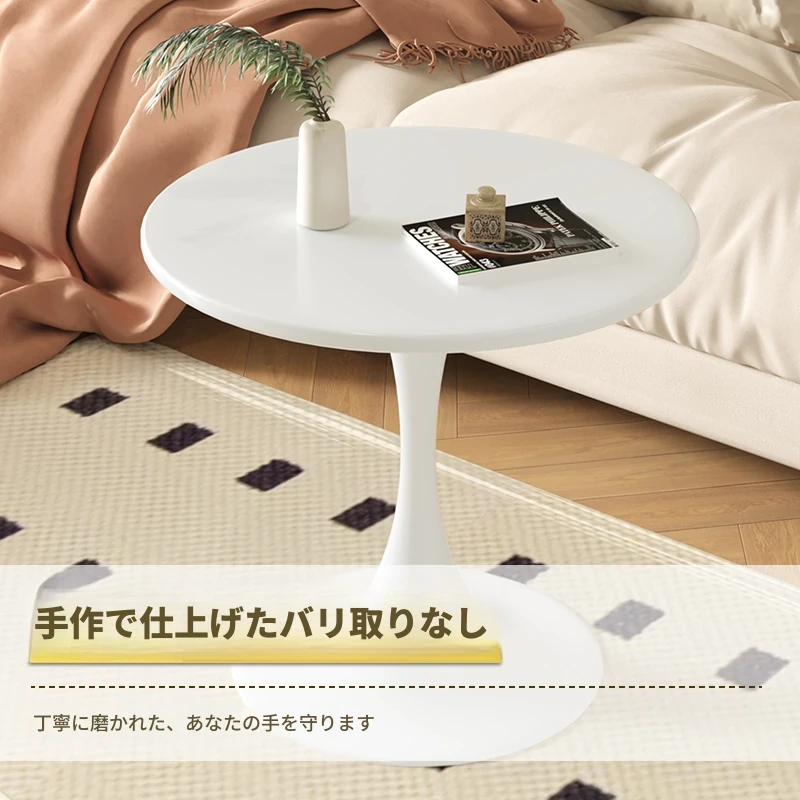 リビングにぴったり!軽やかなラグジュアリー感のあるモダンシンプルなサイドテーブル。バルコニーや窓辺にも最適な小型ラウンドテーブルで、狭いスペースでもおしゃれに使えます。
