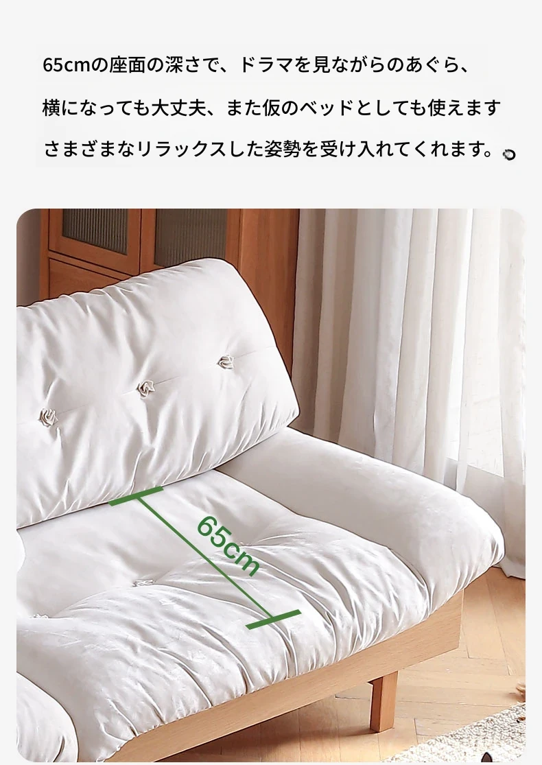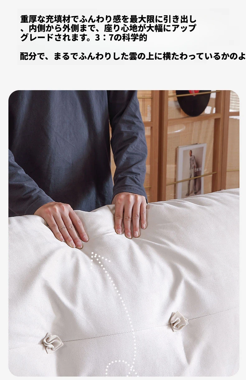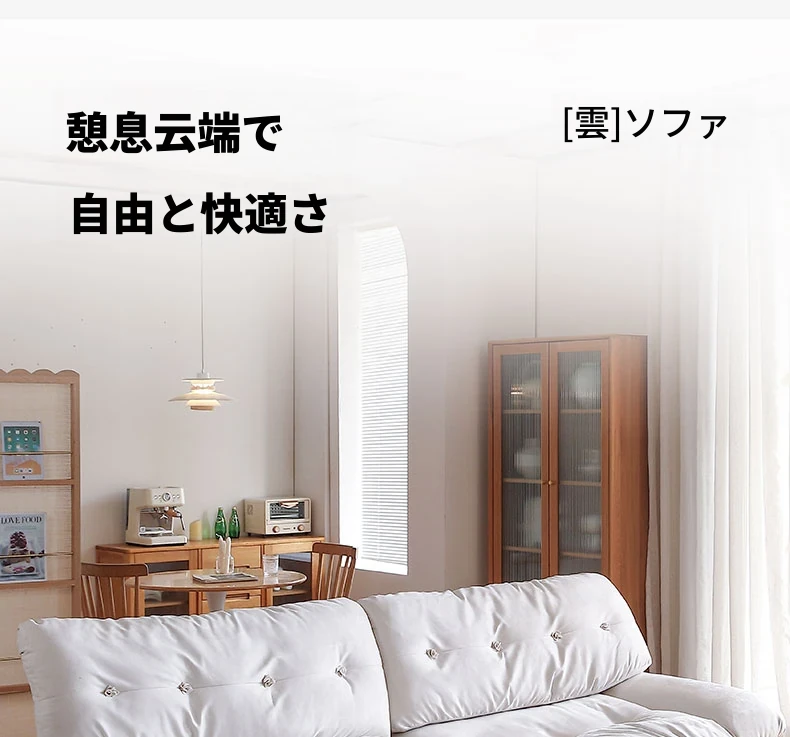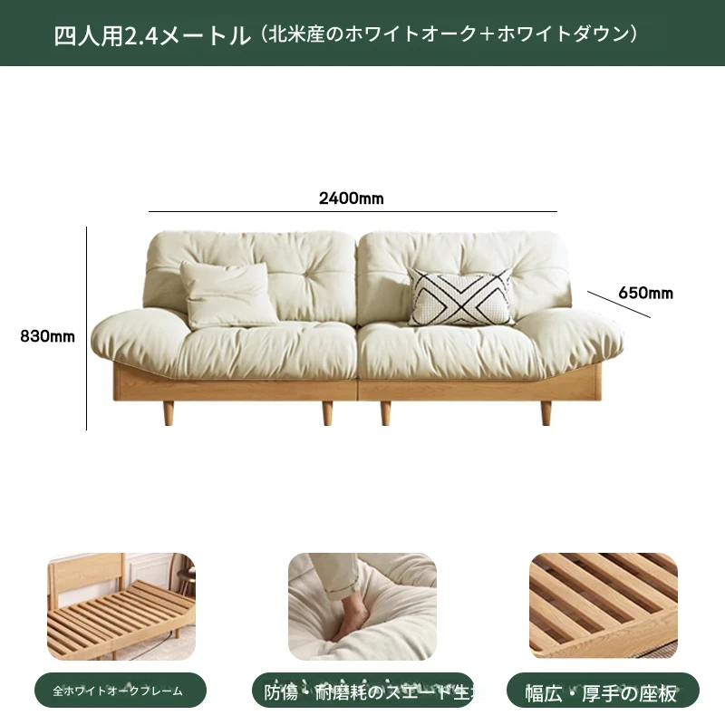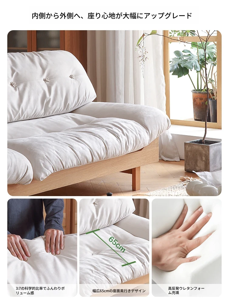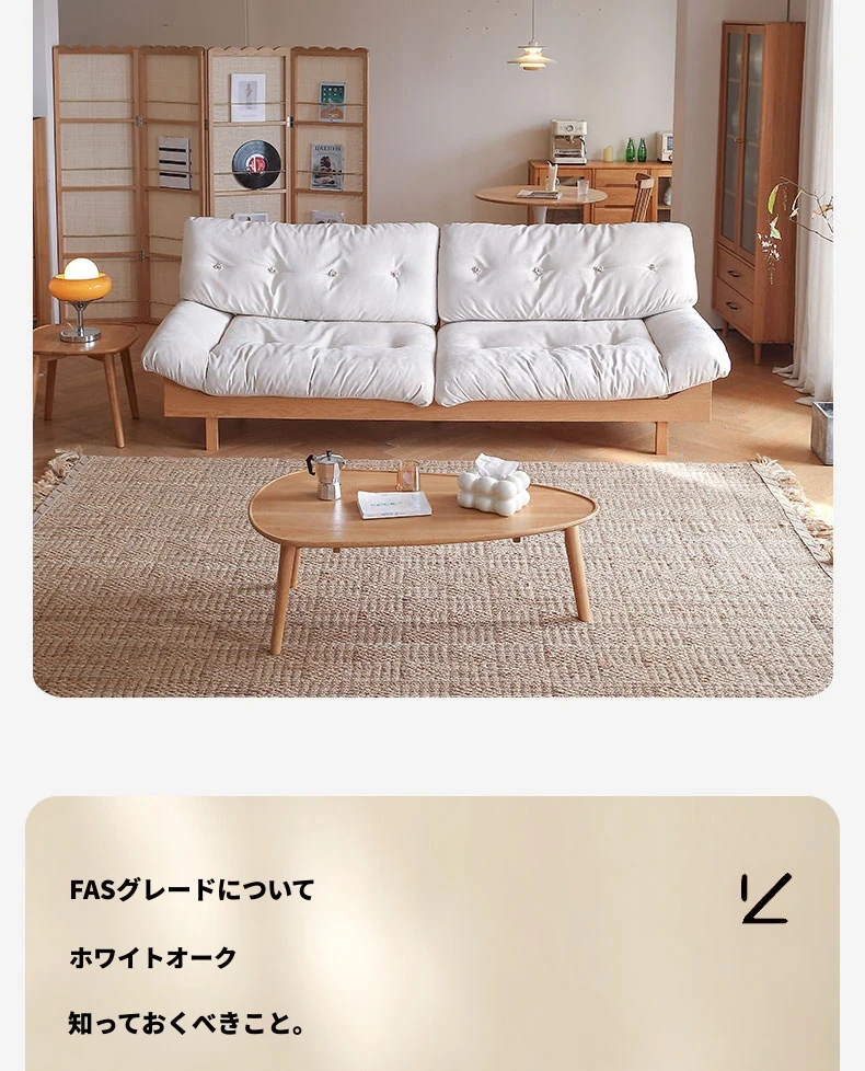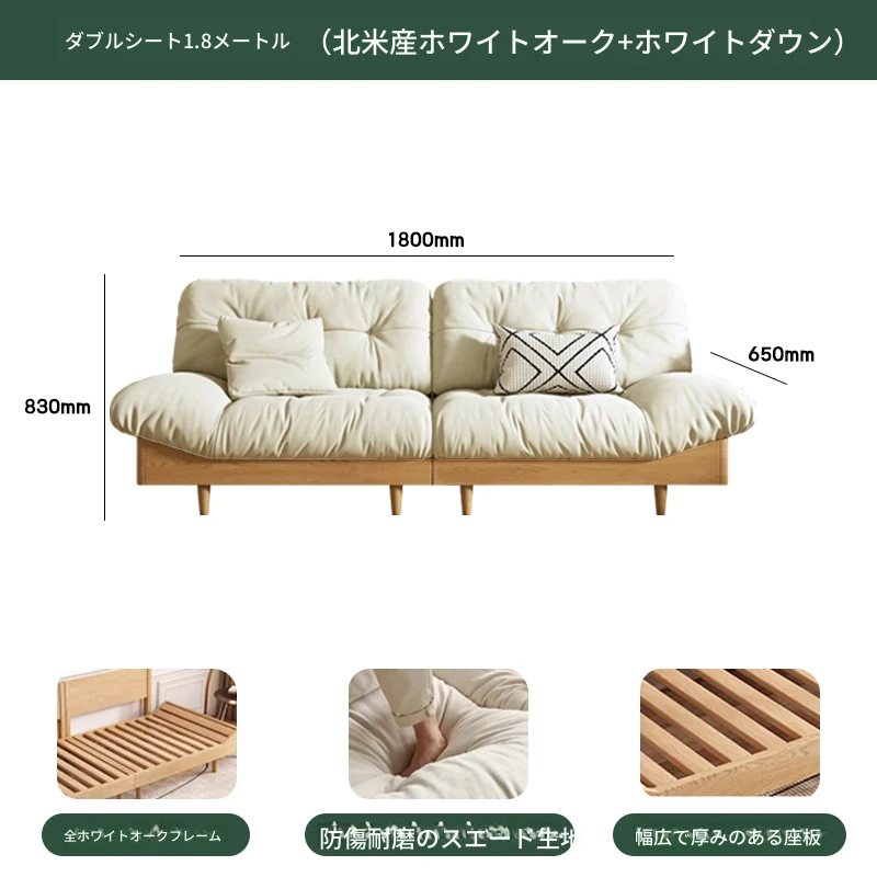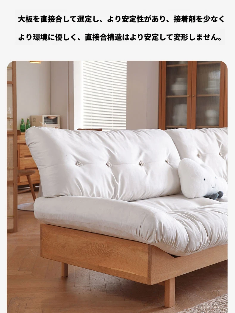 無垢材の白オーク製、雲のようなデザインのダブルソファ。小型リビングに最適な和風ミラノスタイルのファブリックソファ。心地よい座り心地で、あなたのリビングに温もりをプラス!