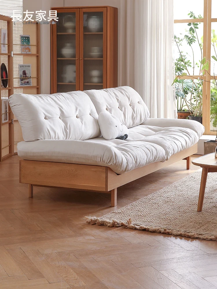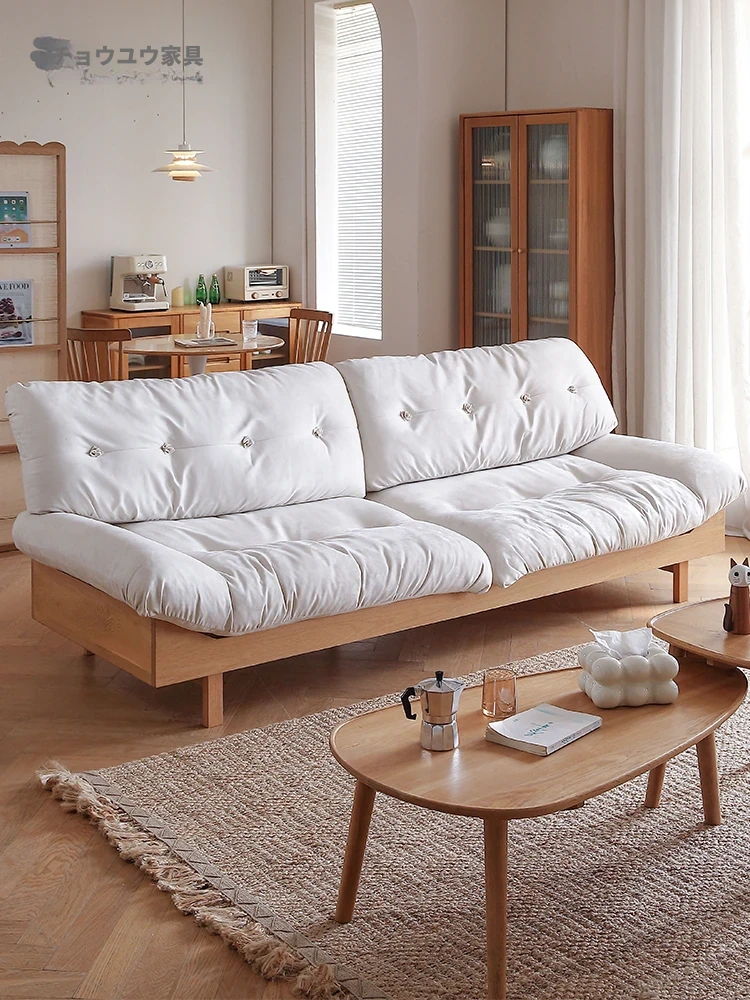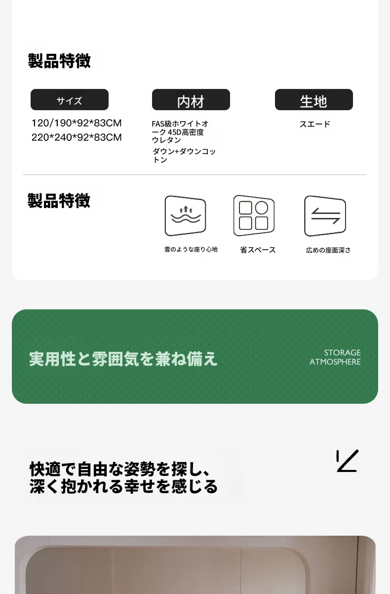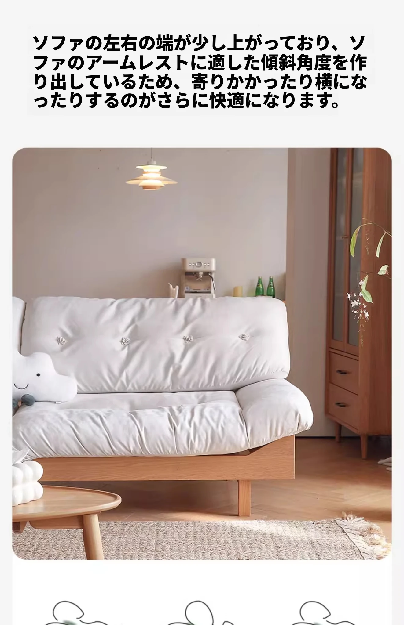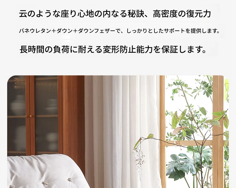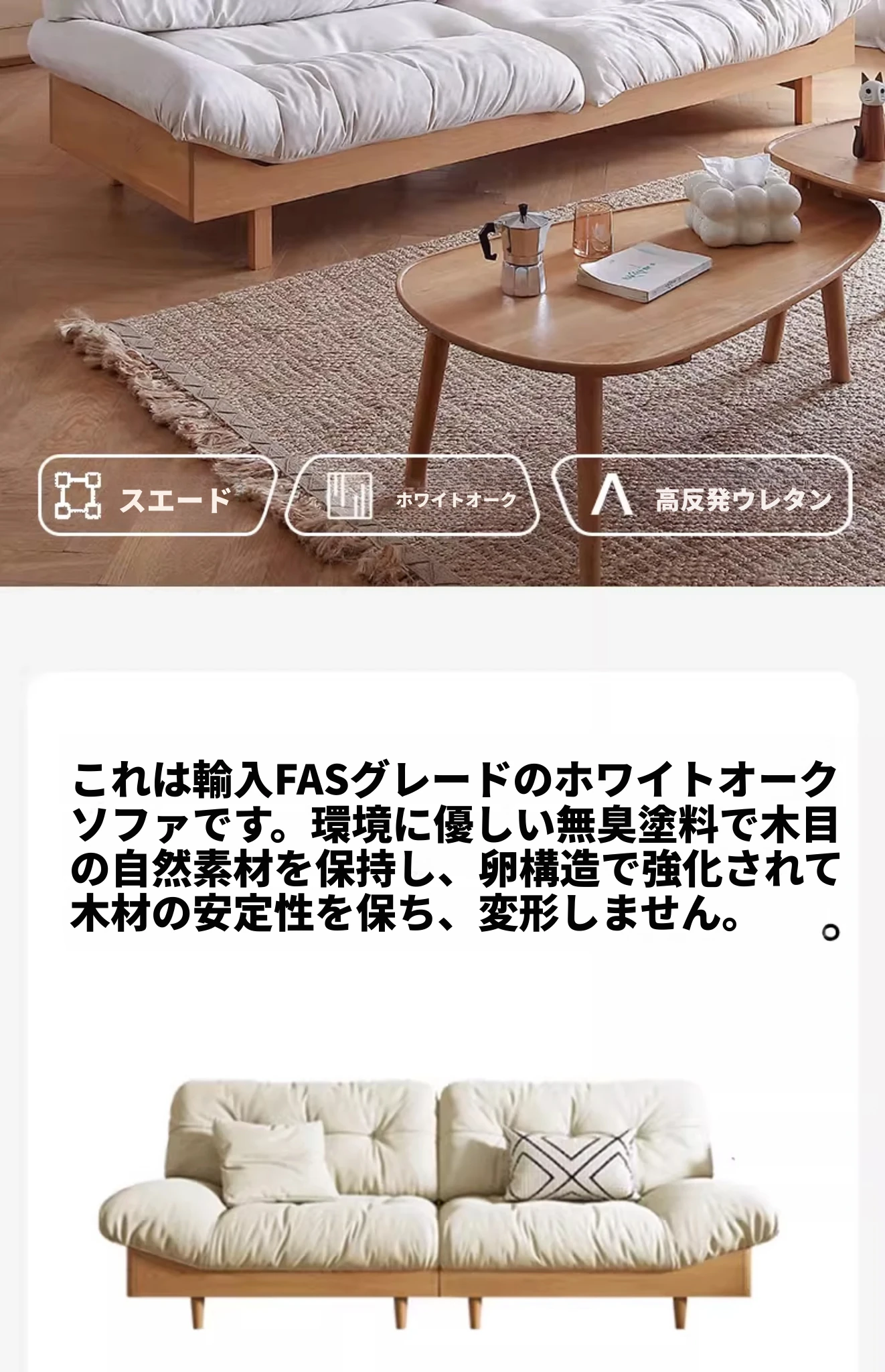 無垢材の白オーク製、雲のようなデザインのダブルソファ。小型リビングに最適な和風ミラノスタイルのファブリックソファ。心地よい座り心地で、あなたのリビングに温もりをプラス!