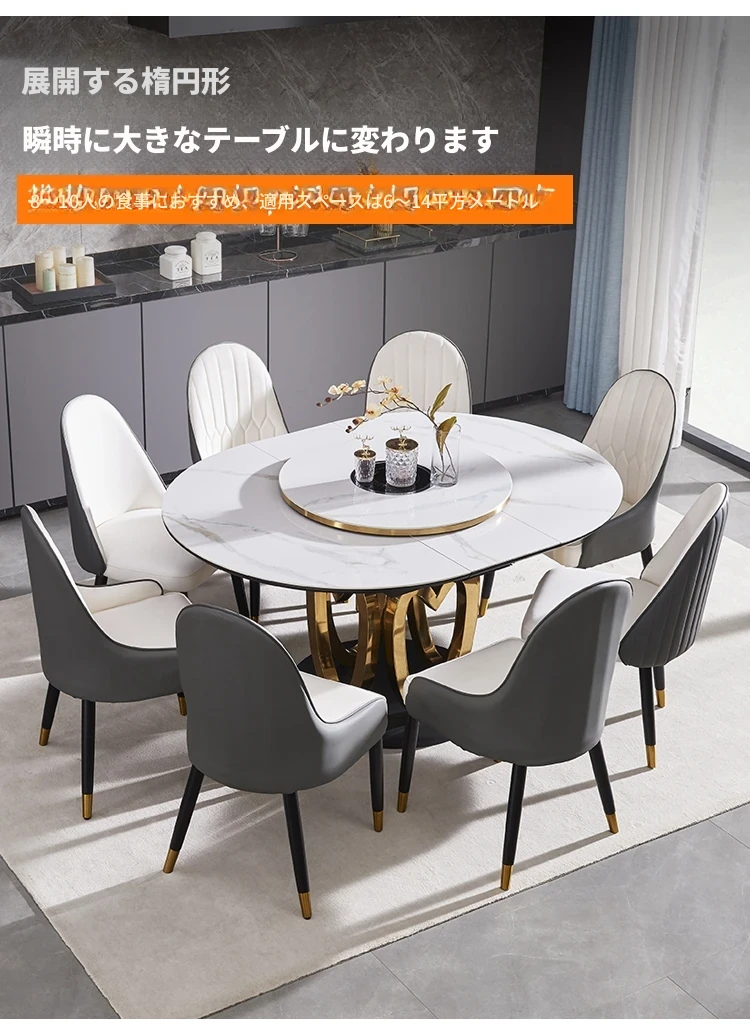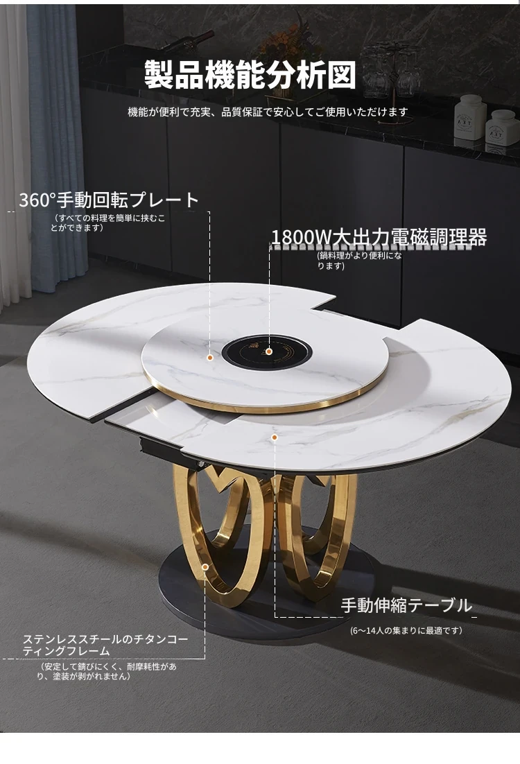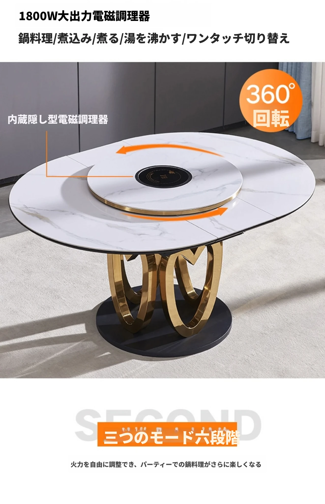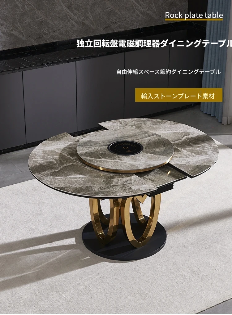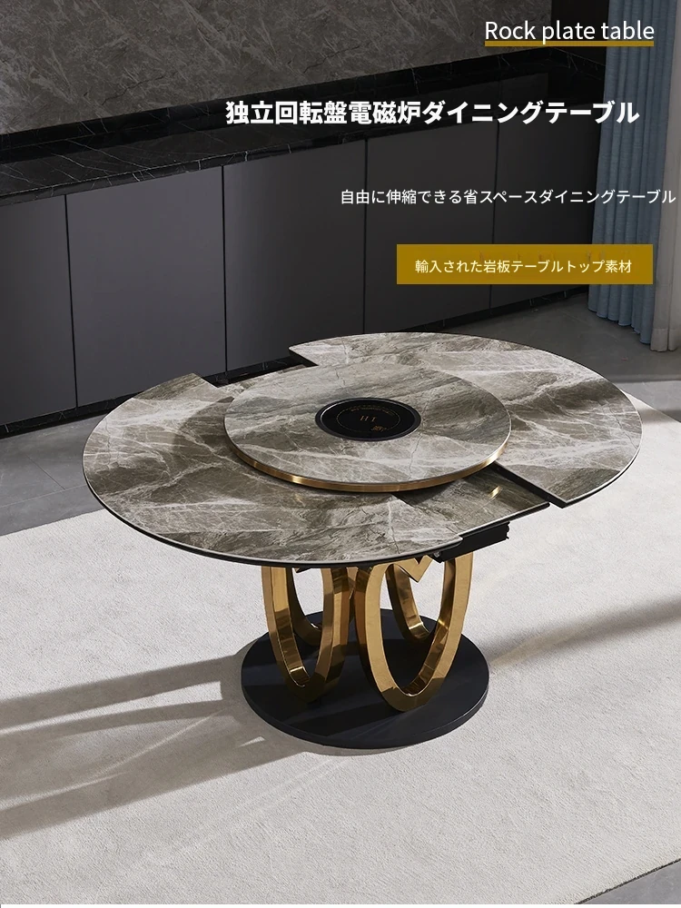 エレガントな楕円形ロックプレートダイニングテーブル - 回転式、伸縮可能、軽やかな贅沢感を演出する多機能鍋テーブル、電磁調理器付きで楽しい食事体験を提供!