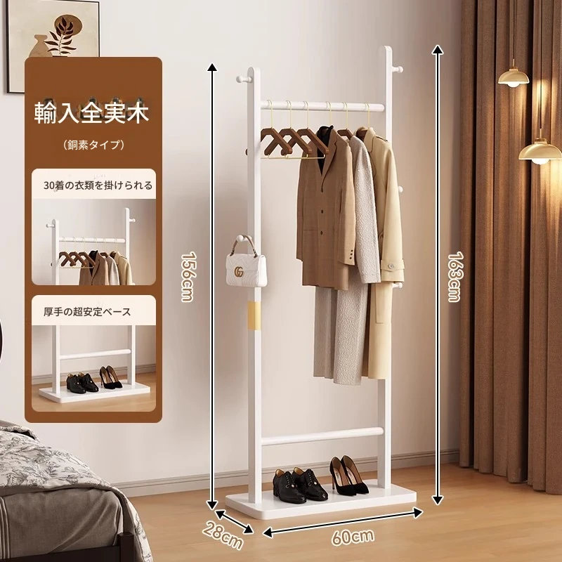 【輸入全ての無垢材-オリジナルデザイン】ホワイト【60着の衣類を掛けることができます】