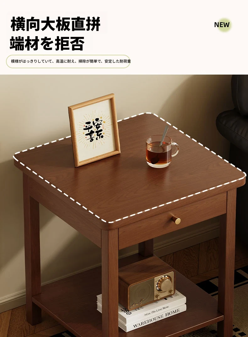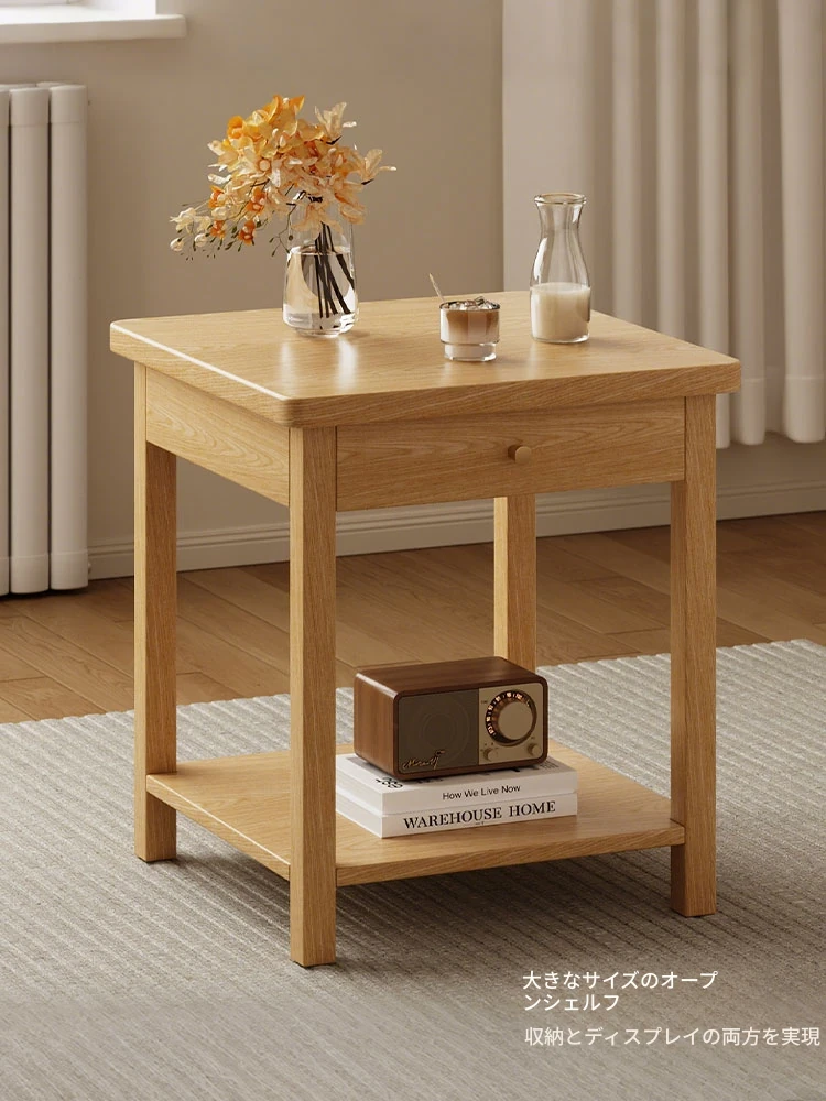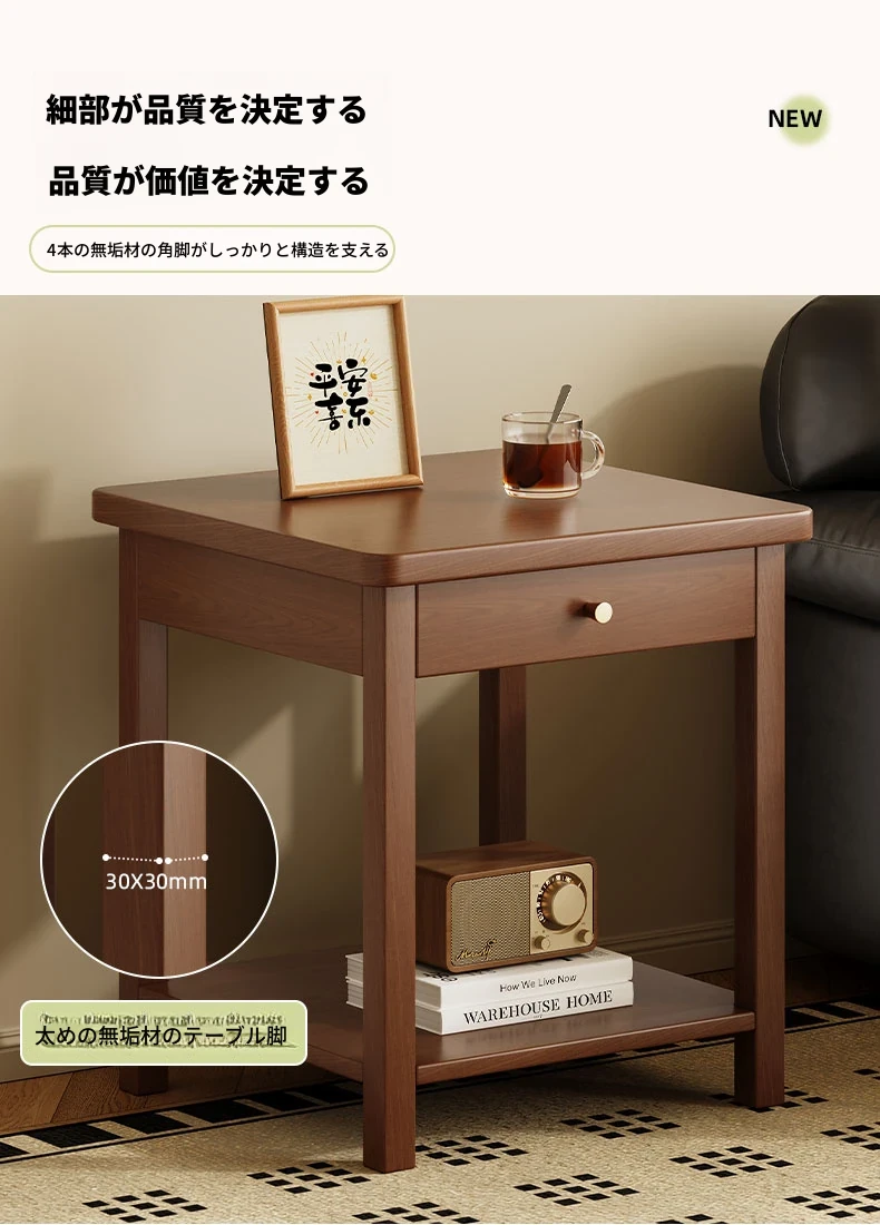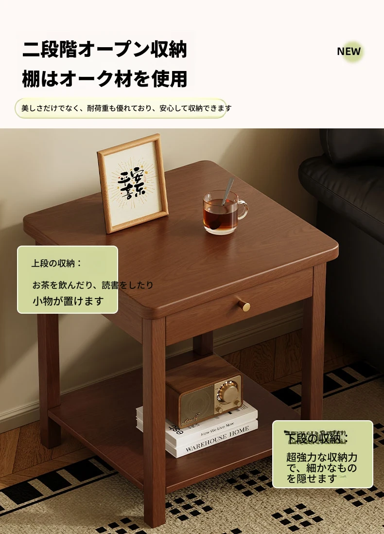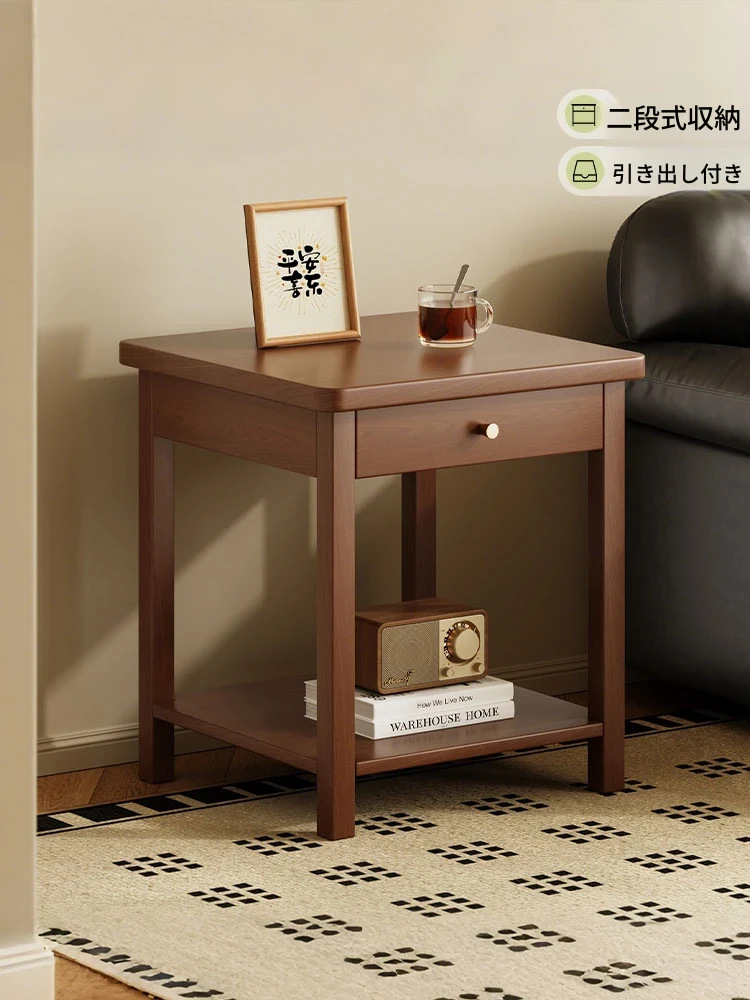 無垢材の小さなサイドテーブル - ソファ横にぴったり!収納力抜群のティーテーブル、リビングのアクセントに。ベッドサイドや中古風のインテリアにも最適なシンプルでおしゃれなデザイン。