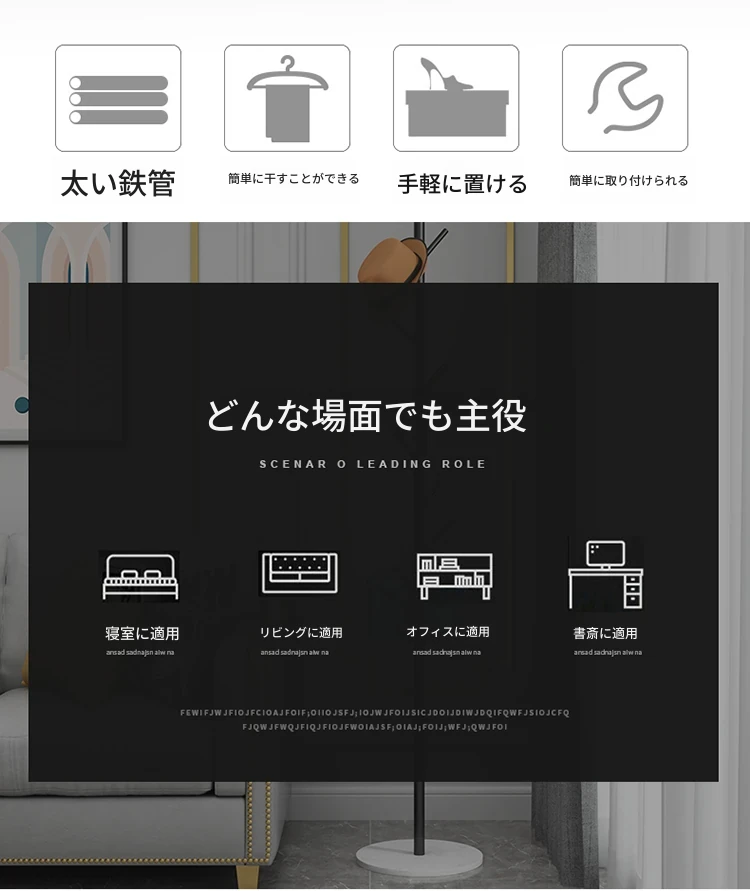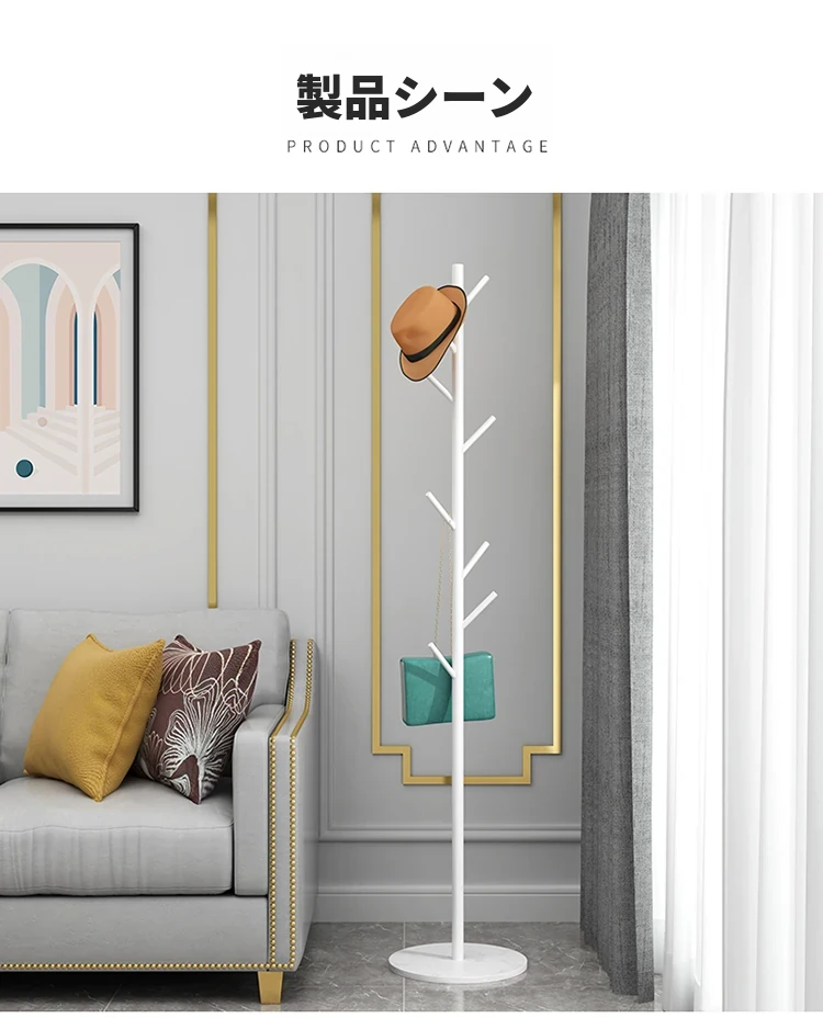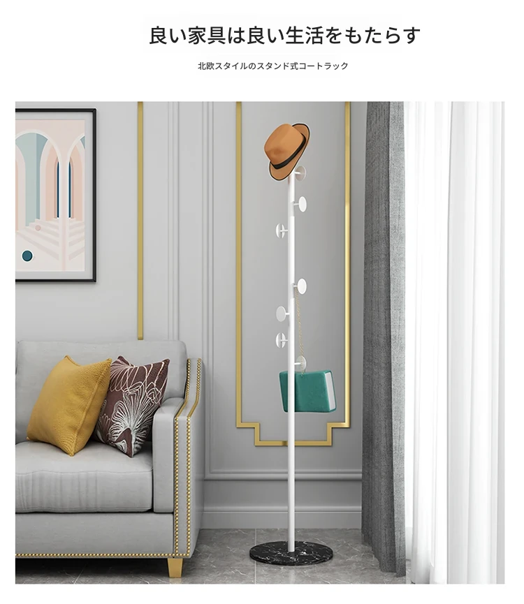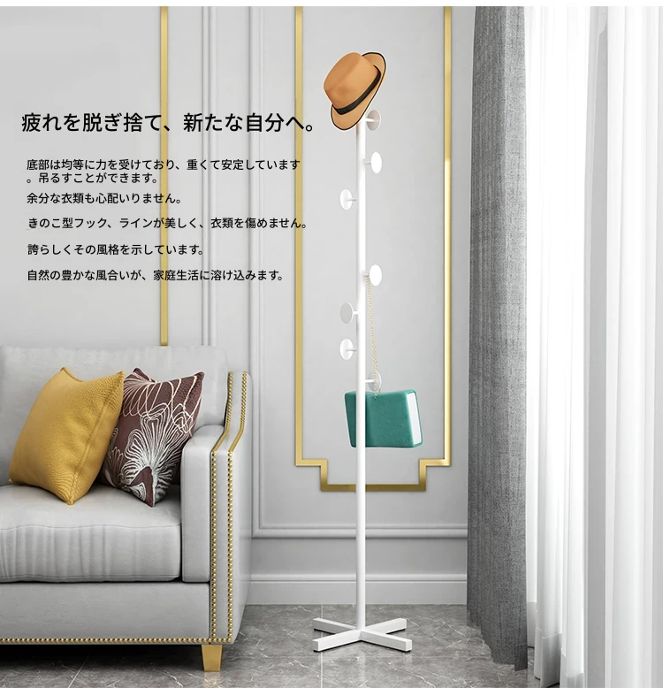 北欧風のシンプルでスタイリッシュなフロアコートハンガー - リビングや寝室にぴったりの軽やかなデザインで、衣類をしっかり支えます。おしゃれなインテリアのアクセントにも最適!