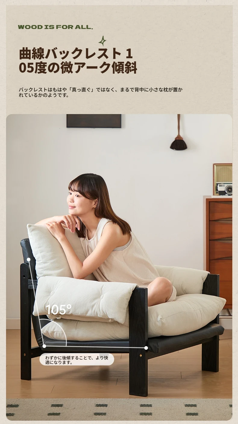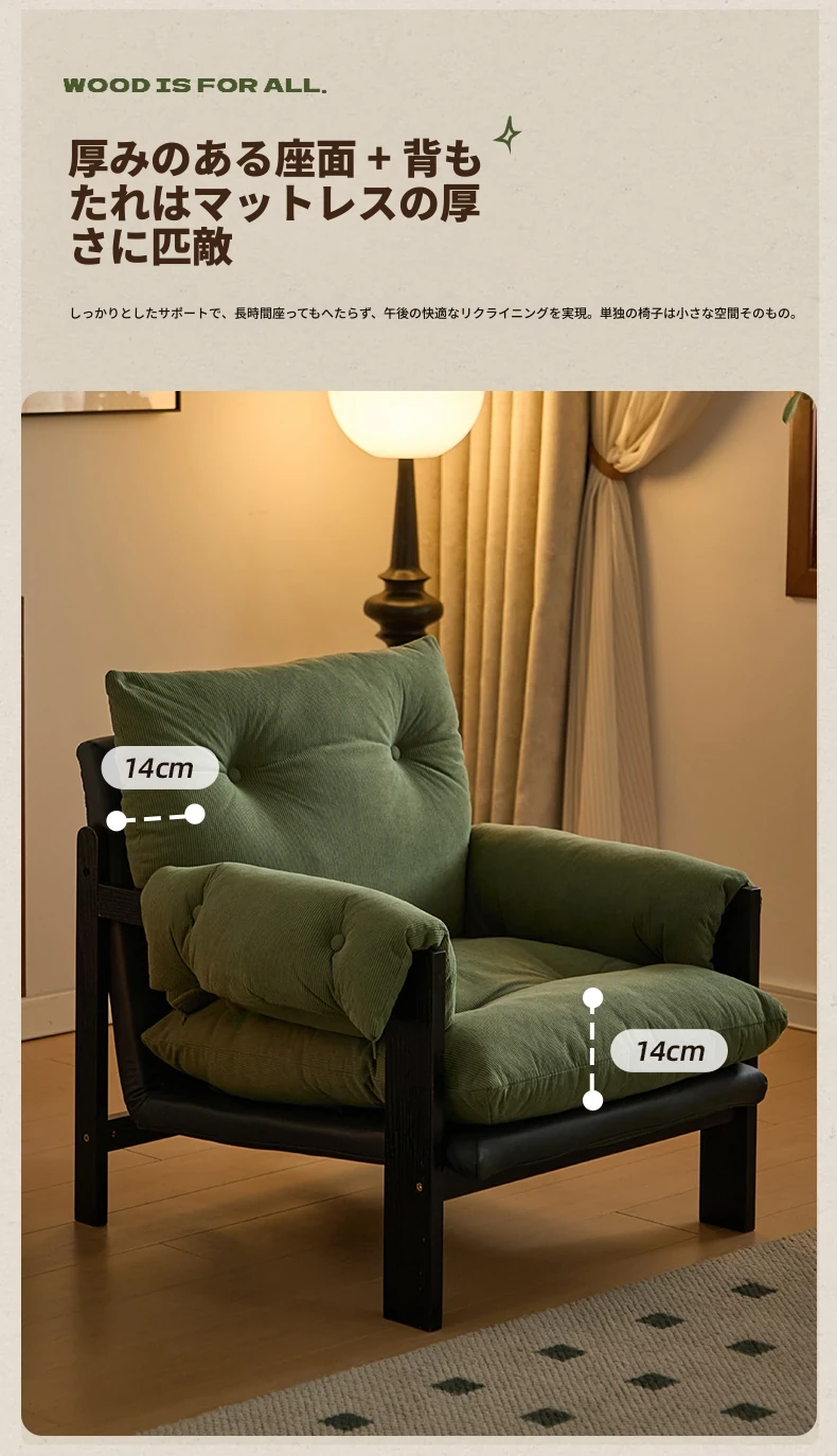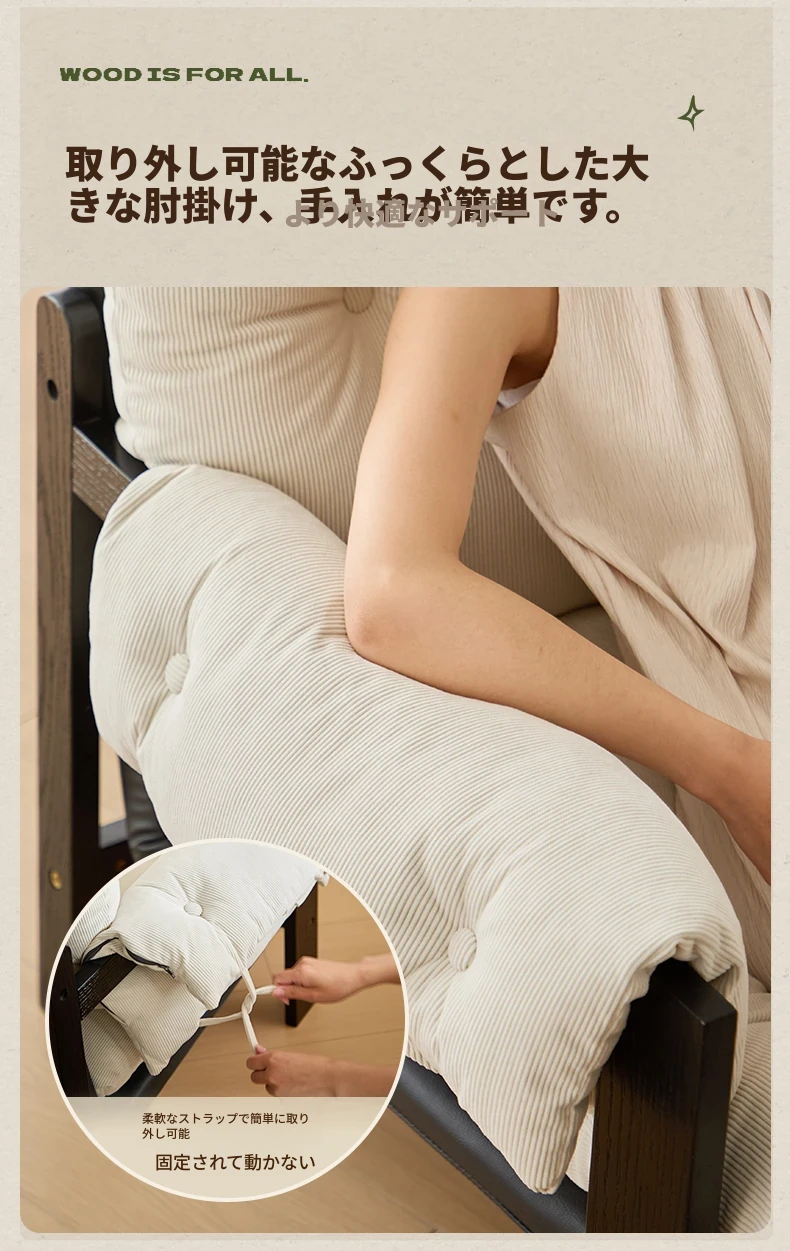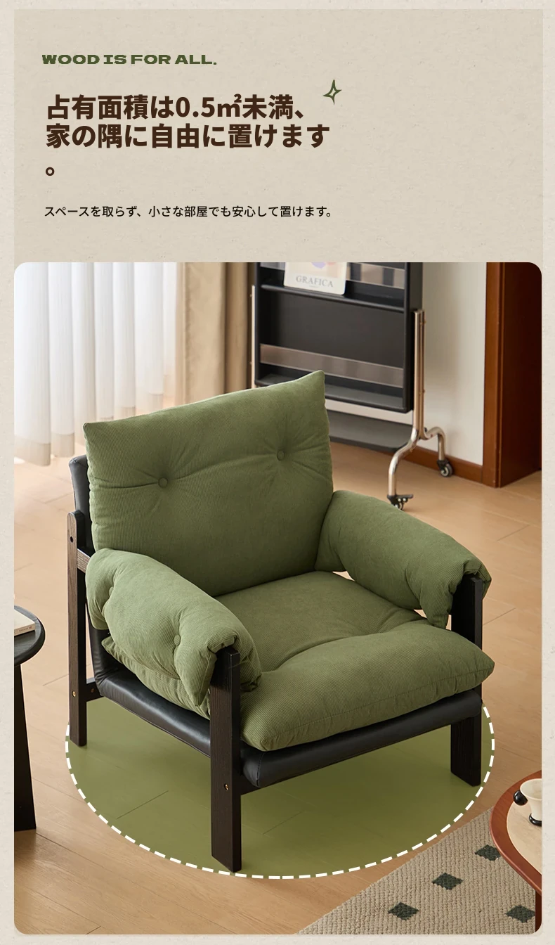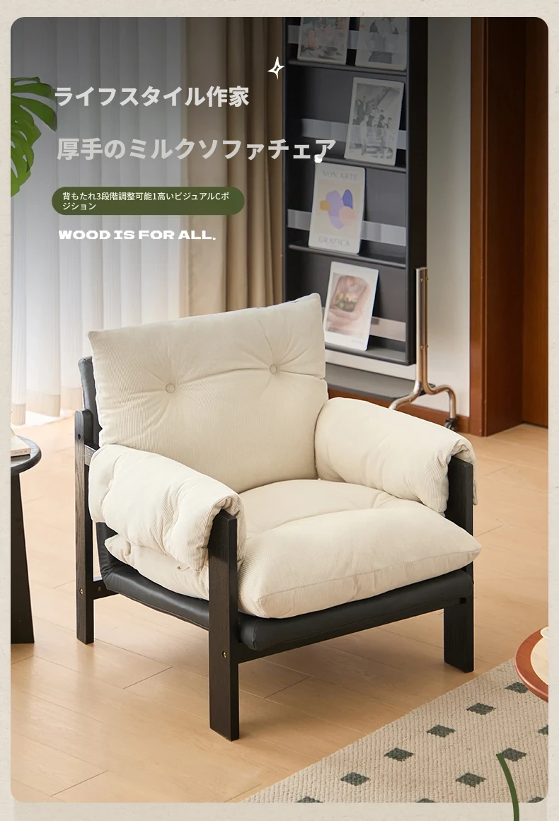 ふかふかの厚いクッション付き!リビングにぴったりな無垢材の一人掛けソファチェア。リラックスできる家庭用の怠け者ソファ、バルコニーや寝室にも最適な背もたれ付きチェア。快適なひとときをお楽しみください!
