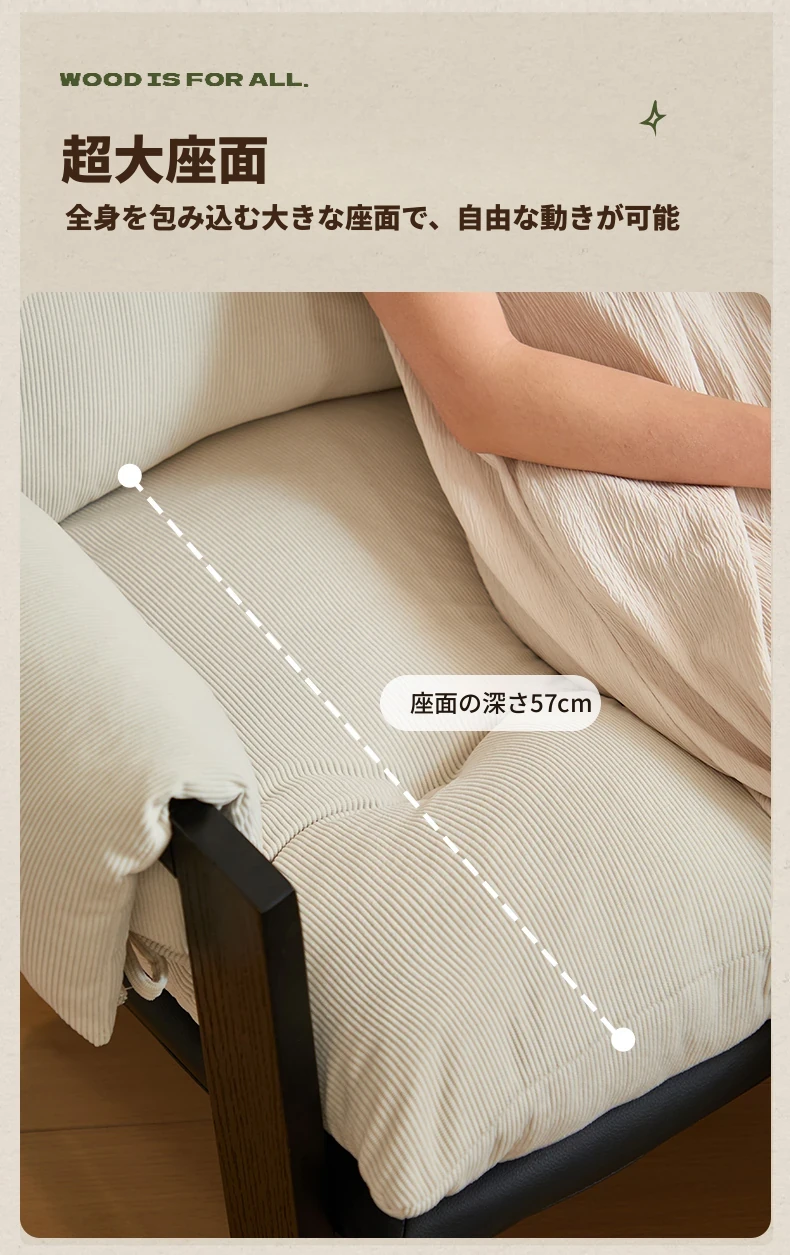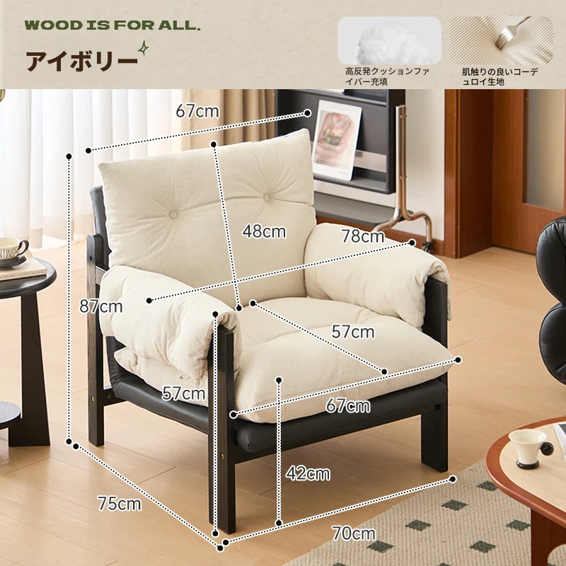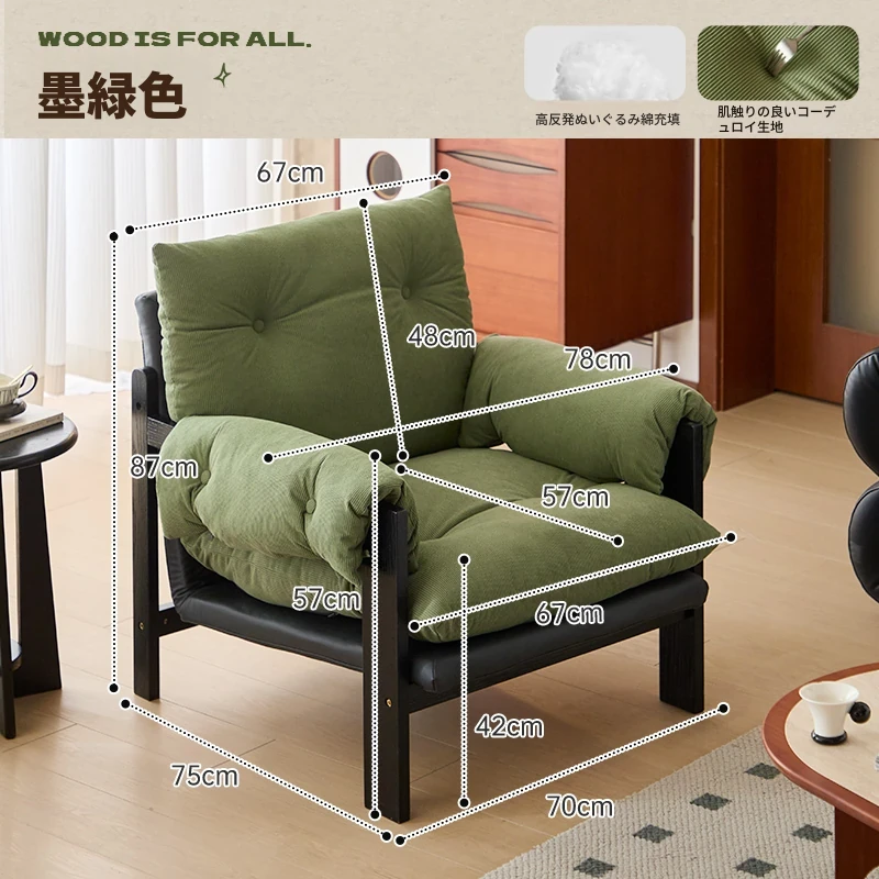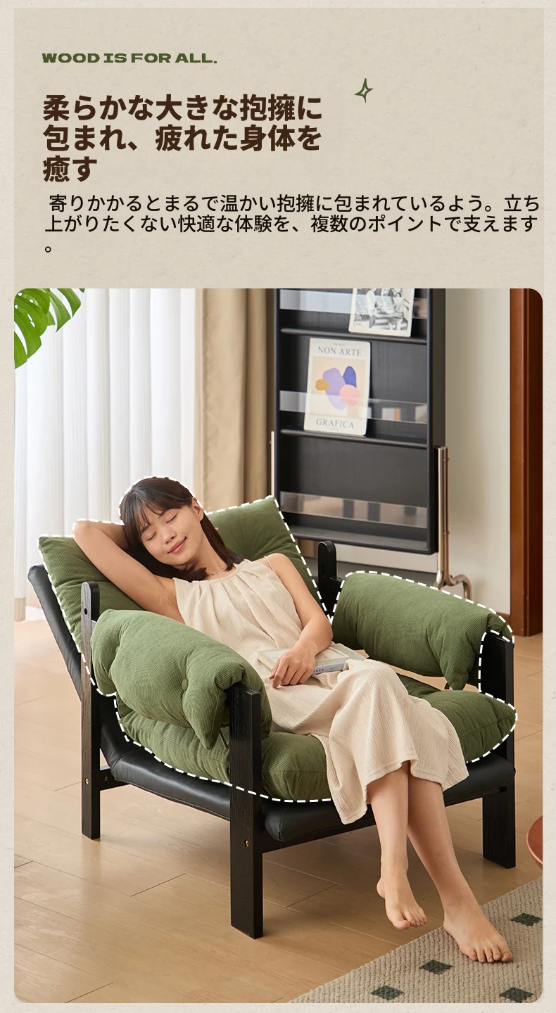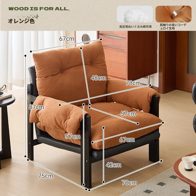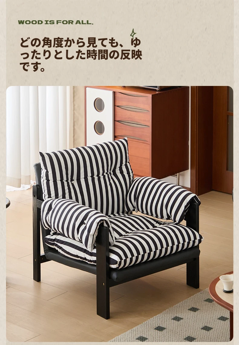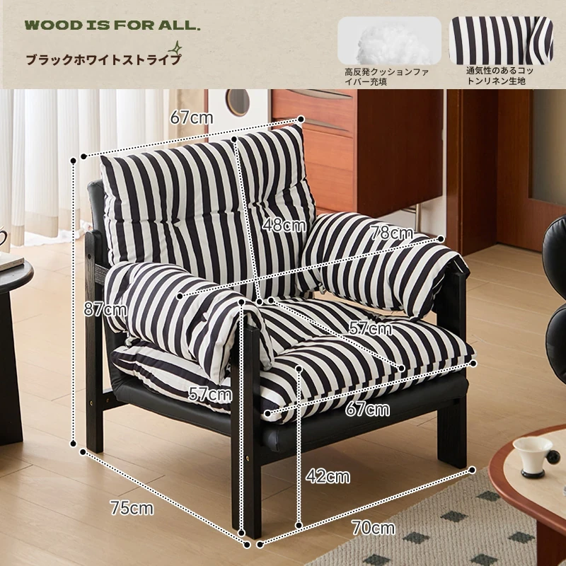 ふかふかの厚いクッション付き!リビングにぴったりな無垢材の一人掛けソファチェア。リラックスできる家庭用の怠け者ソファ、バルコニーや寝室にも最適な背もたれ付きチェア。快適なひとときをお楽しみください!