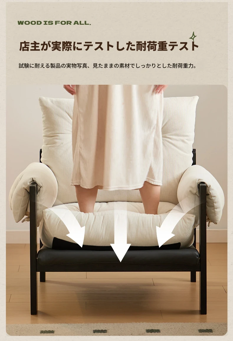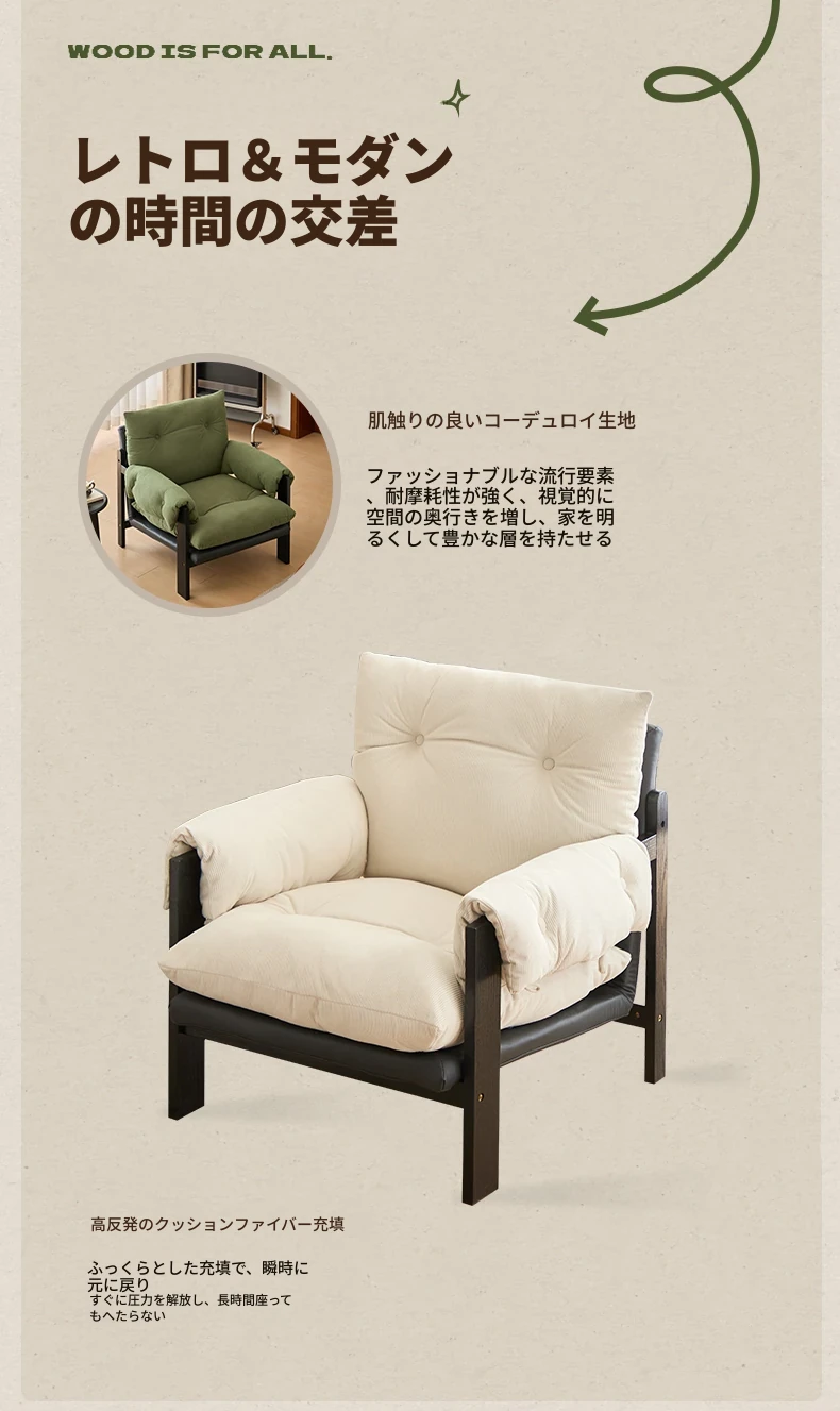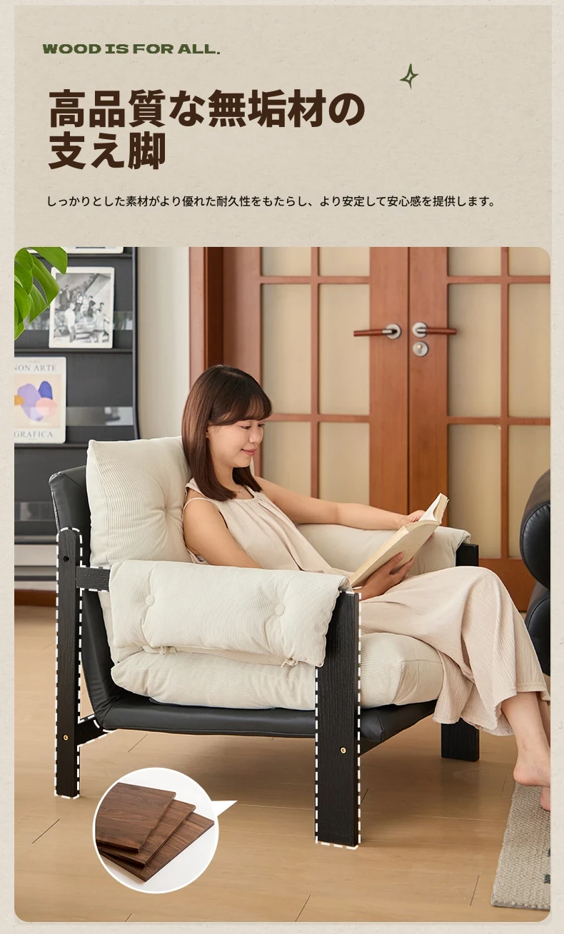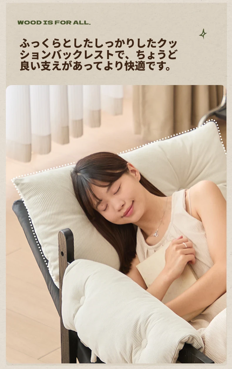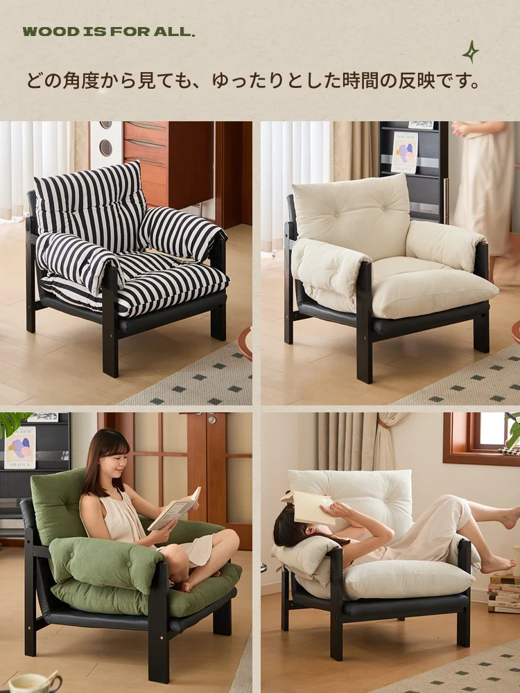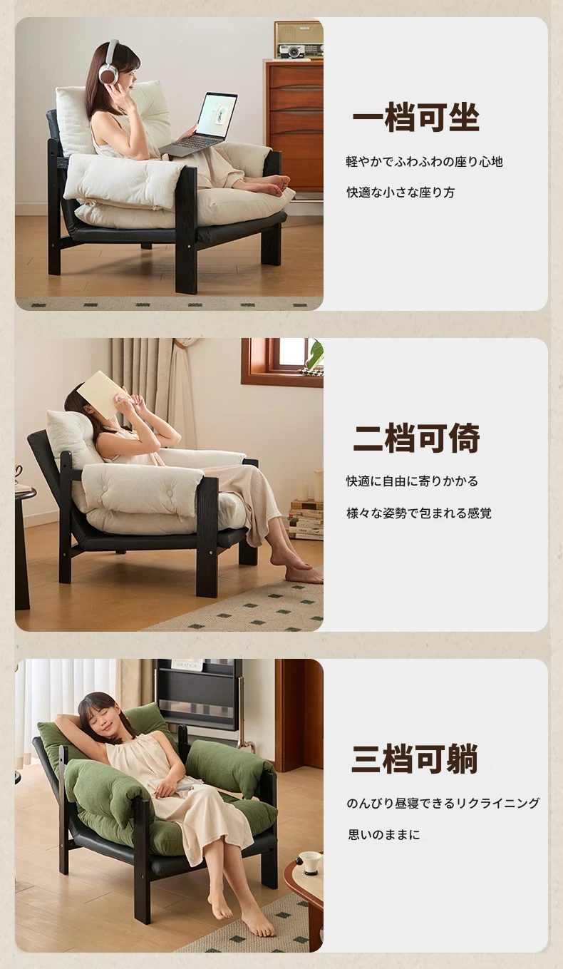 ふかふかの厚いクッション付き!リビングにぴったりな無垢材の一人掛けソファチェア。リラックスできる家庭用の怠け者ソファ、バルコニーや寝室にも最適な背もたれ付きチェア。快適なひとときをお楽しみください!
