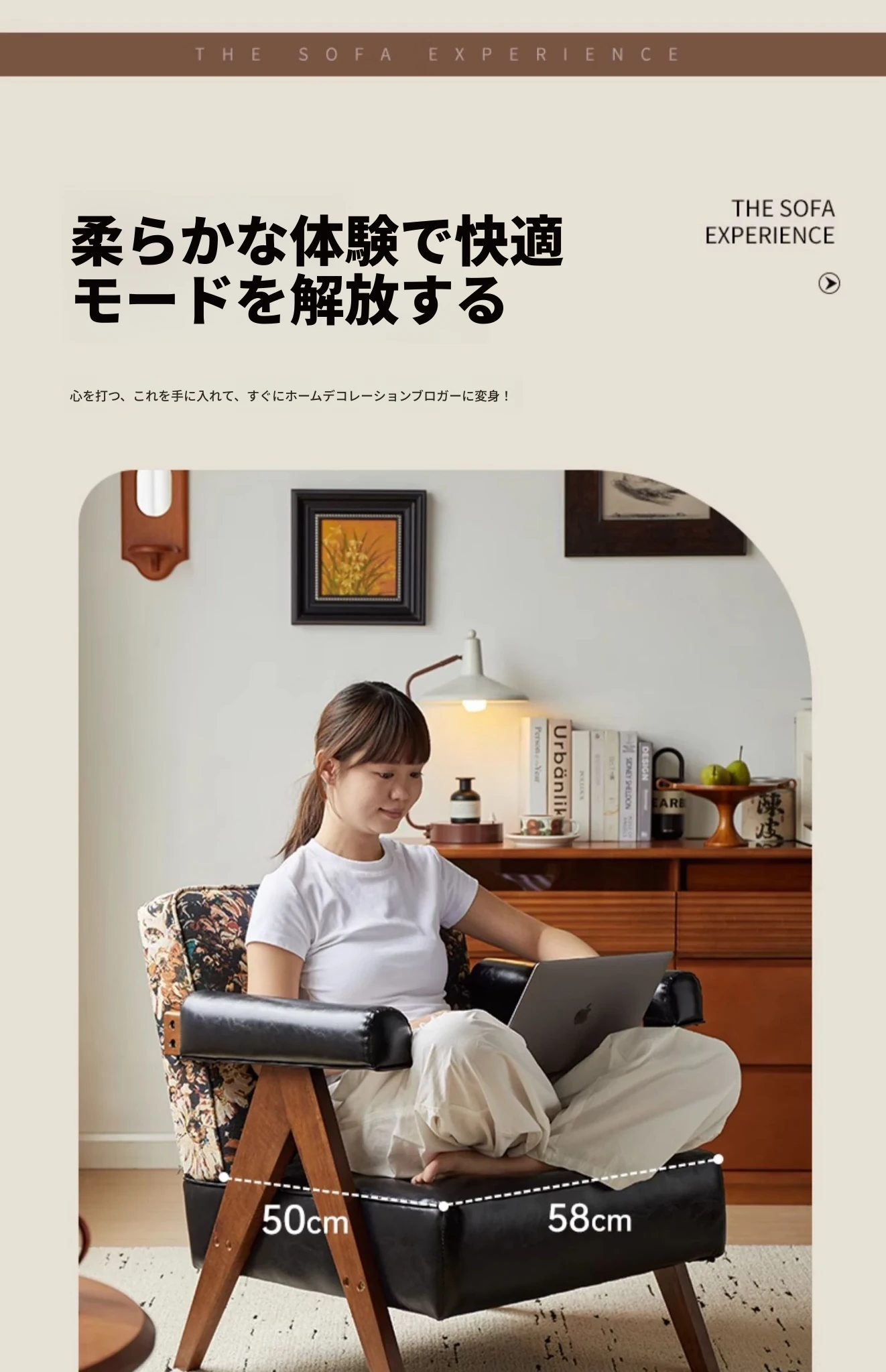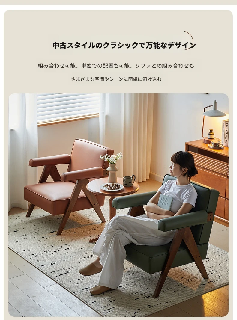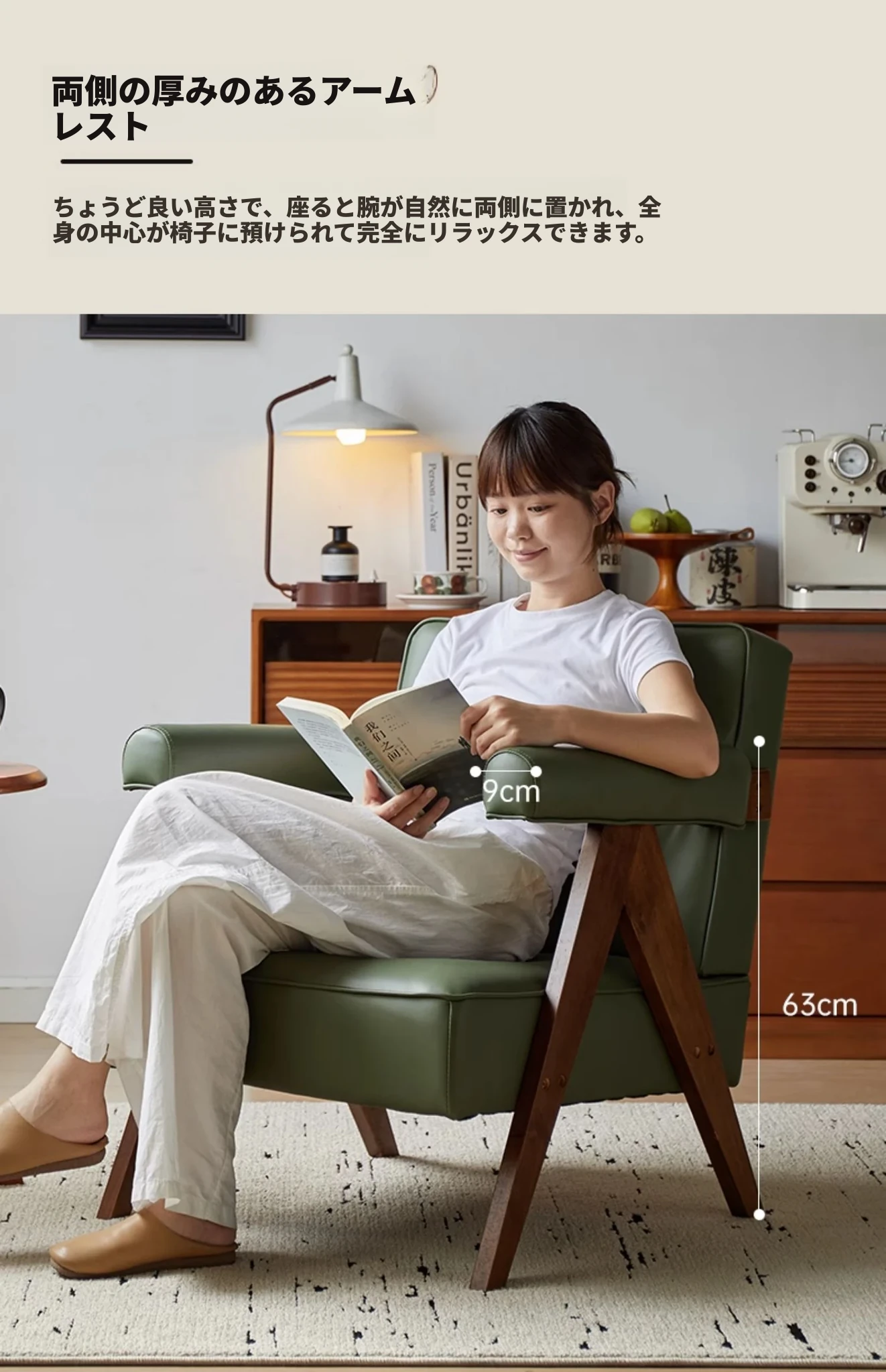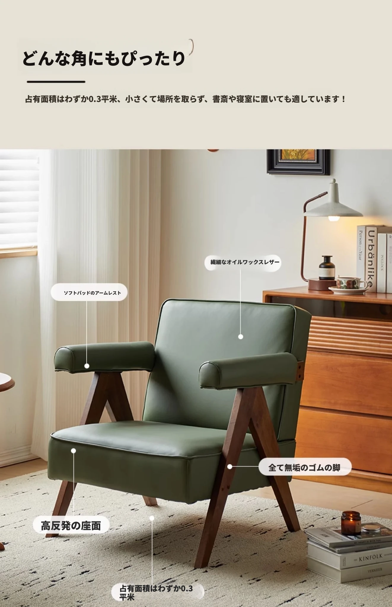 レトロな一人掛けソファ椅子 - 高級感漂う無垢材使用のリビング休憩椅子。ヴィンテージスタイルで、バルコニーにもぴったりな背もたれ付き。おしゃれで快適な空間を演出!